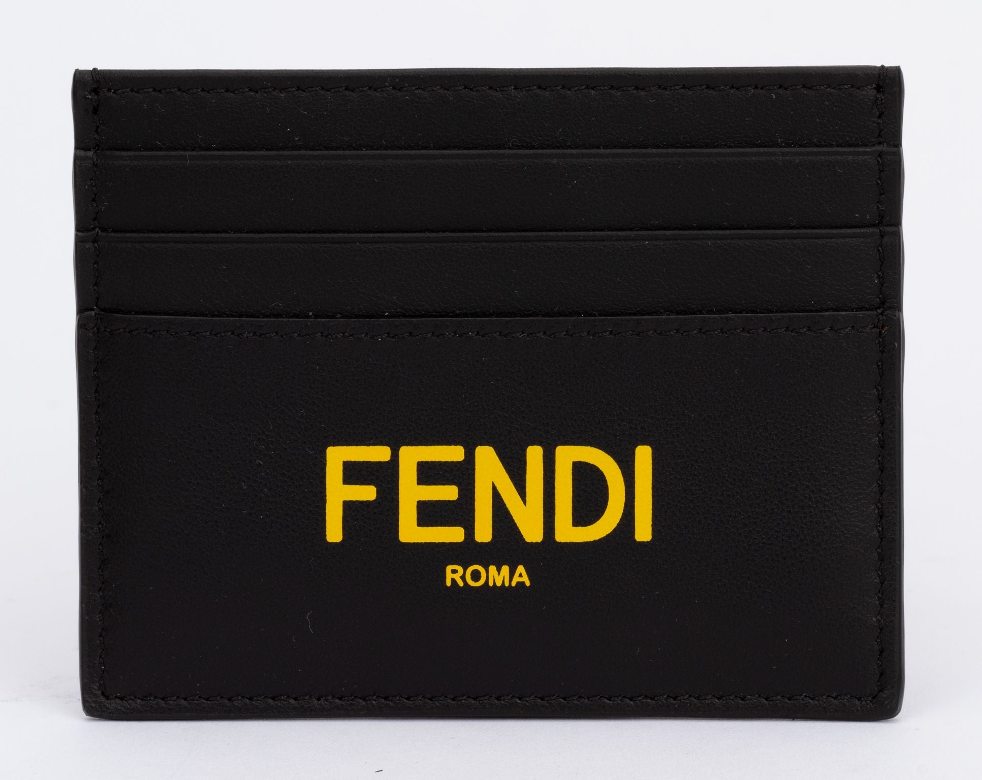 Fendi leather wallet in black. On the front Fendi is written in a bright yellow. The holder comes with 6 card departments. It is new and includes tag, booklet, original box and dust cover.