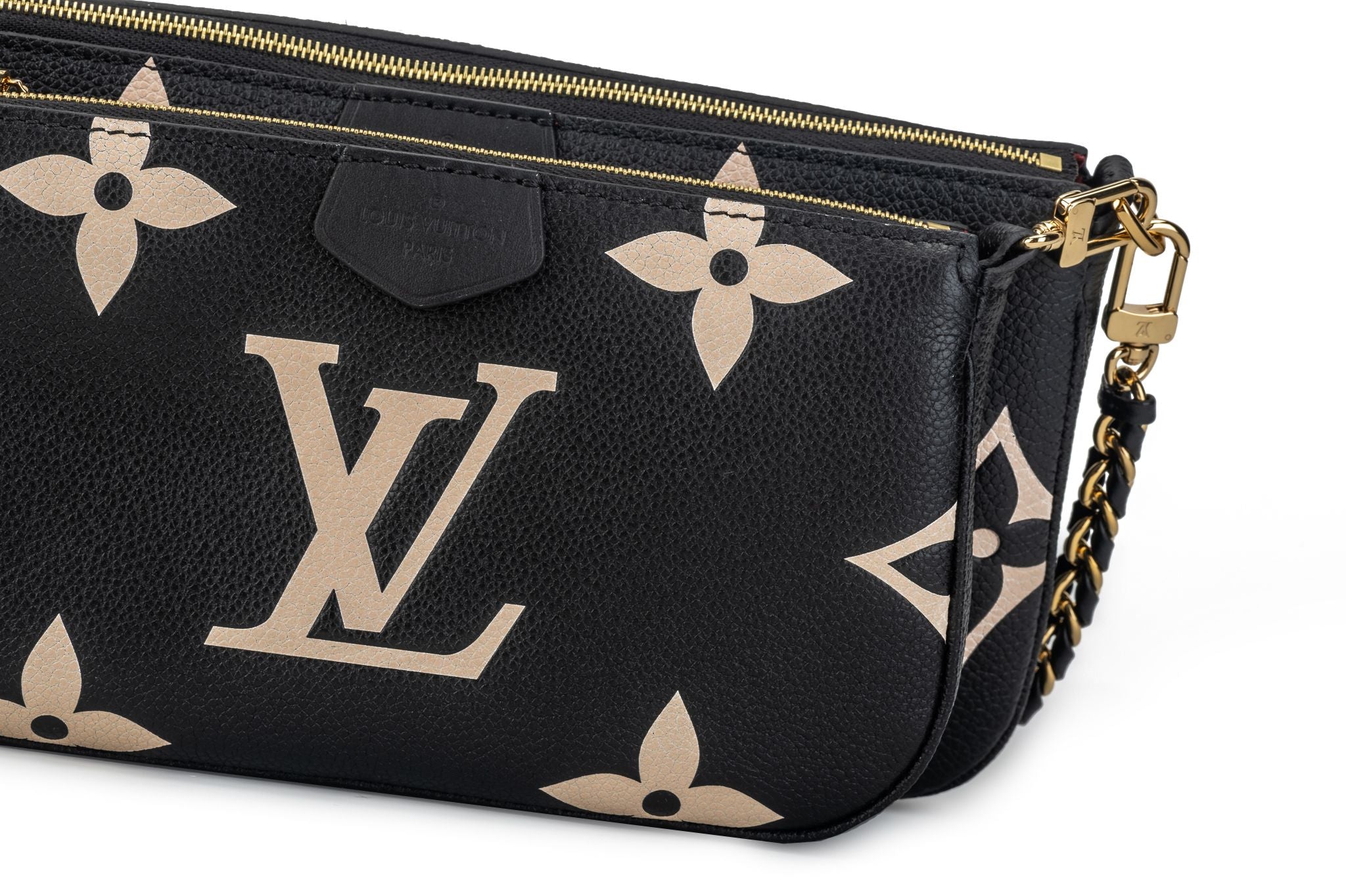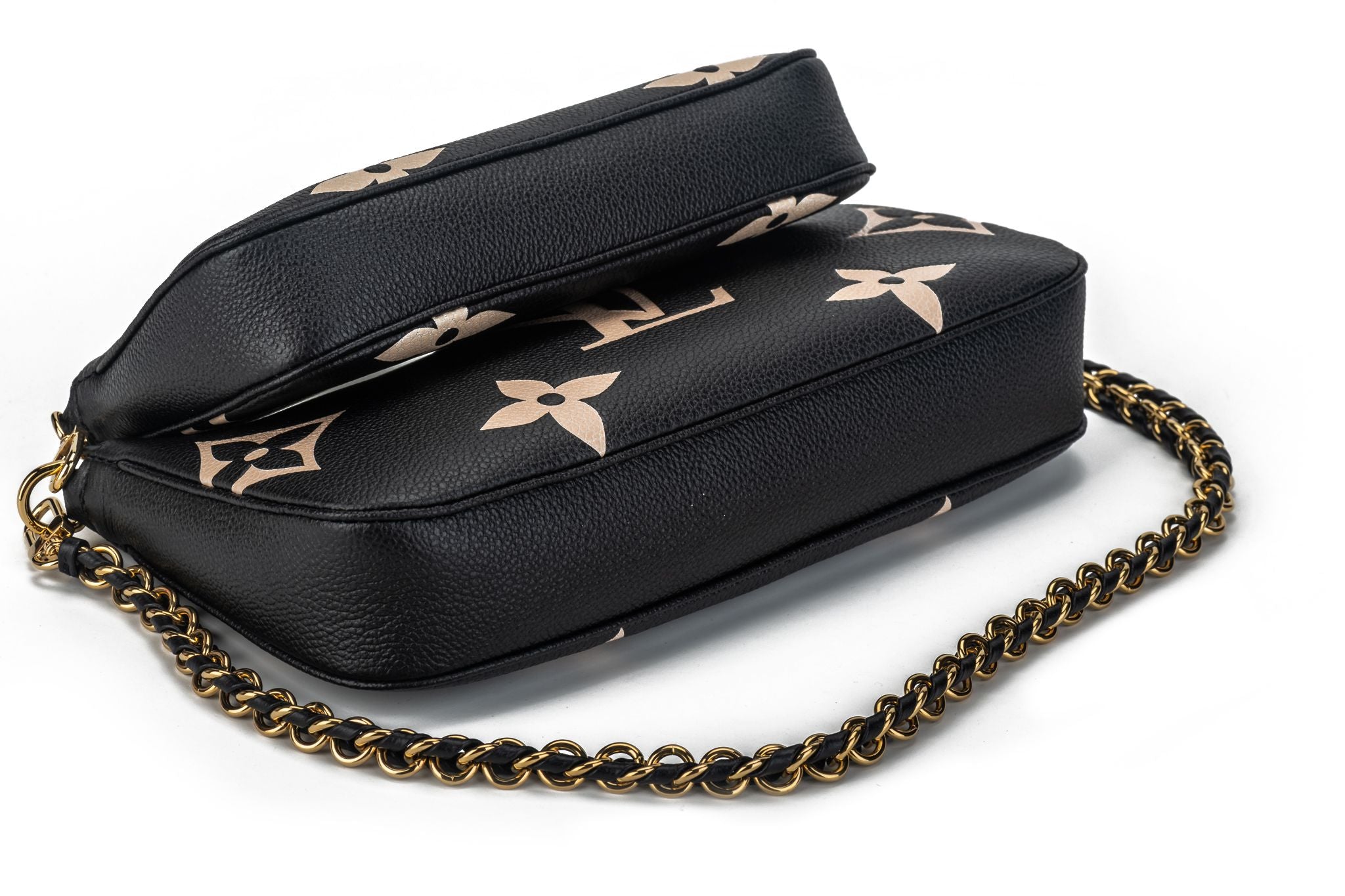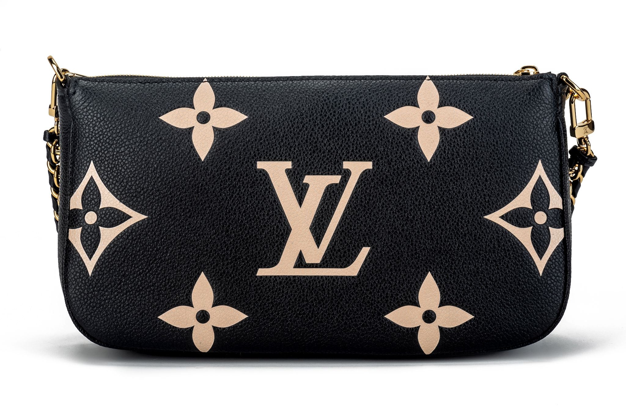 Louis Vuitton leather monogram embossed multi pochette, black with blush inserts with gold tone hardware. Can be worn three ways, separating the two bags and alternating the straps. Brand new with dust cover and original box.