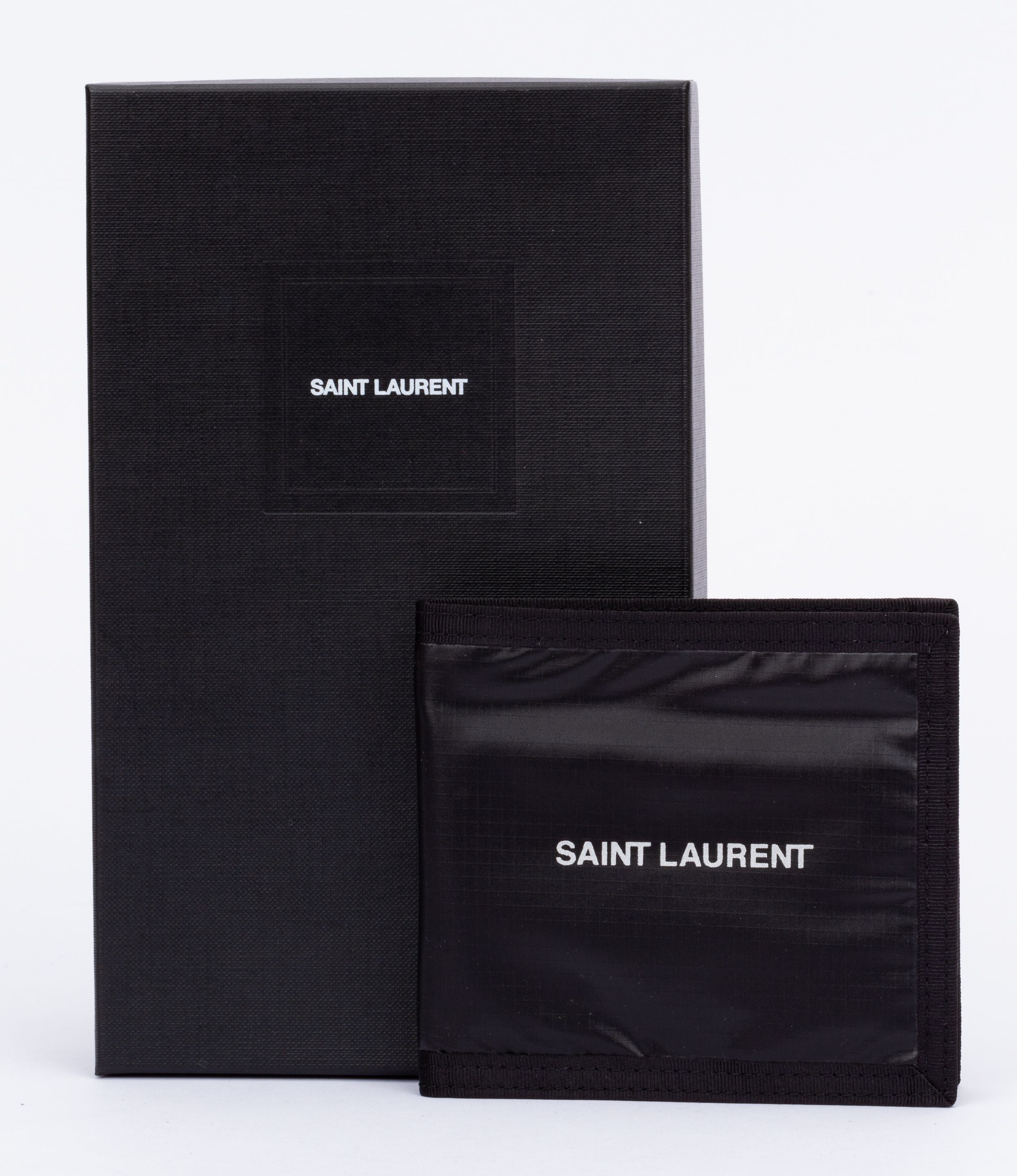 Yves Saint Laurent brand new bifold wallet in black technical fabric. Includes original box and dust cover.