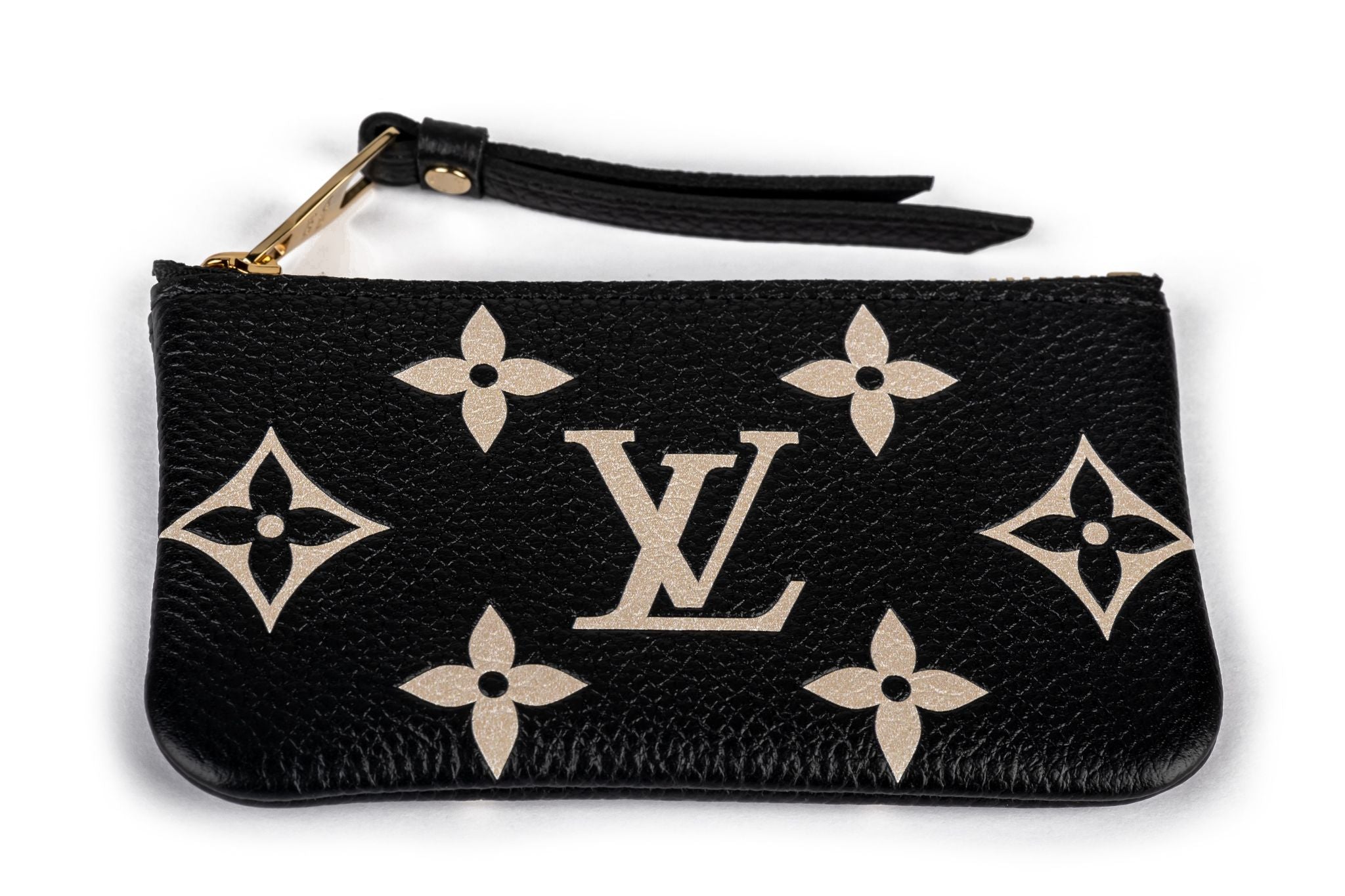 The Louis Vuitton Empreinte Monogram Giant Key Pouch in black is a chic and very practical accessory, crafted of Louis Vuitton monogram-embossed calfskin leather in black and beige. The polished gold snap opens the crossover flap to a matching leather interior with a D-ring clasp.