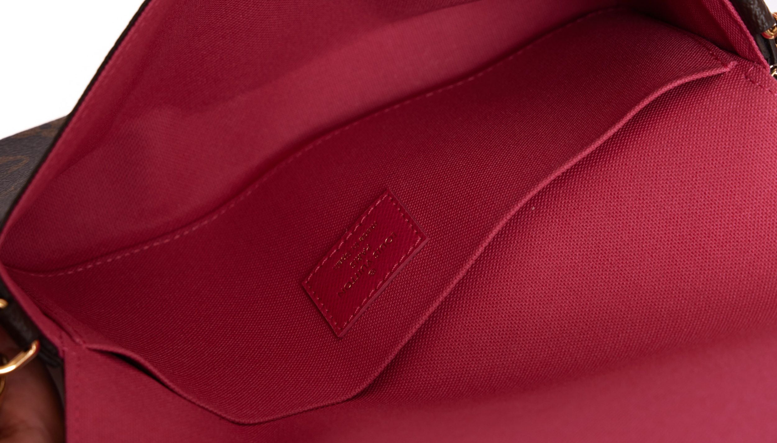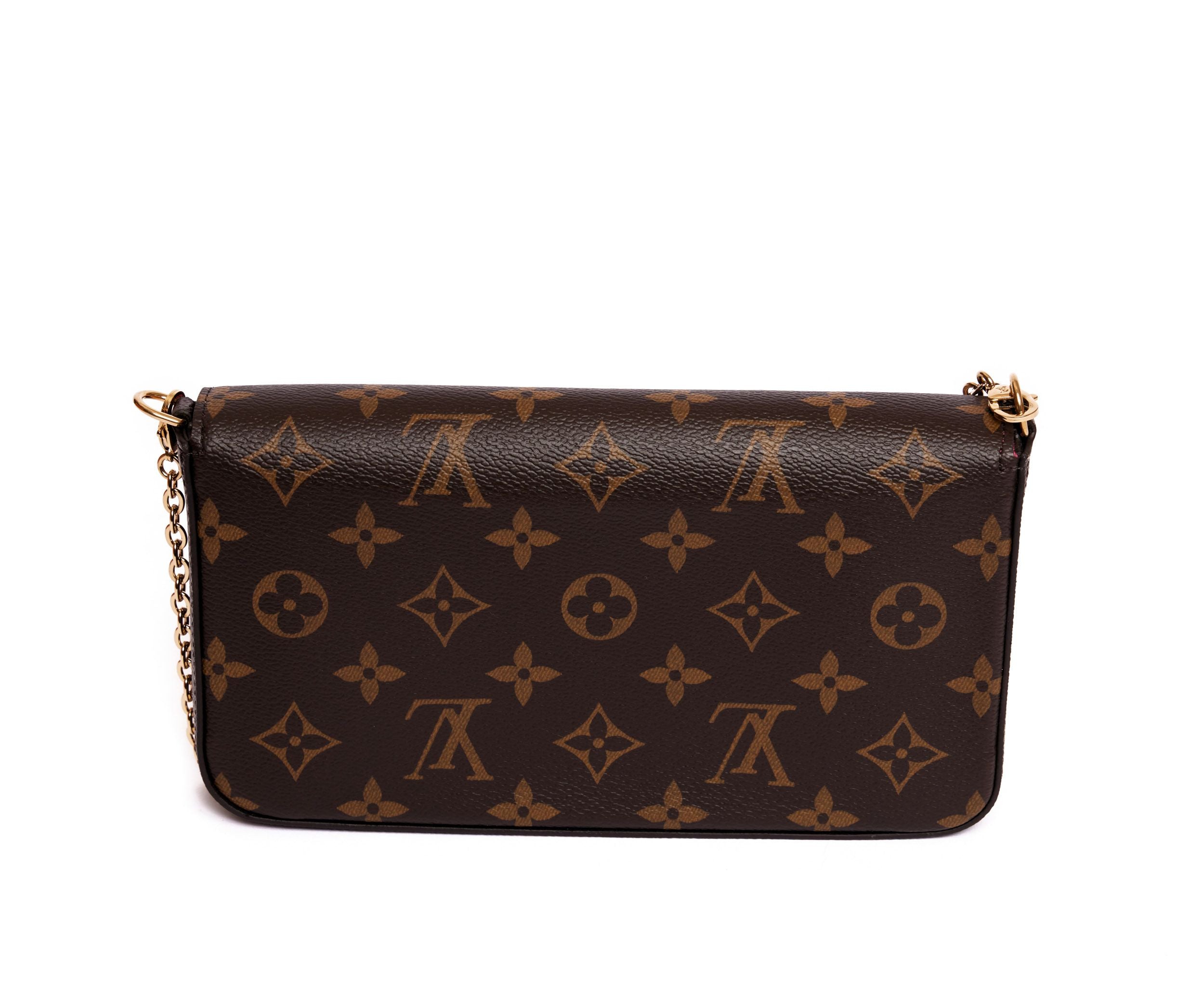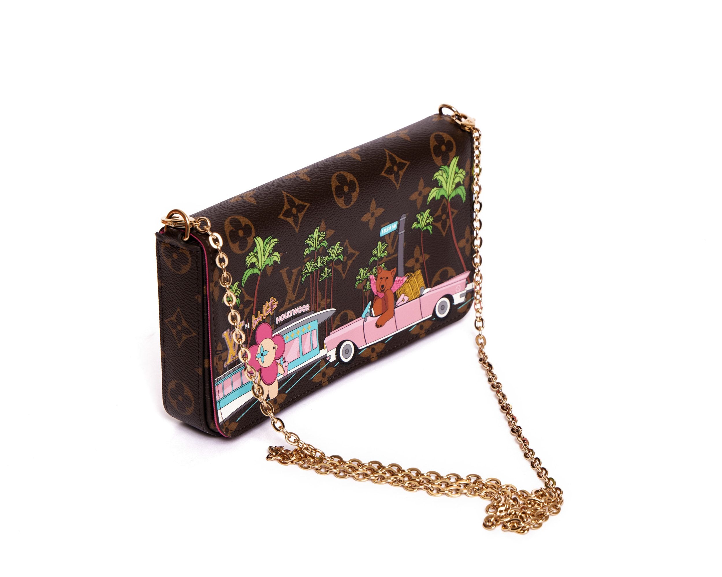 Louis Vuitton Brown and multicolor painted Coated Canvas Hollywood Limited Editio pochette with pink cotton lining. Inside a pink leather detachable credit card holder with 8 card slots and one compartment (L 7.5" x H 4") and a mini brown coated canvas detachable pochette with gold metal zip and pink leather lining (L 7.5" x H 4"). Detachable gold chain should strap (drop 23"). Comes with original box and dust cover