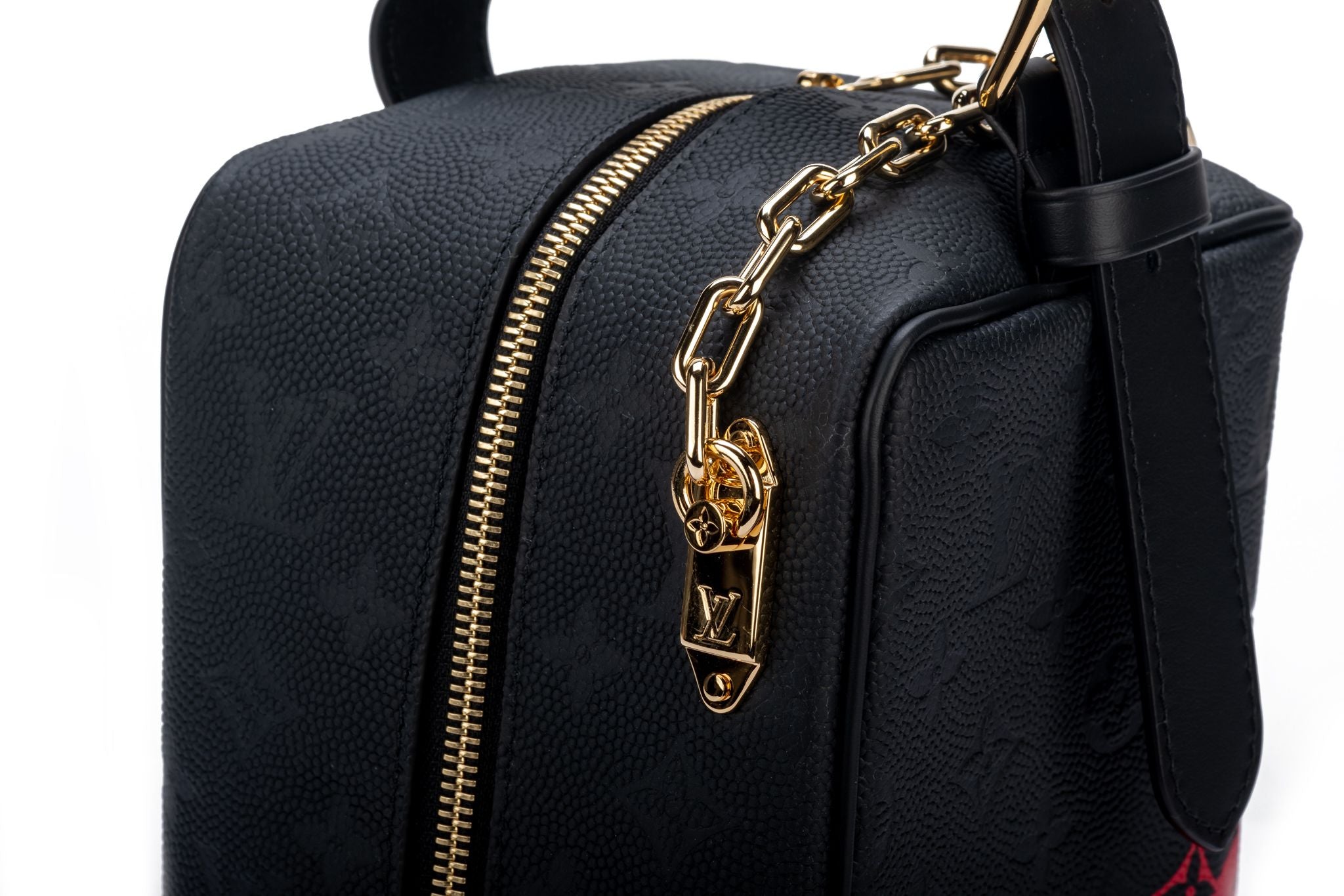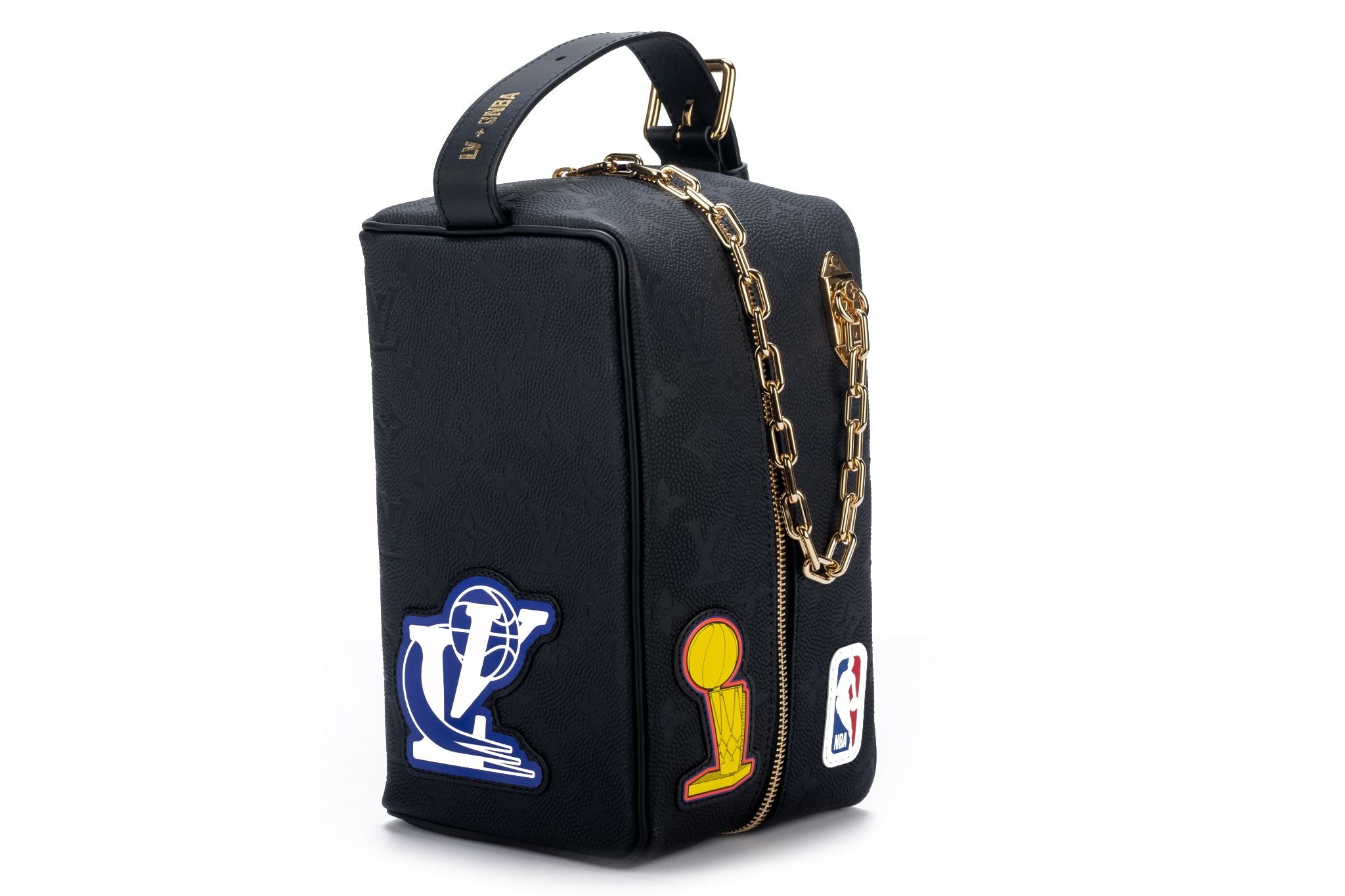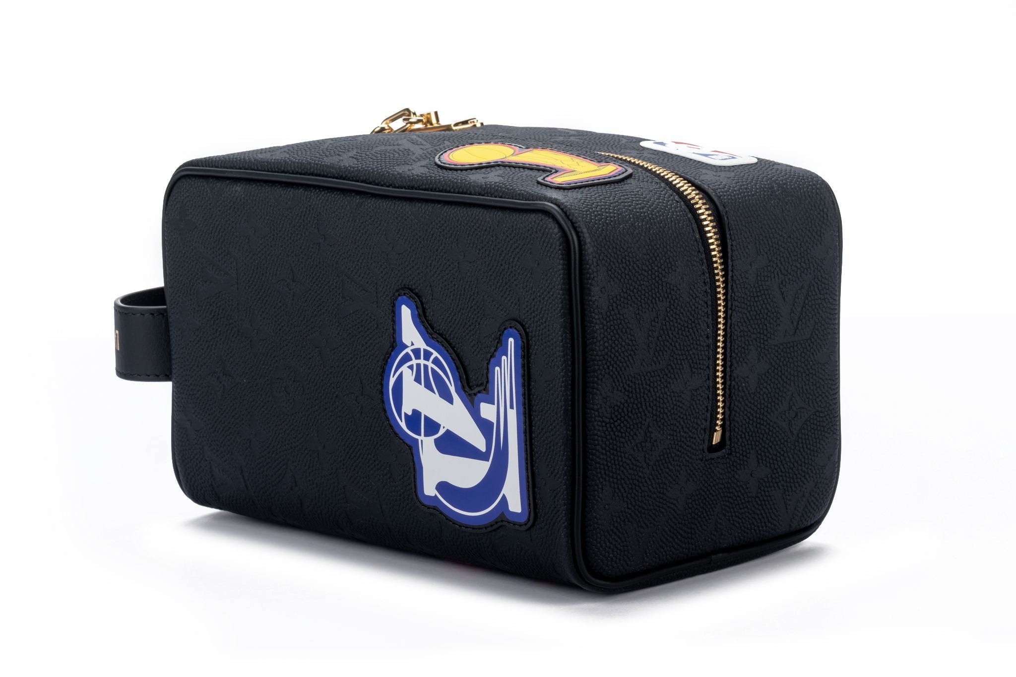 As part of the Louis Vuitton x NBA Season 2 capsule collection, the cloakroom dopp kit is made from black monogram-embossed leather and decorated with print and patches inspired by basketball championship jackets The adjustable leather handle (2.5' drop) allows hand carry but also means the dopp kit can be hung on a hook. The piece comes with the original dust cover and box.