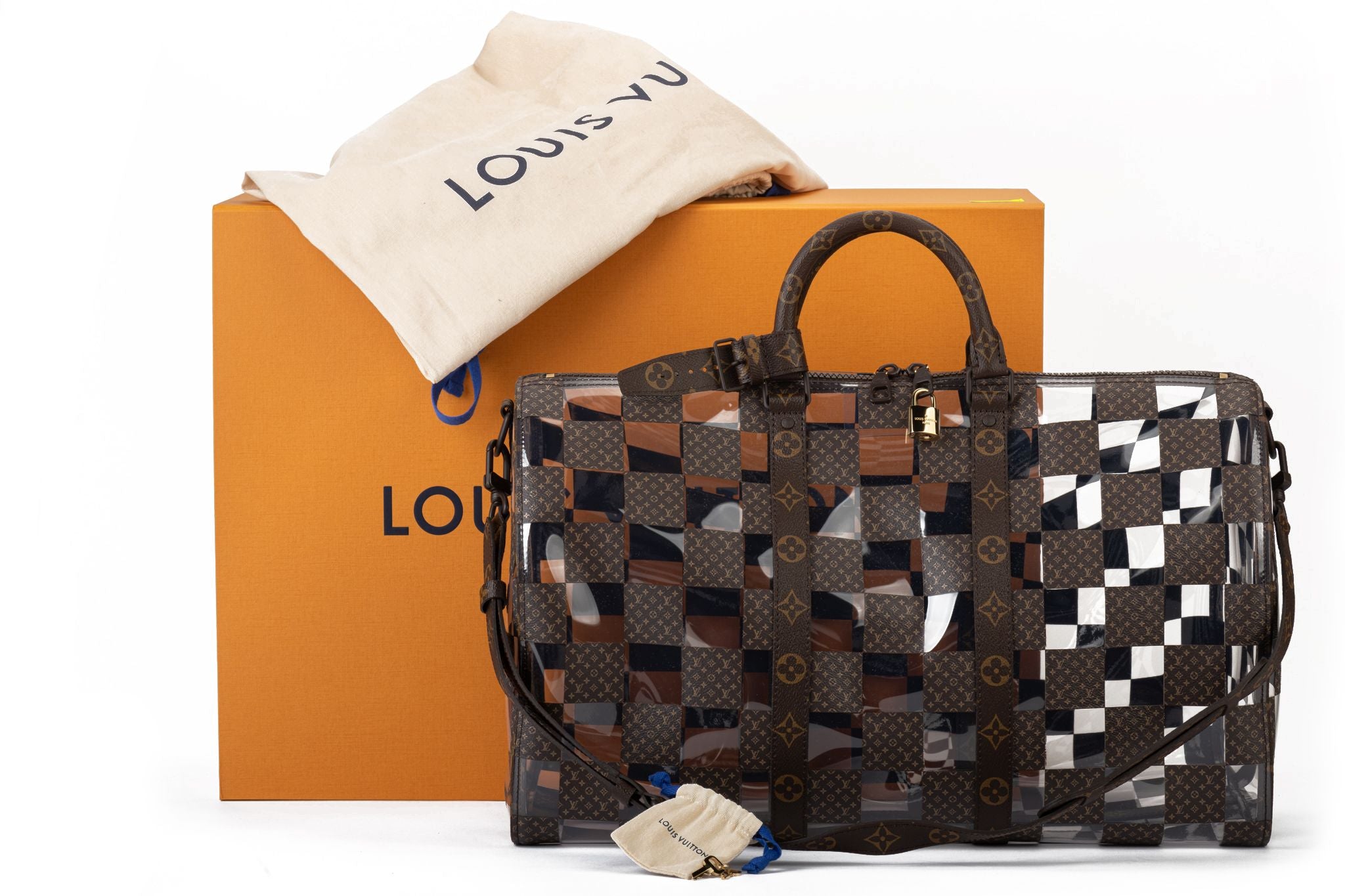 Louis Vuitton Fall Winter 2022 designed by Virgil Abloh, monogram chess keep all 50. Handle drop 4.5”. Shoulder strap drop 14”, adjustable. Comes with lock and 2 keys, name tag and additional bag holder. Original dust cover and box.