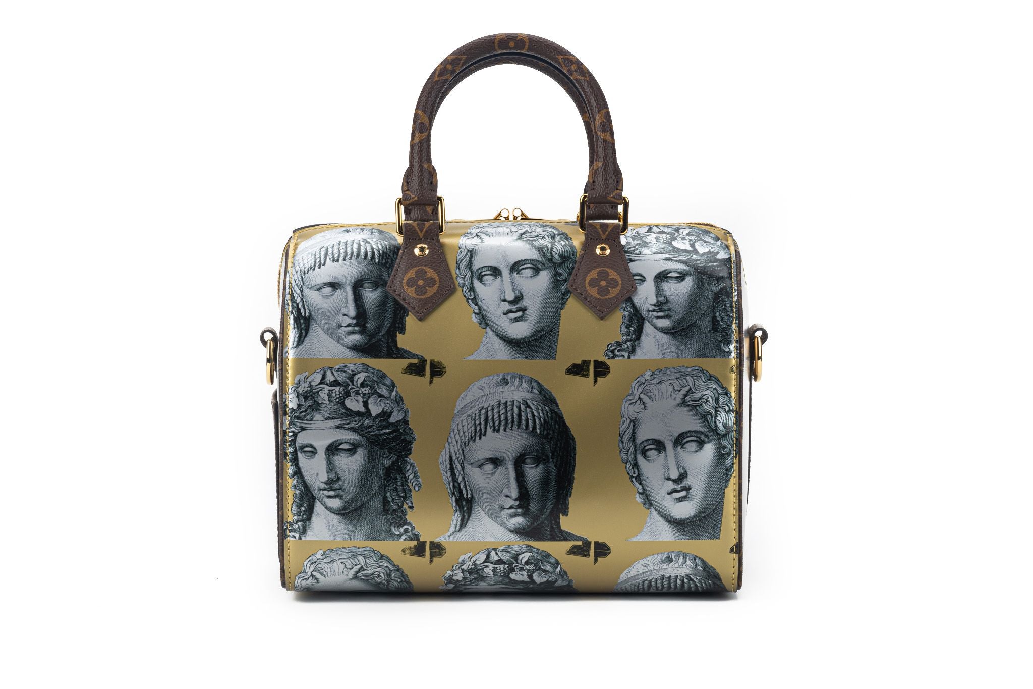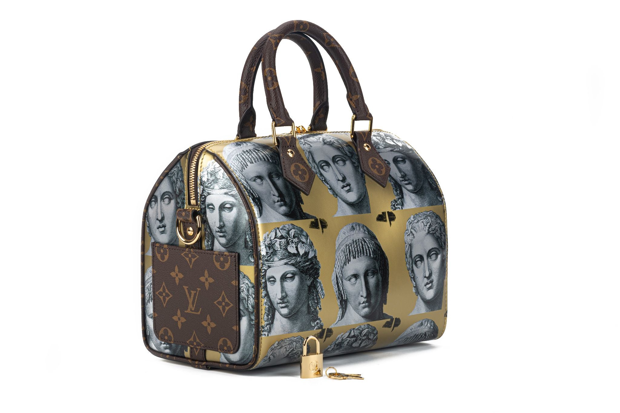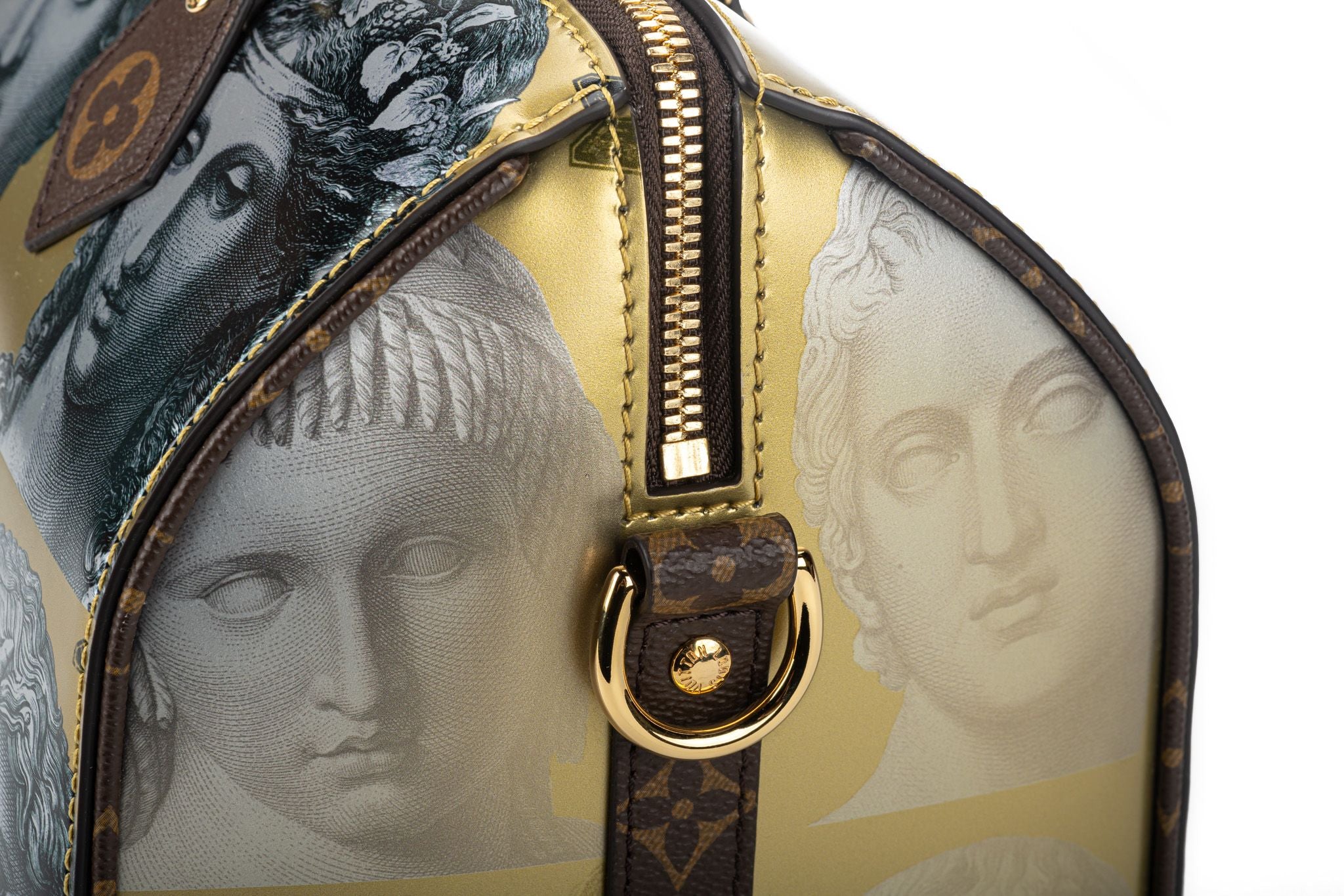 Louis Vuitton 2021 limited edition Fornasetti collection designed by Nicolas Ghesquière. Sold out worldwide speedy bandouliere 25 cm in printed patent leather, gold metal hardware and vuitton coated canvas monogram details.Detachable strap, lock and 2 keys. Brand new with box and original dust cover.