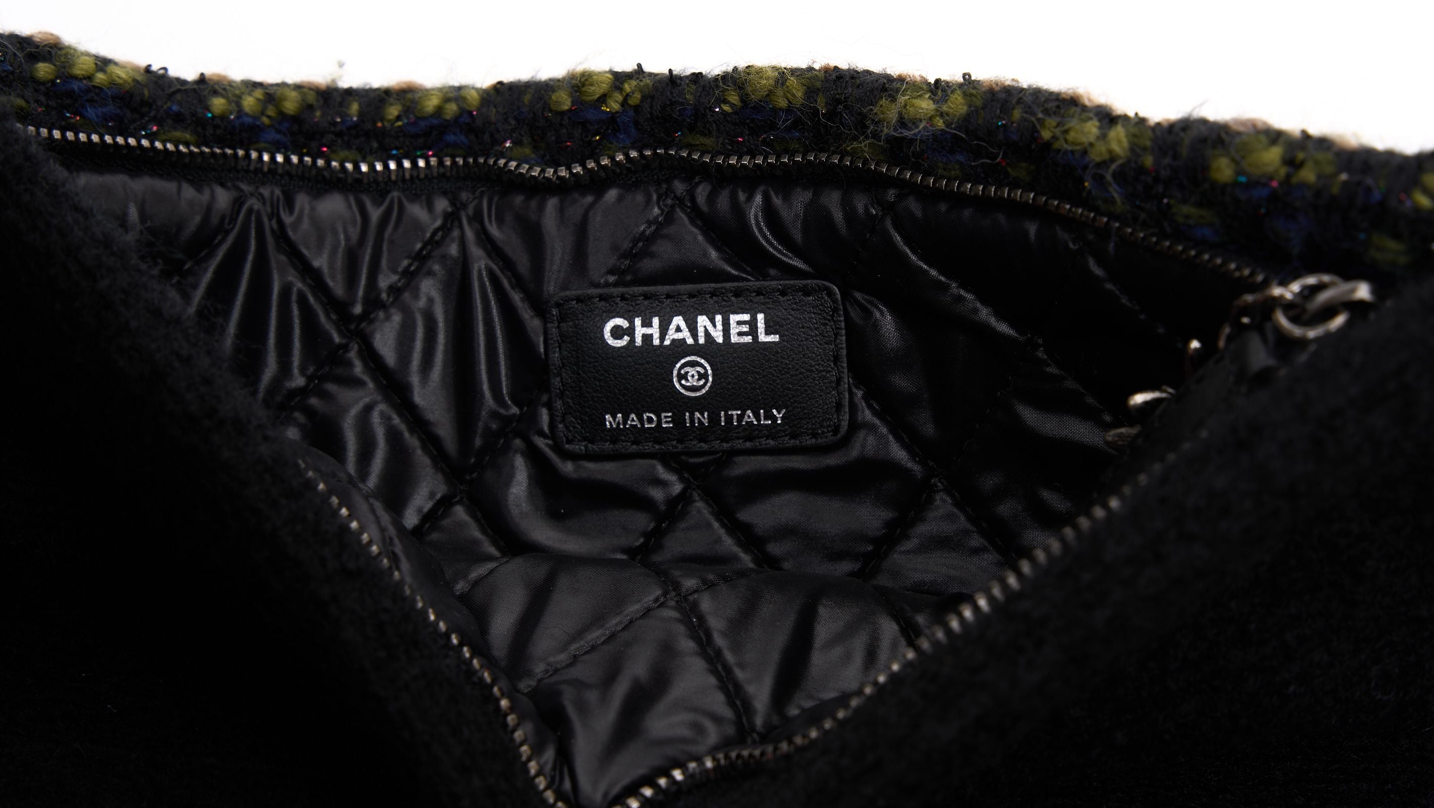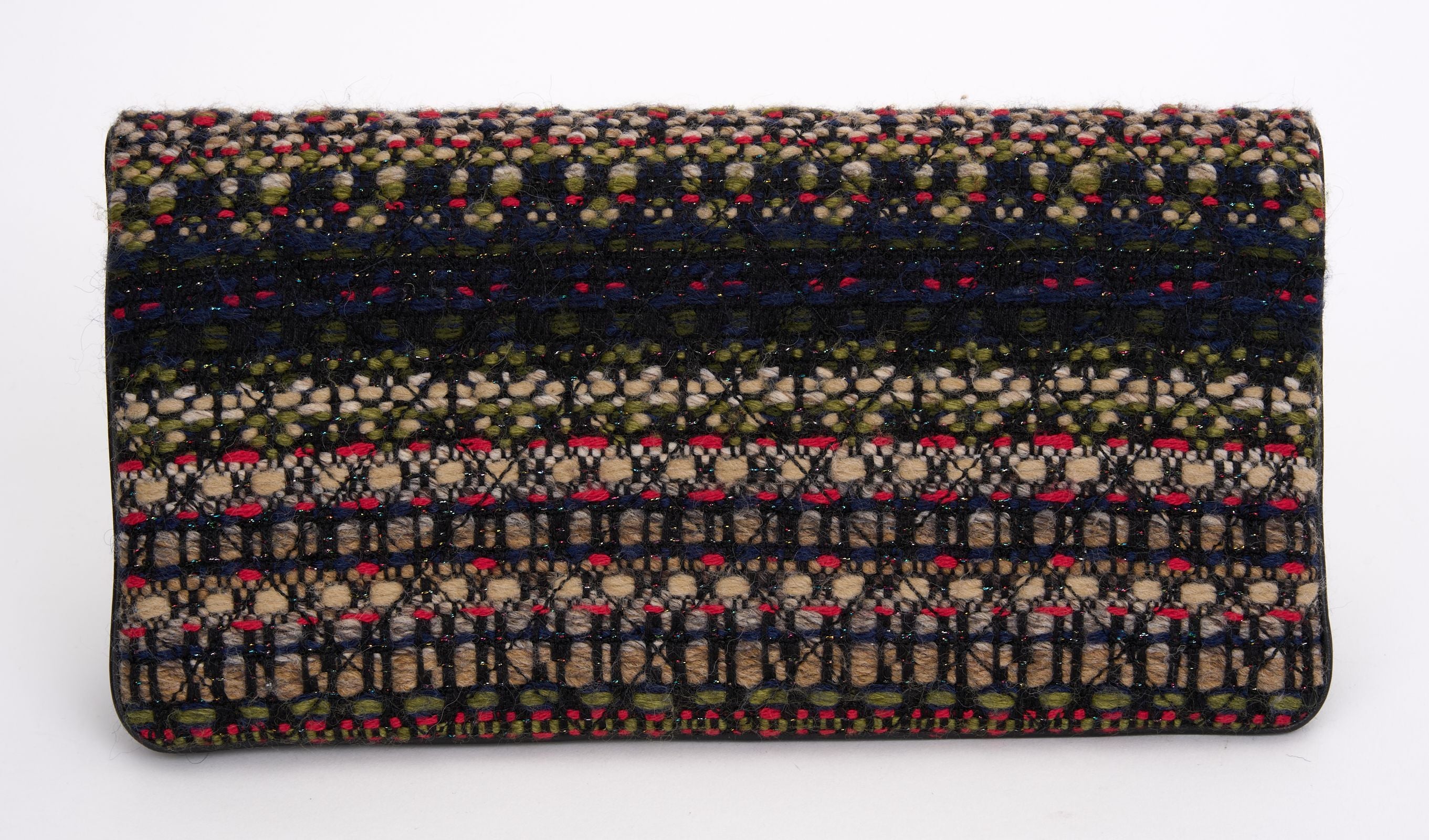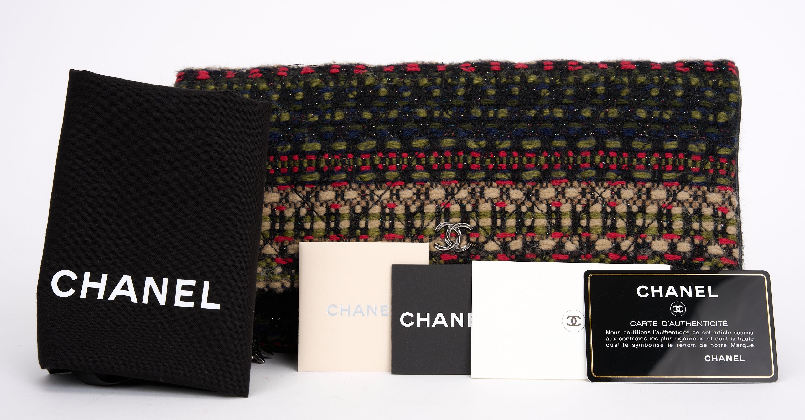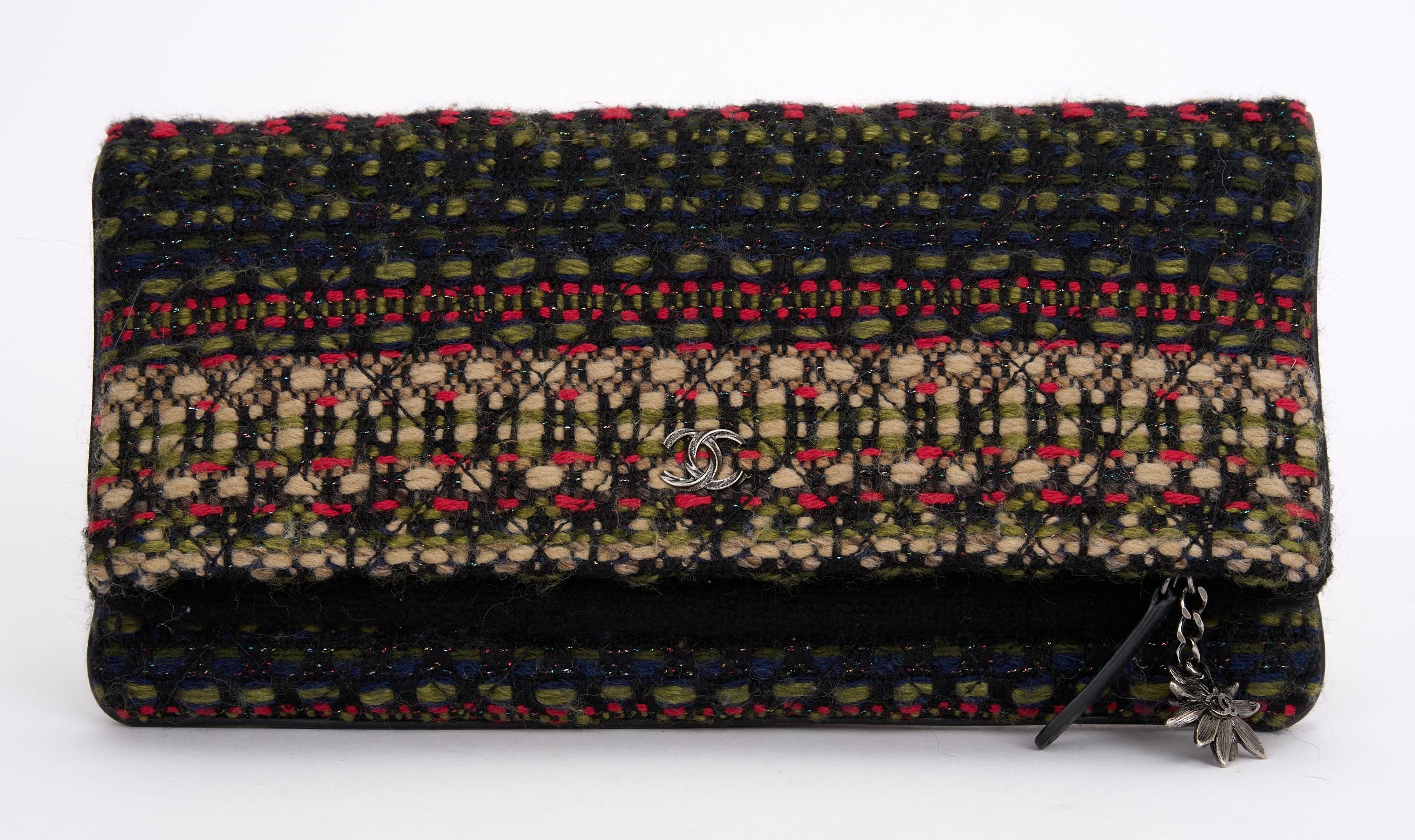 This Chanel Paris-Salzburg Edelweiss Clutch Quilted Tweed, crafted in multicolored quilted tweed, features a fold over flap, tiny CC logo on the front and aged silver-tone hardware. Its zip closure opens to a red quilted nylon. Hologram, booklet , dust Cover and ID card included. Hologram First Two Numbers are 21.