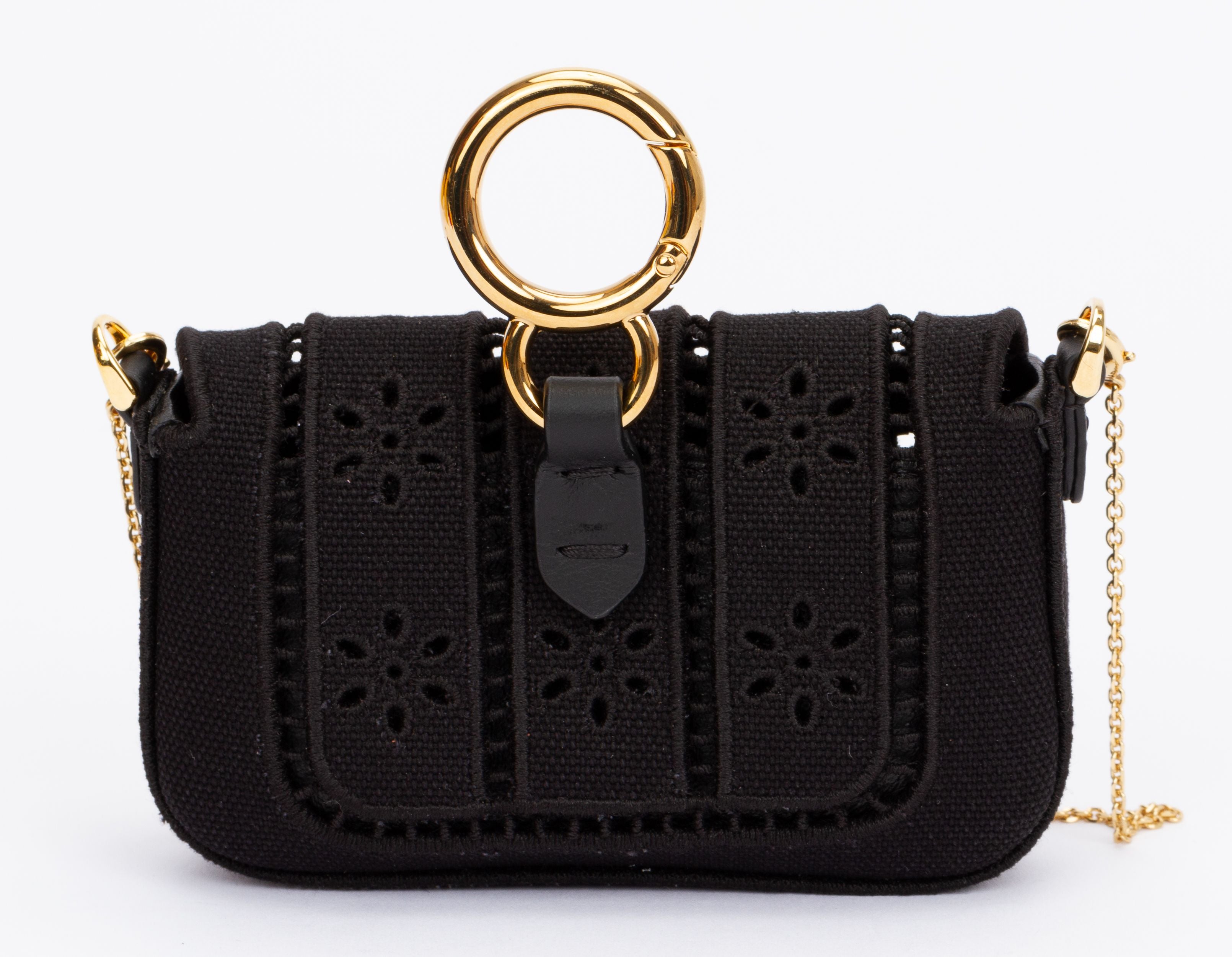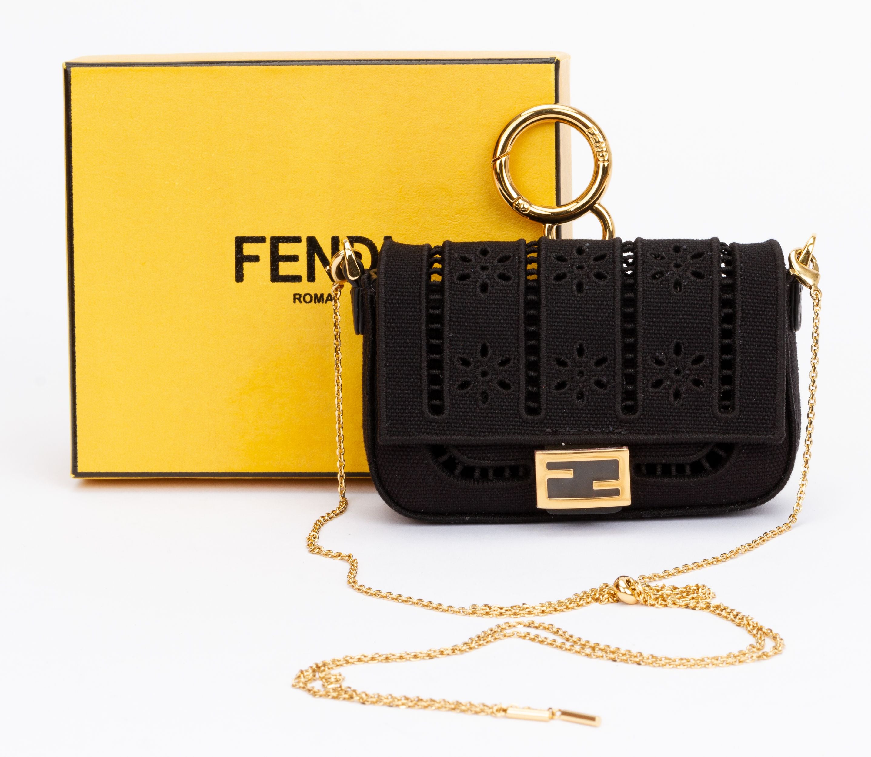 Fendi canvas embroidered nano baguette in black. The nano charm is made of black perforated canvas. It can be attached to a belt or clipped on to a bigger bag or it can be worn crossbody with the polished gold chain shoulder strap. (drop up to 19"). The strap is adjustable and detachable. The bag comes with a tag and booklets and is packed in the original box and dust cover.