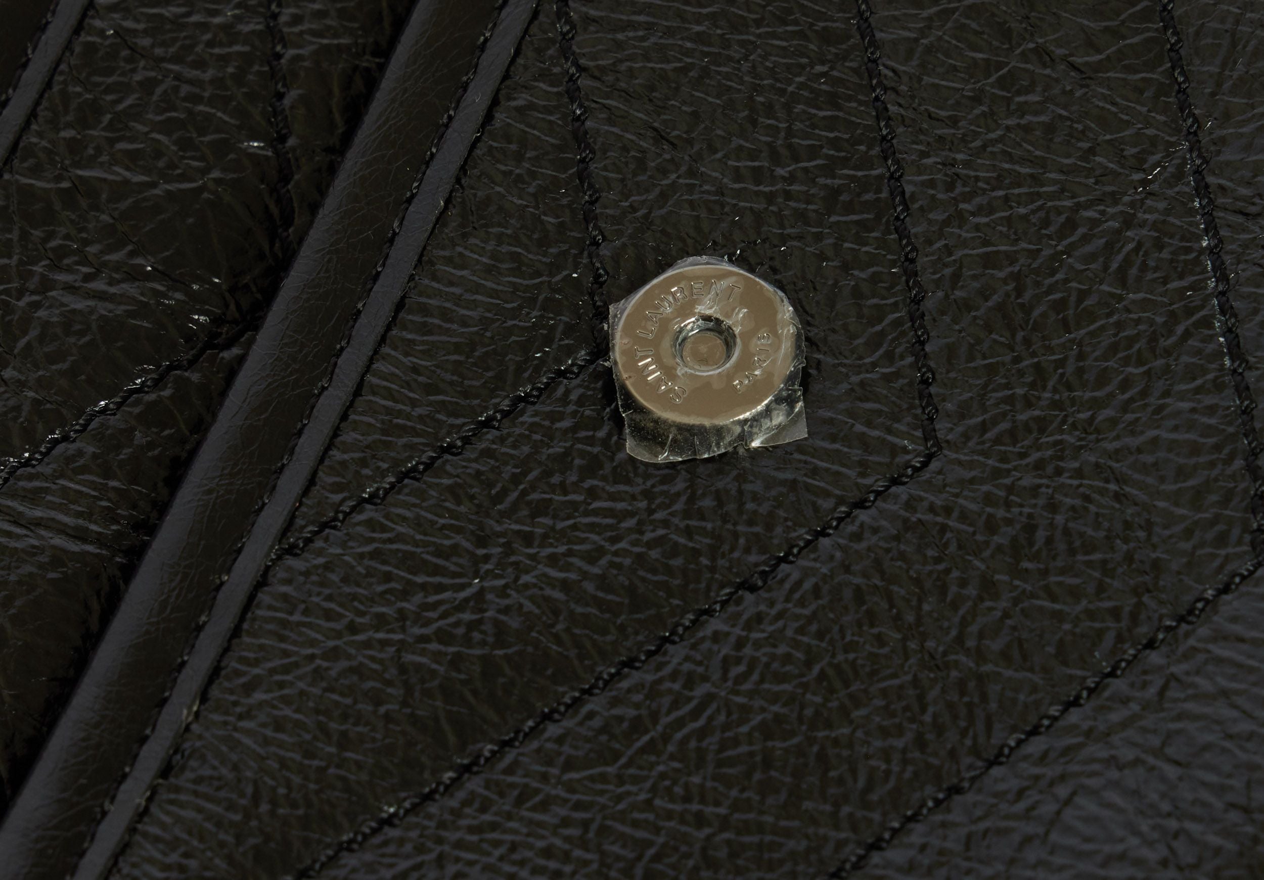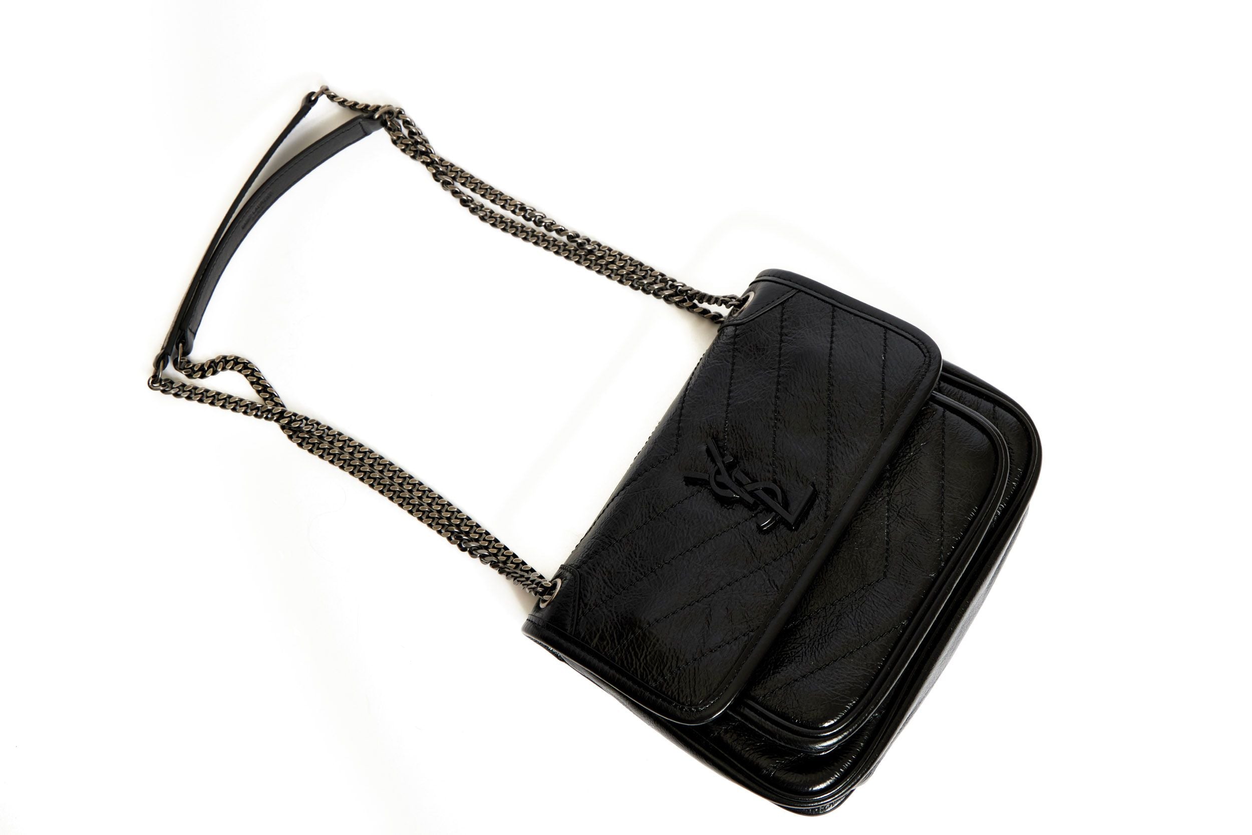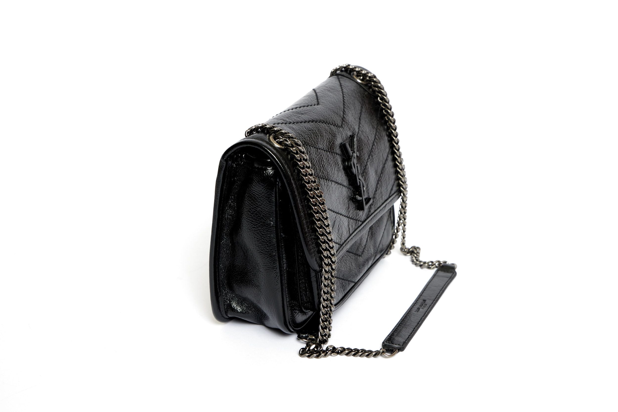 YSL brand new black patent cross body bag with ruthenium metal chain. The drop of the shoulder strap can be adjusted from 12.5" to 22". The piece comes with the original dust cover.
