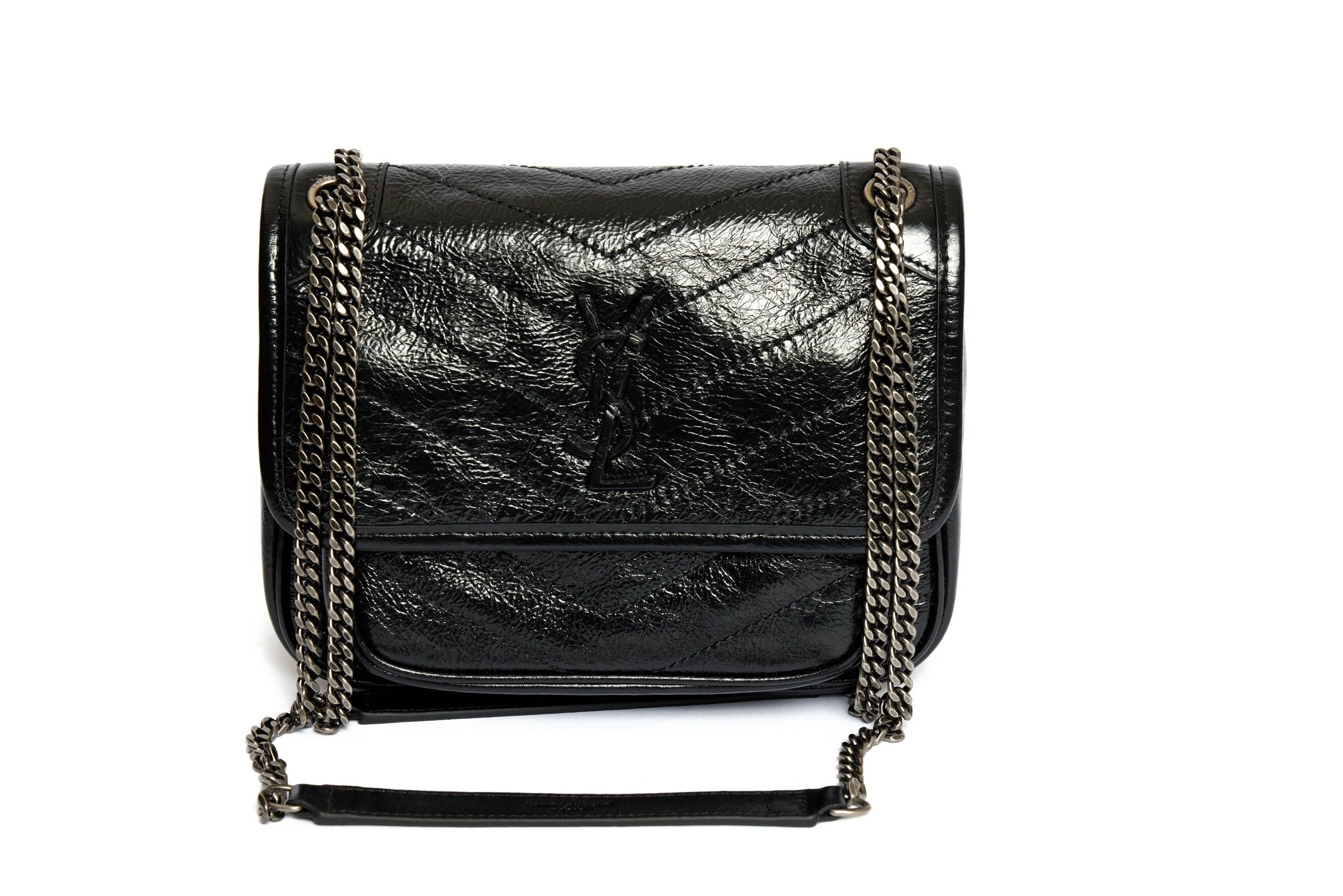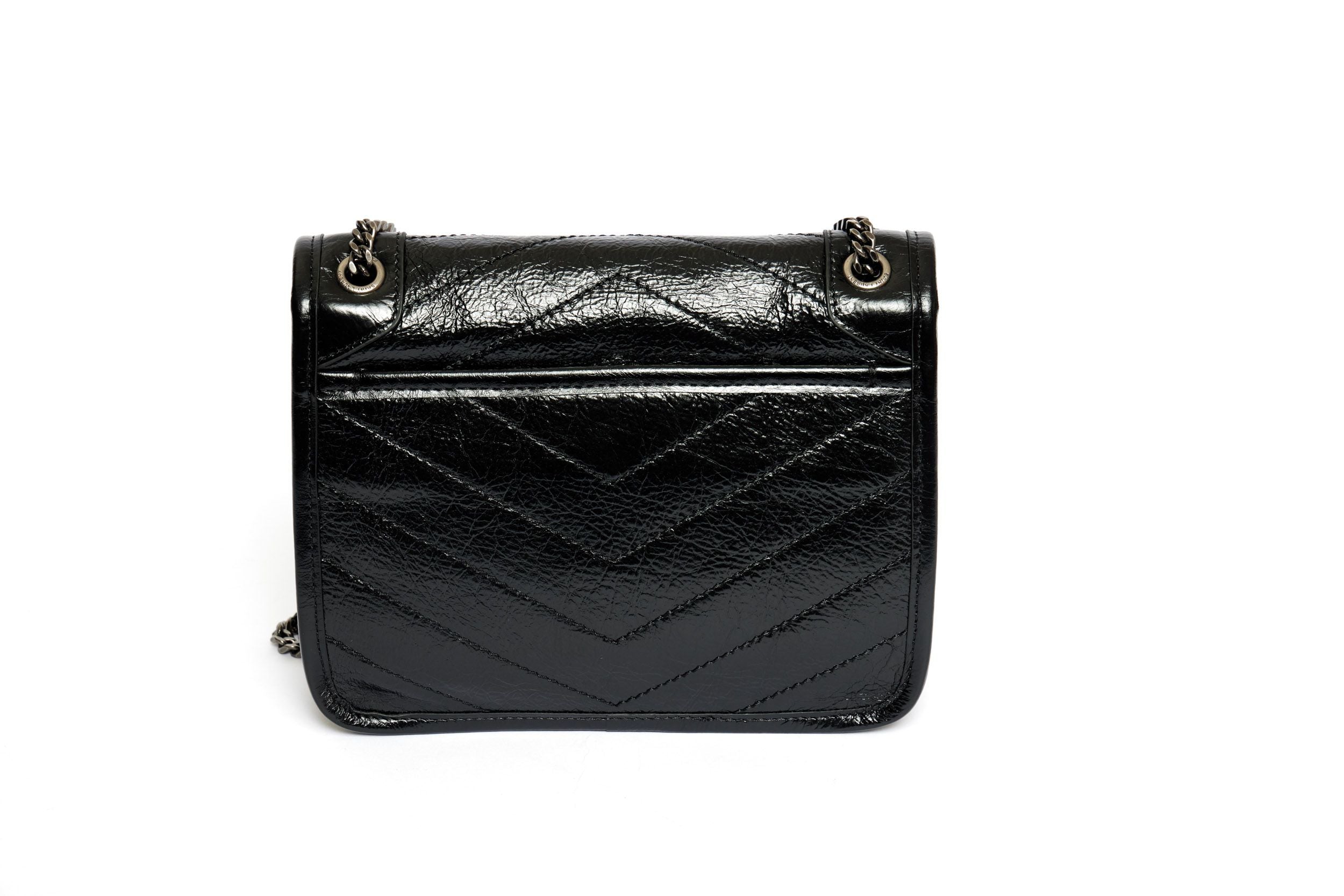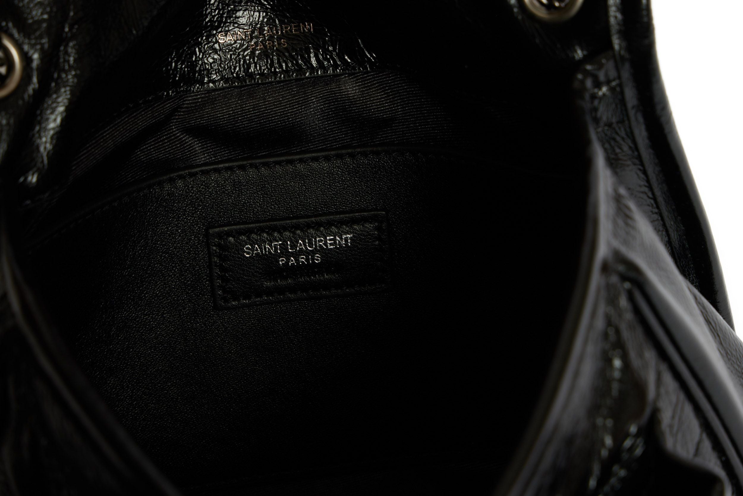 YSL brand new black patent cross body bag with ruthenium metal chain. The drop of the shoulder strap can be adjusted from 12.5" to 22". The piece comes with the original dust cover.