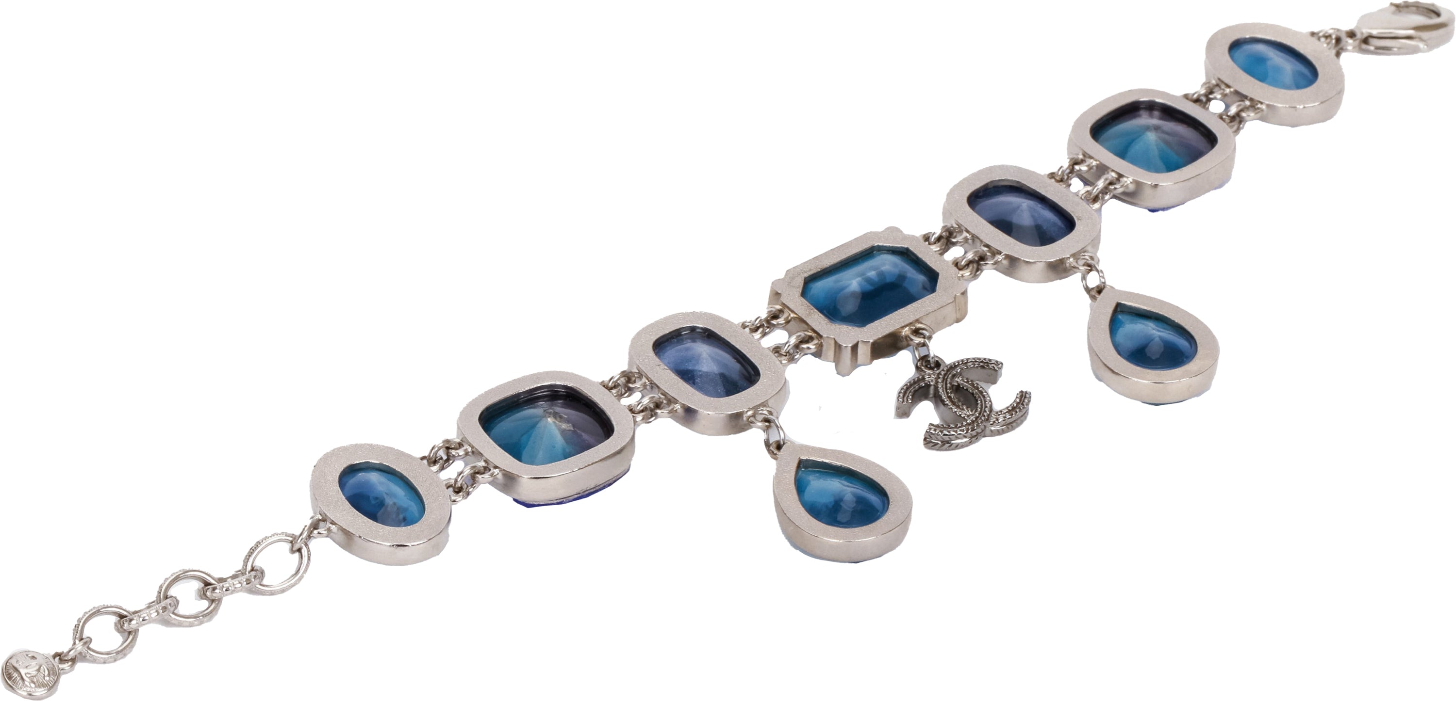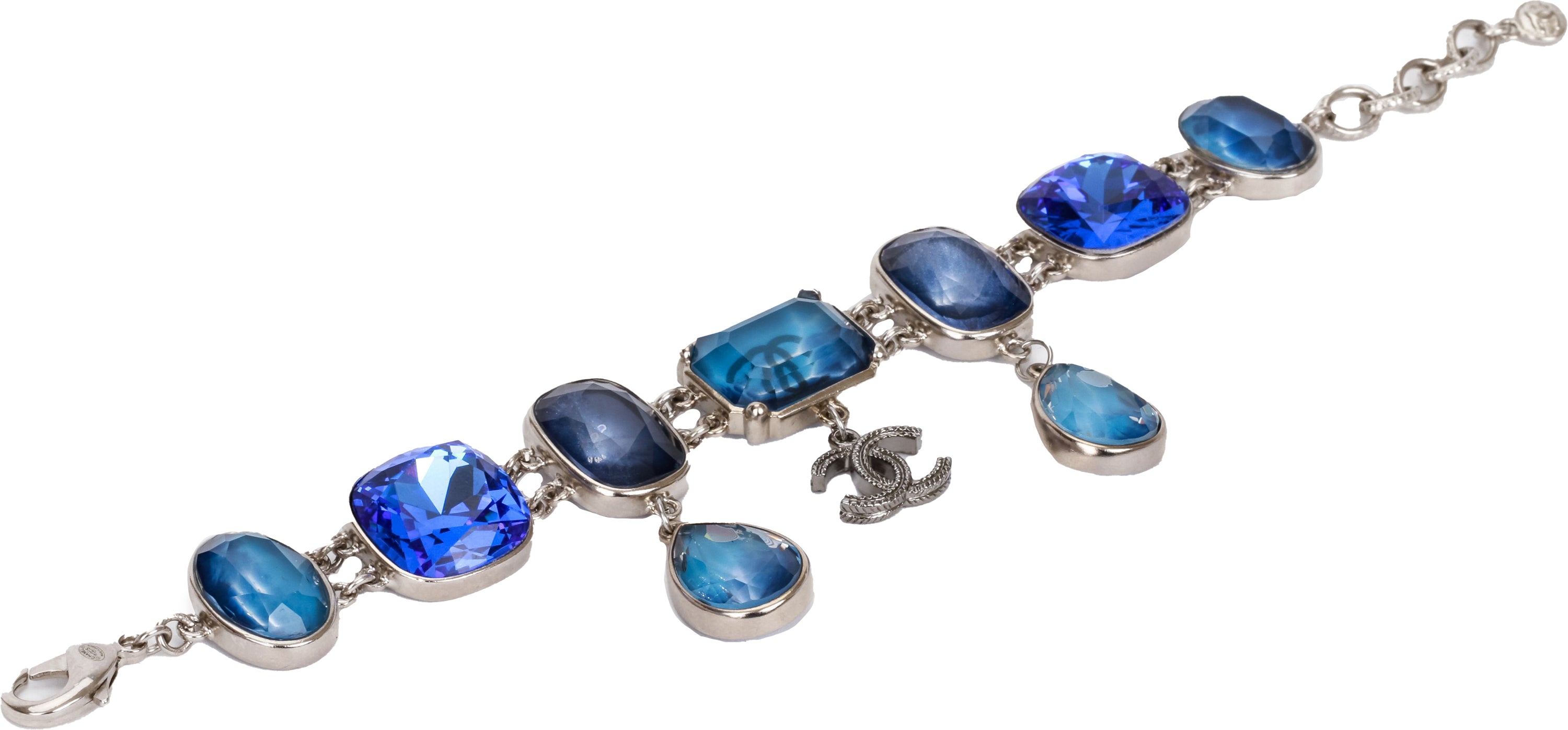 Chanel blue stones bracelet mixed cuts with CC and pear shape charms. Comes with original pouch.