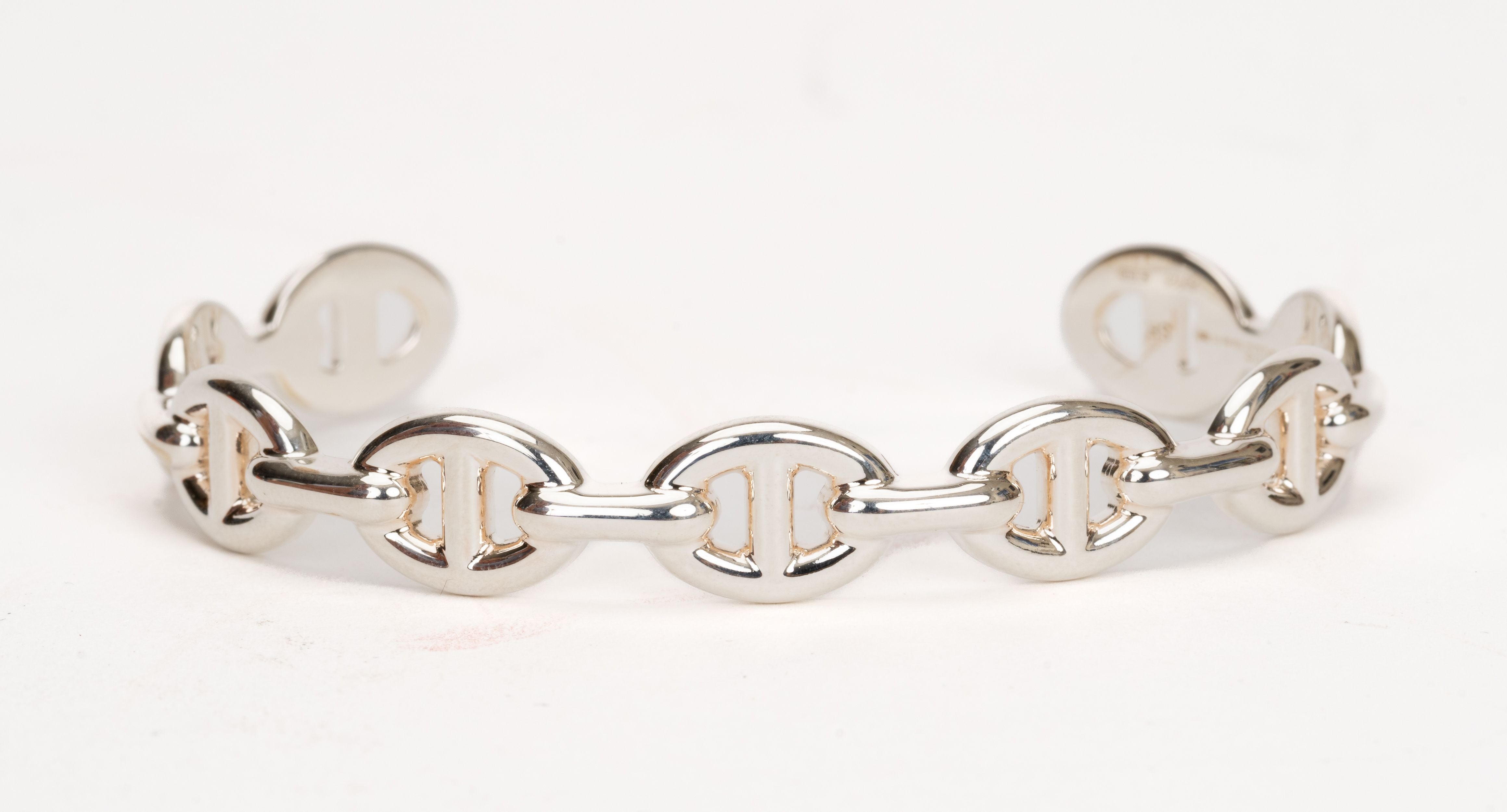 The Hermès Chaine d'Ancre Enchainne Bracelet made from 925 Sterling Silver is a classic. Opening 1.25". Size small and comes with original pouch and box. Brand new in unused condition .