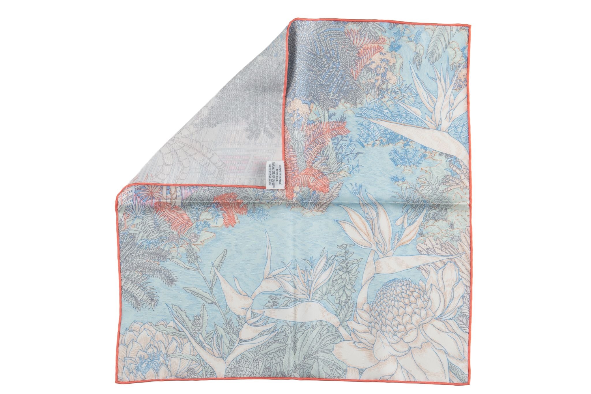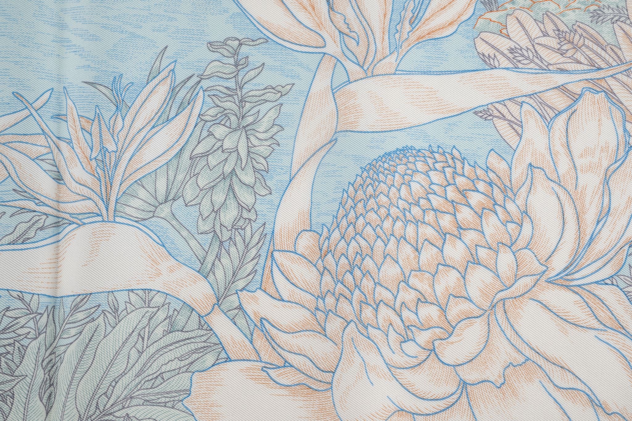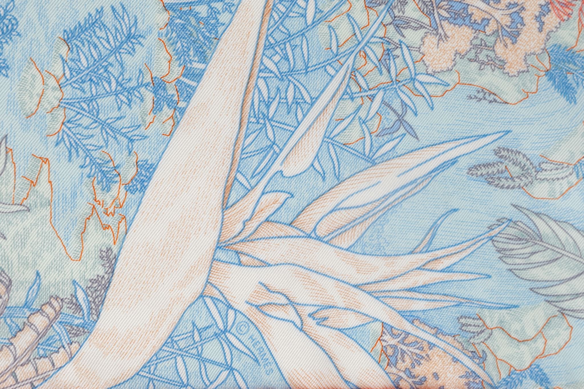 This Hermès Faubourg Tropical" Scarf 45 in is 100% silk twill with hand-rolled edges. Designed by Théo de Gueltzl and Octave Marsal Comes with original box.