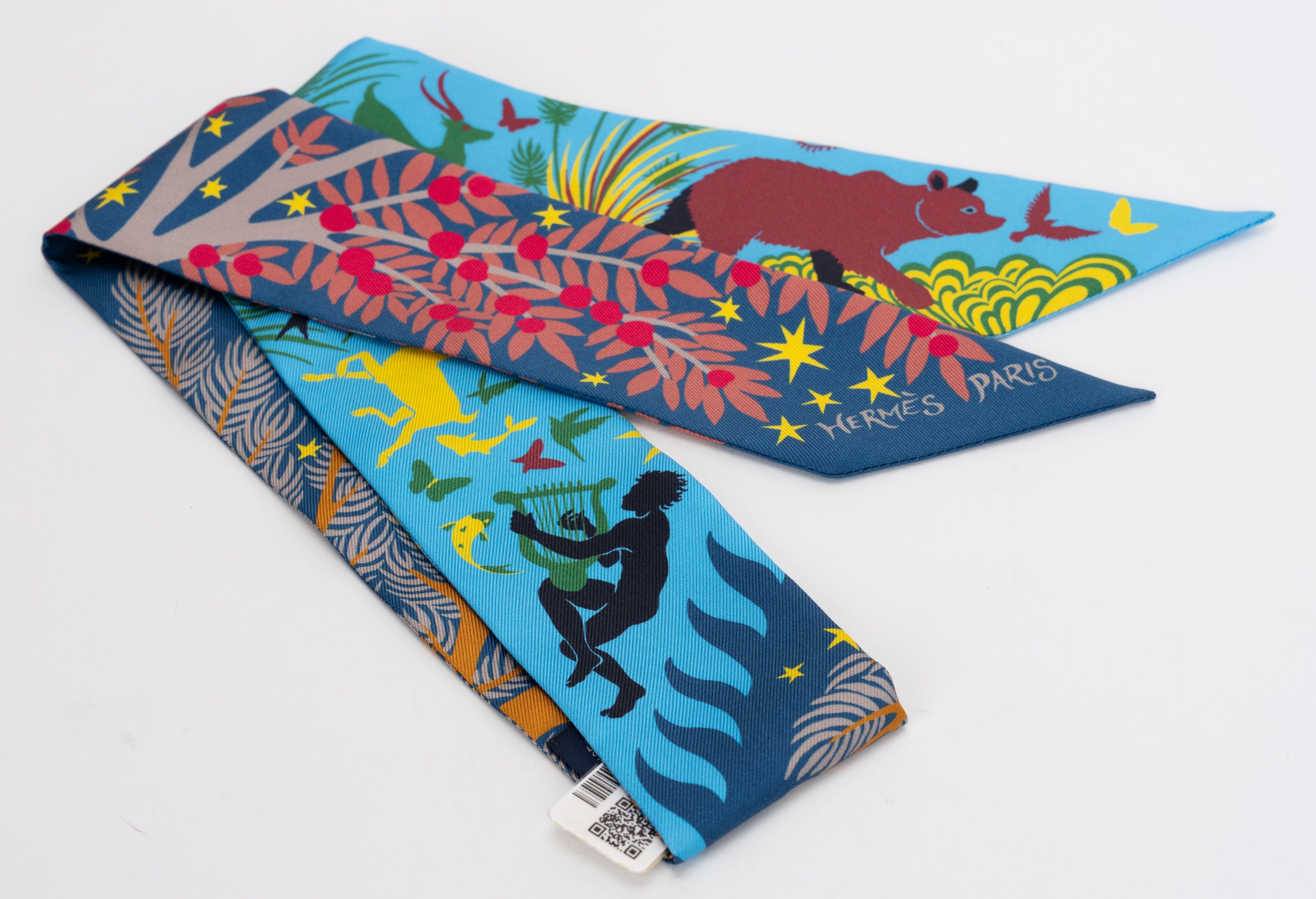 Hermes "Sous Le Charme D'Orphee" Marine Silk Twilly, designed by Alice Shirley. New with palladium medor slide. Can be worn as a scarf or as a bracelet. Comes with original box.