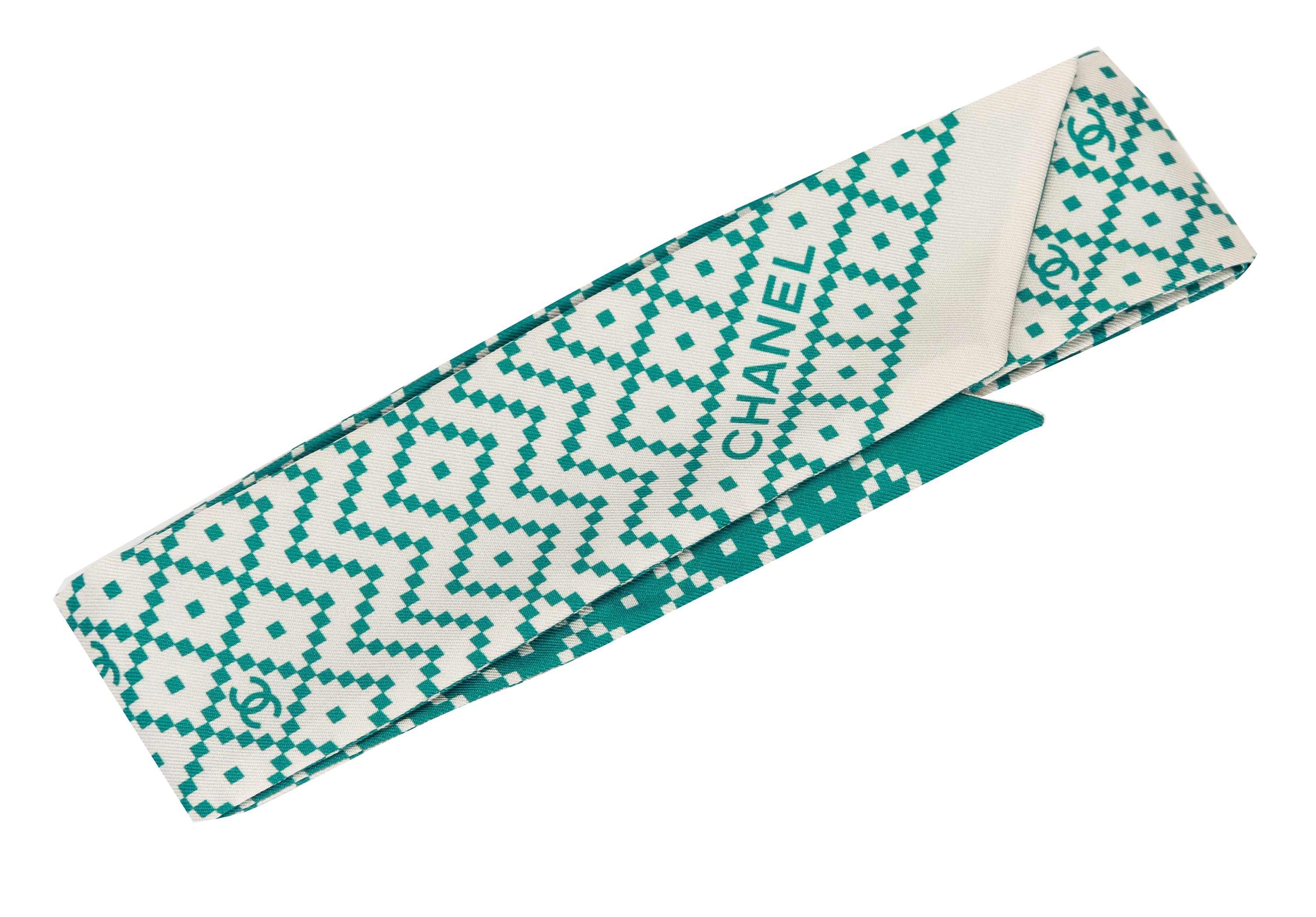 Chanel new green and white logo twilly (headband/scarf), 100%silk, 48" x 2"