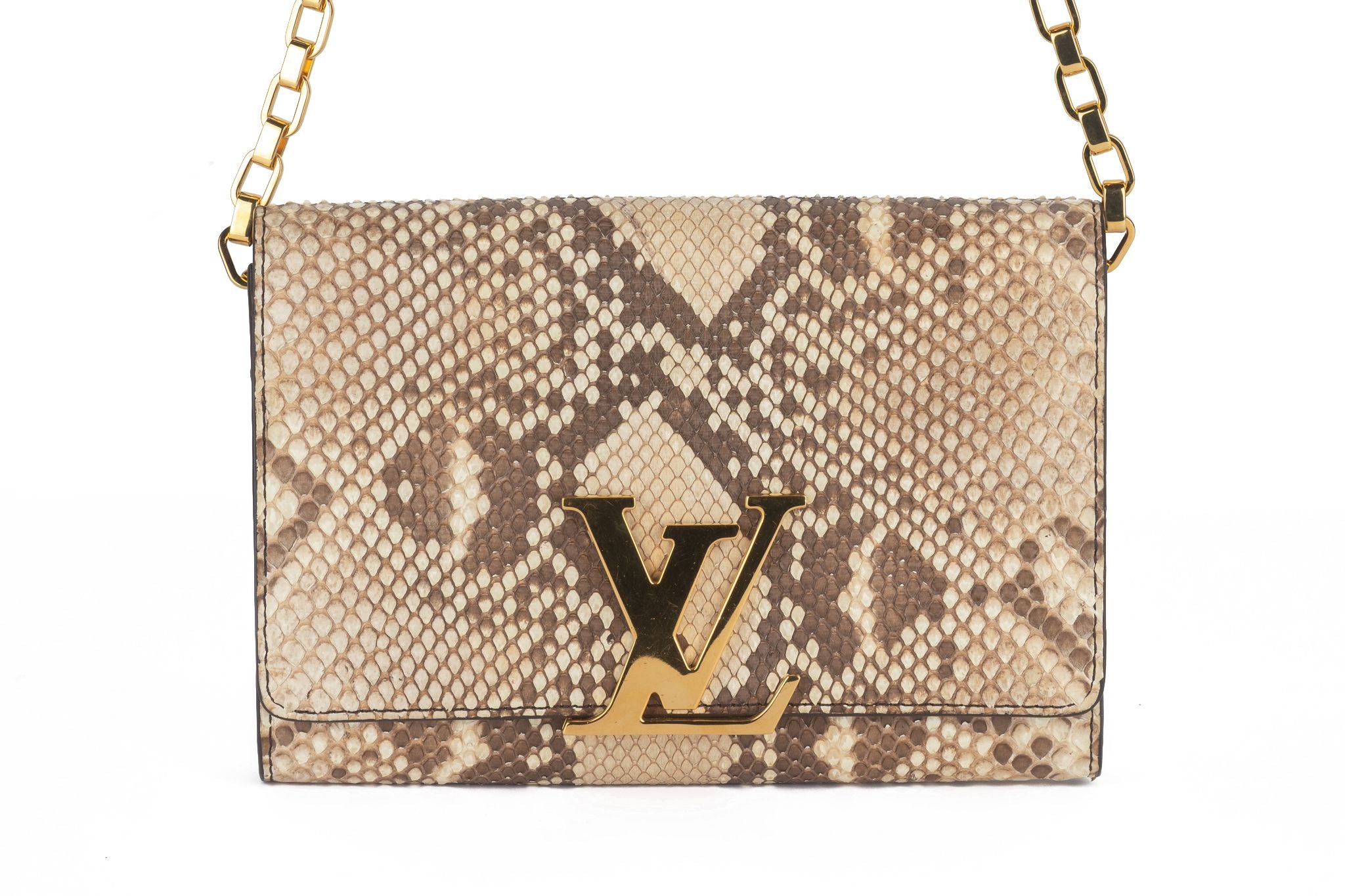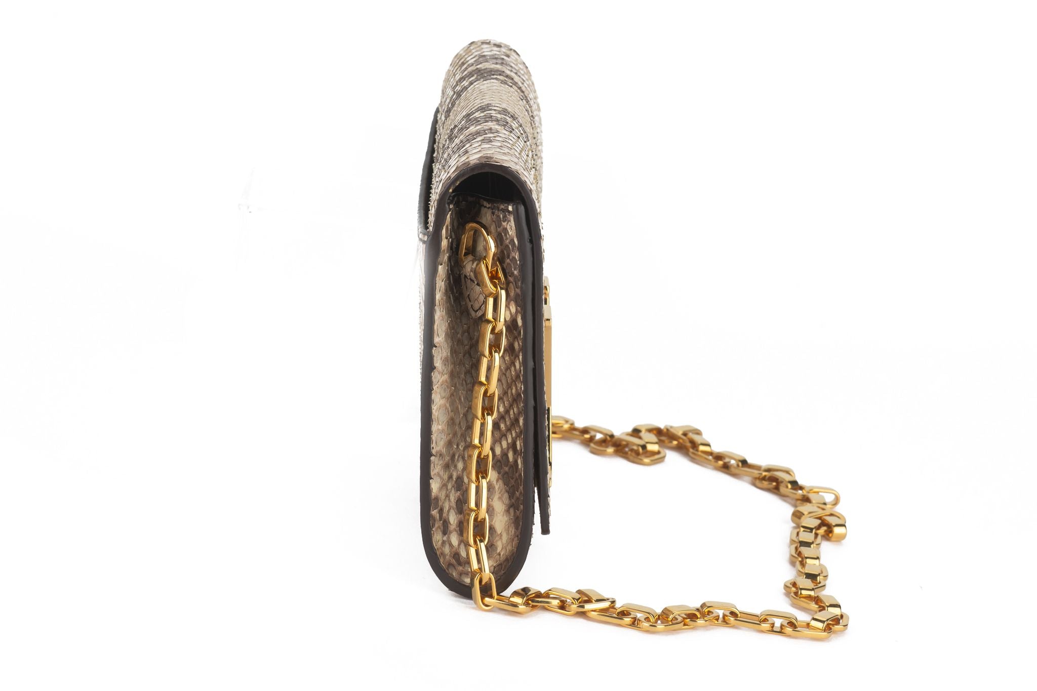 This bag is done in natural Python with gold hardware, featuring a chain shoulder strap (drop 15") and a flap top with a flip clasp closure. The interior is done in dark brown leather, featuring one front slip pocket, one zip pocket, and six card slots. There is moderate scratching to the hardware, and lifting to the python scales throughout. Comes with original box and certificate of authenticity. Due to wildlife regulation, this bag does not ship to California.