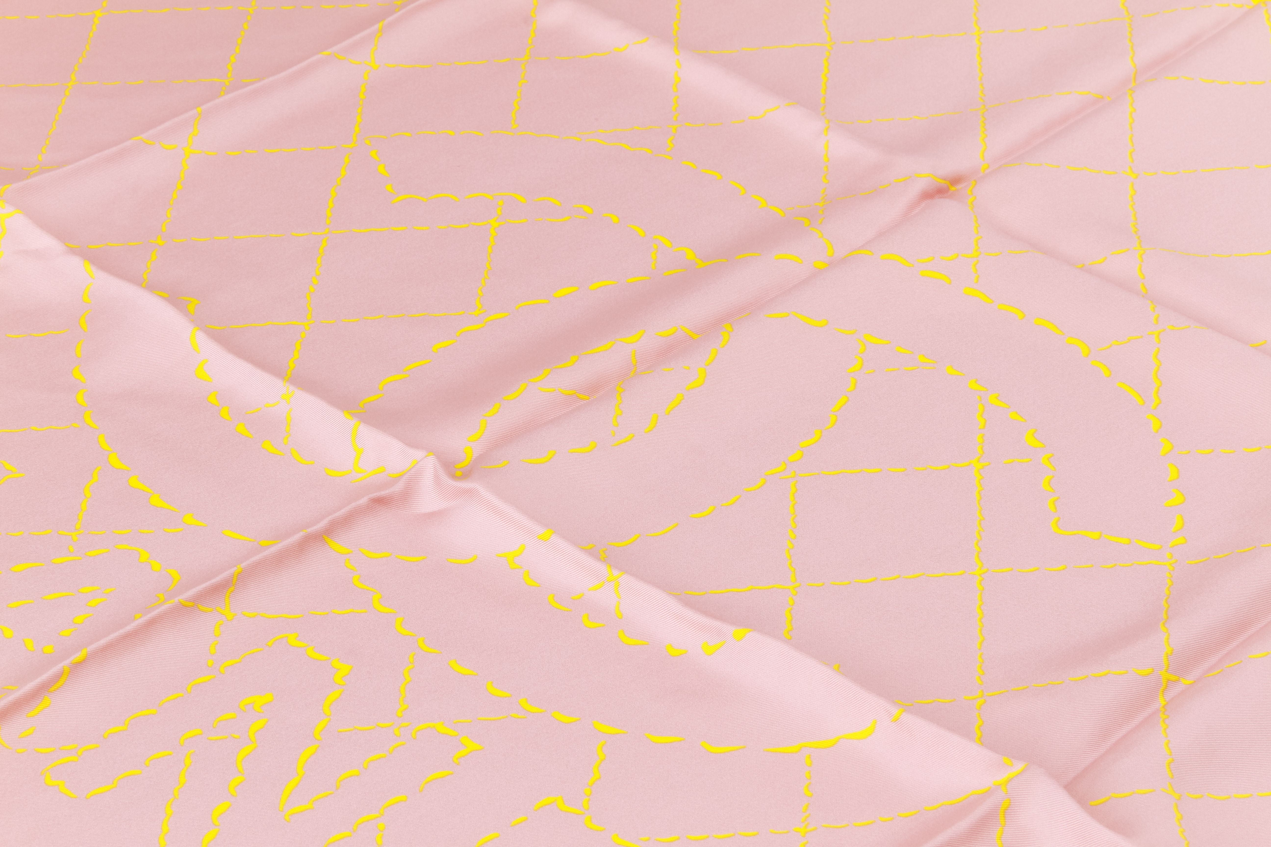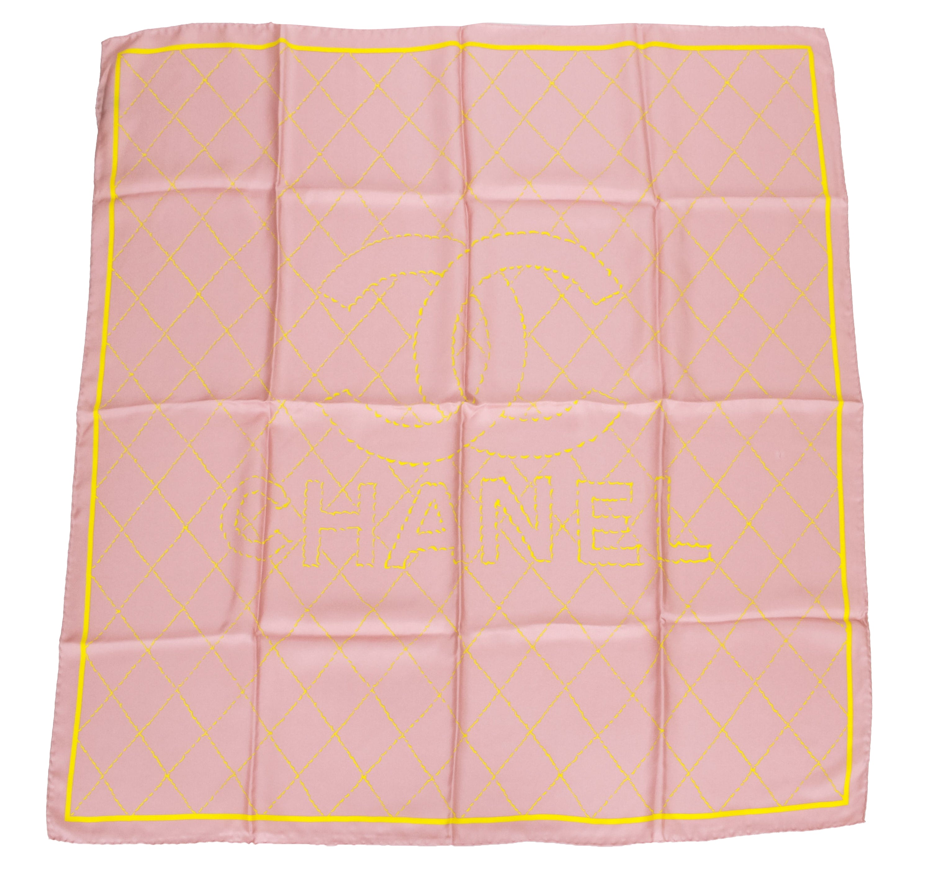 Chanel new pink and yellow quilted logo scarf , 100% silk, 35" x 35"
