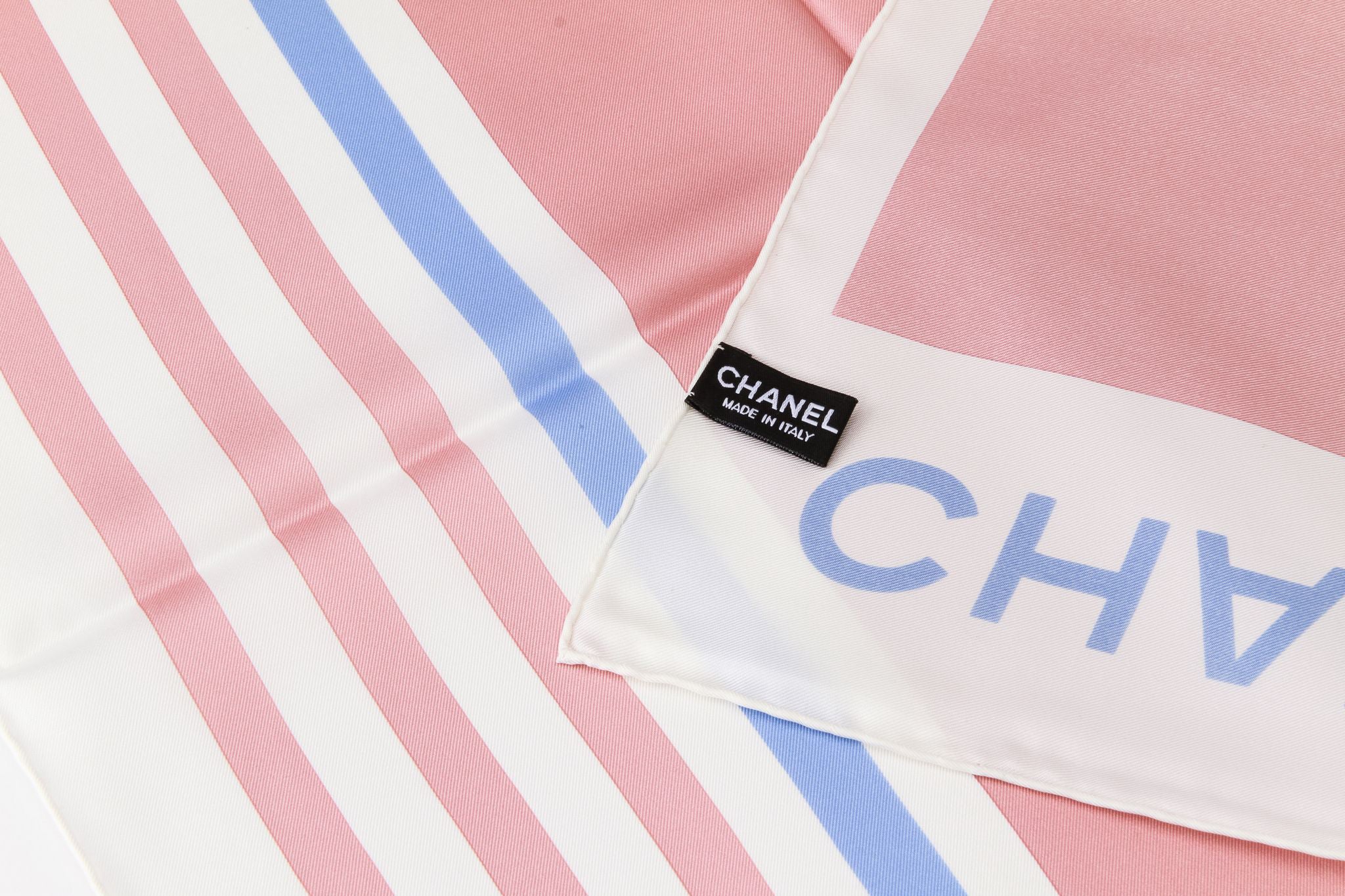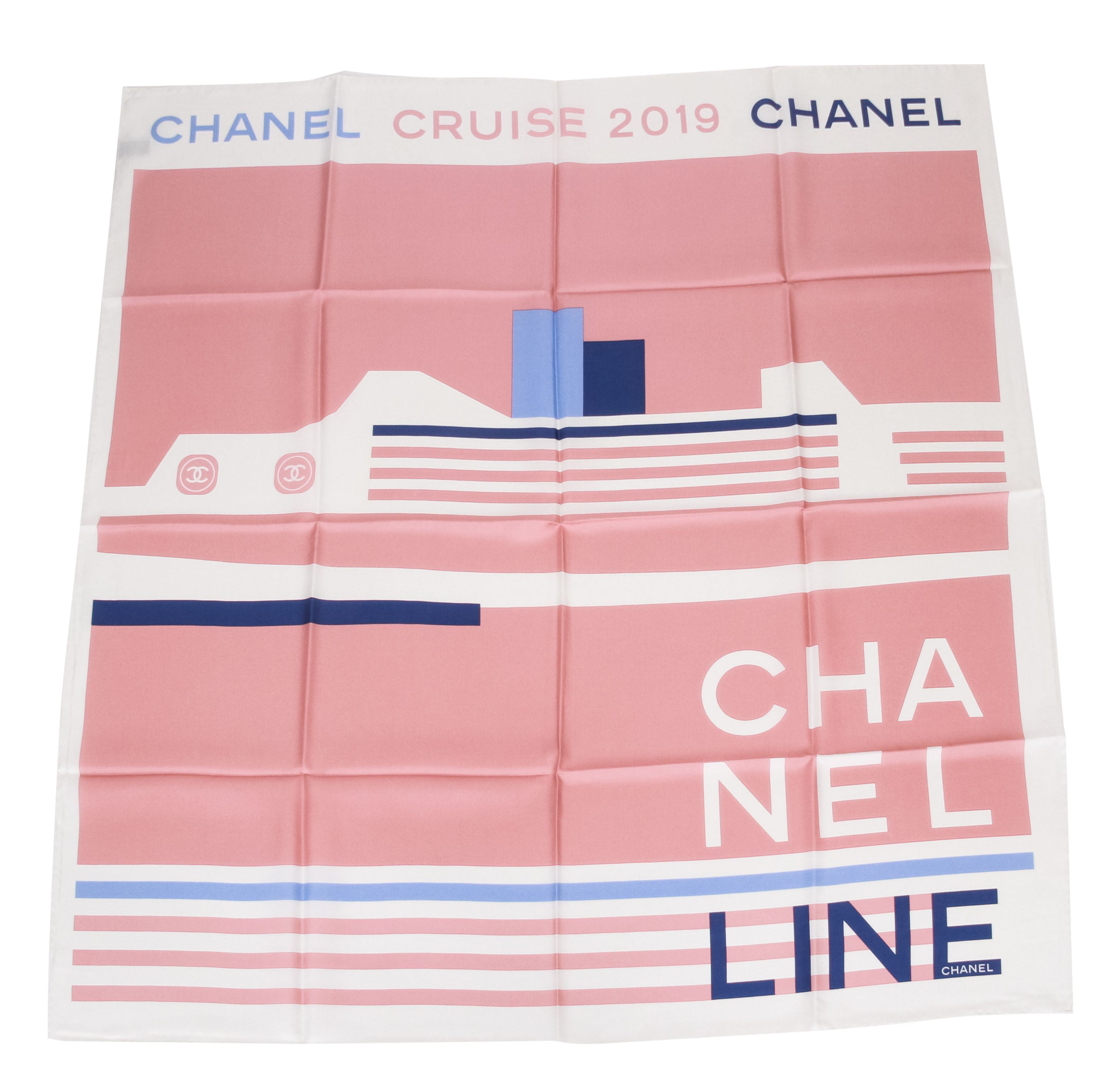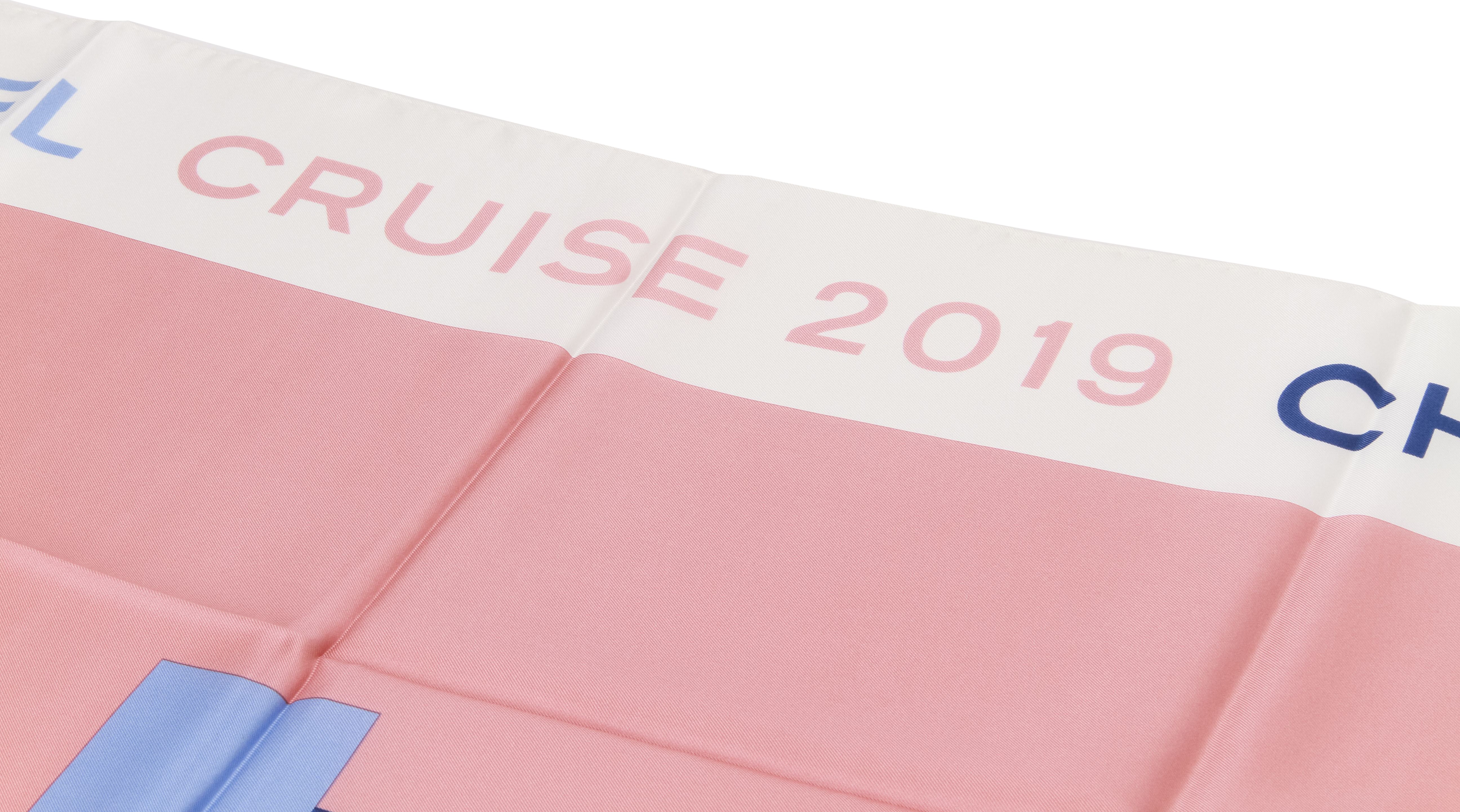 chanel new white/celeste/blue/blush cruise 2019 scarf, 35"x 35", 100% silk
