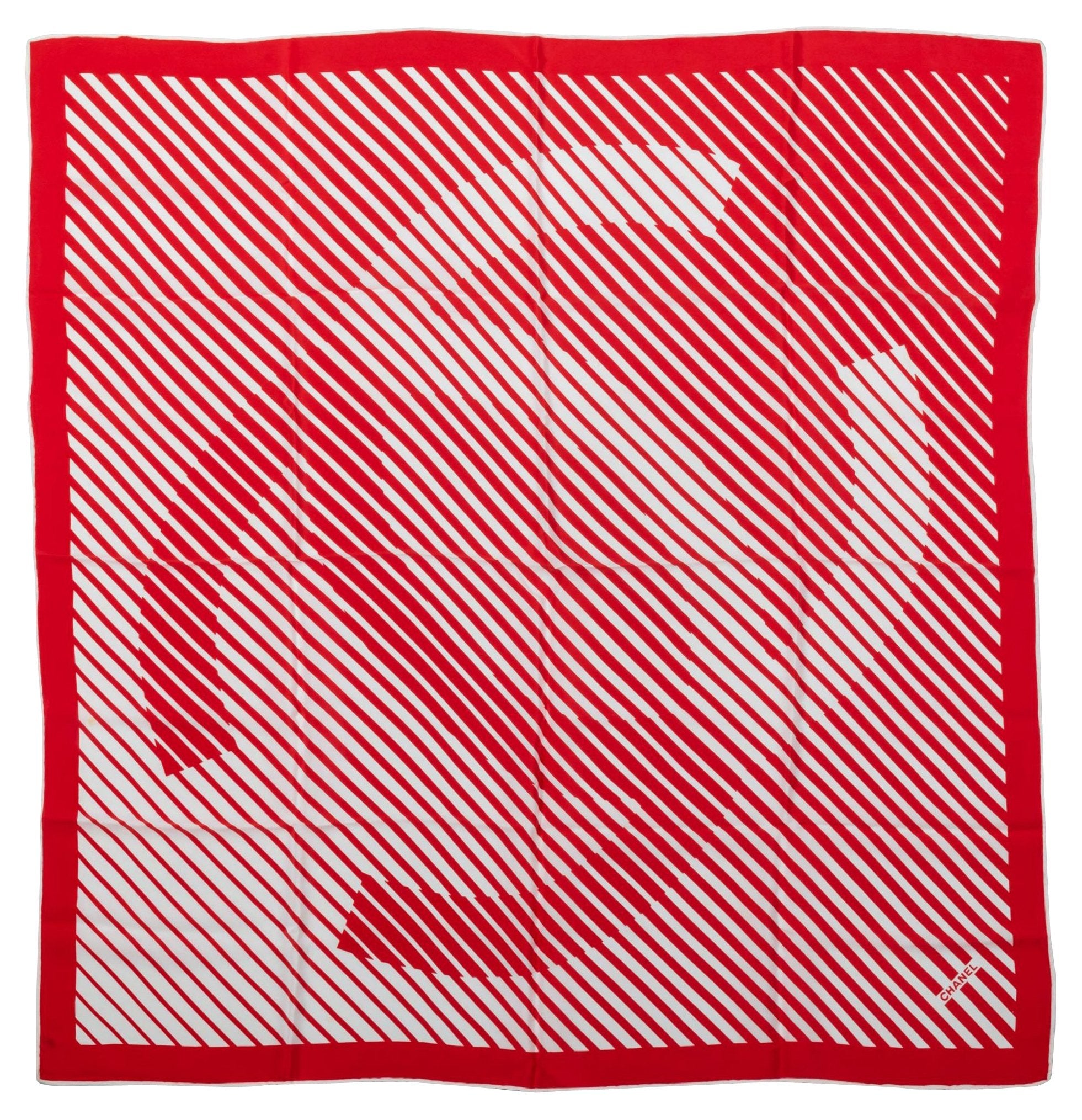 Chanel silk twill red & white logo scarf. Square with hand rolled edges.
