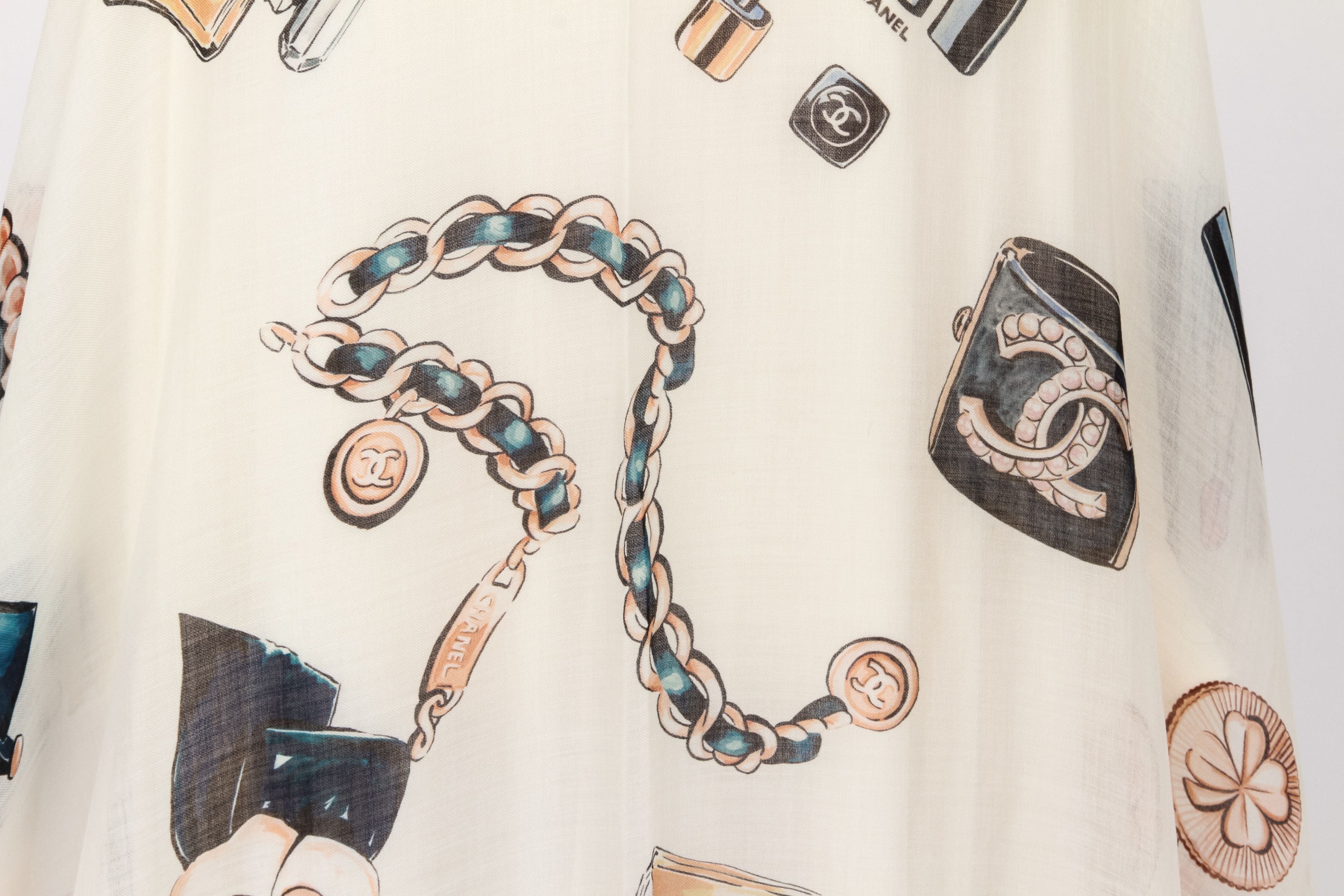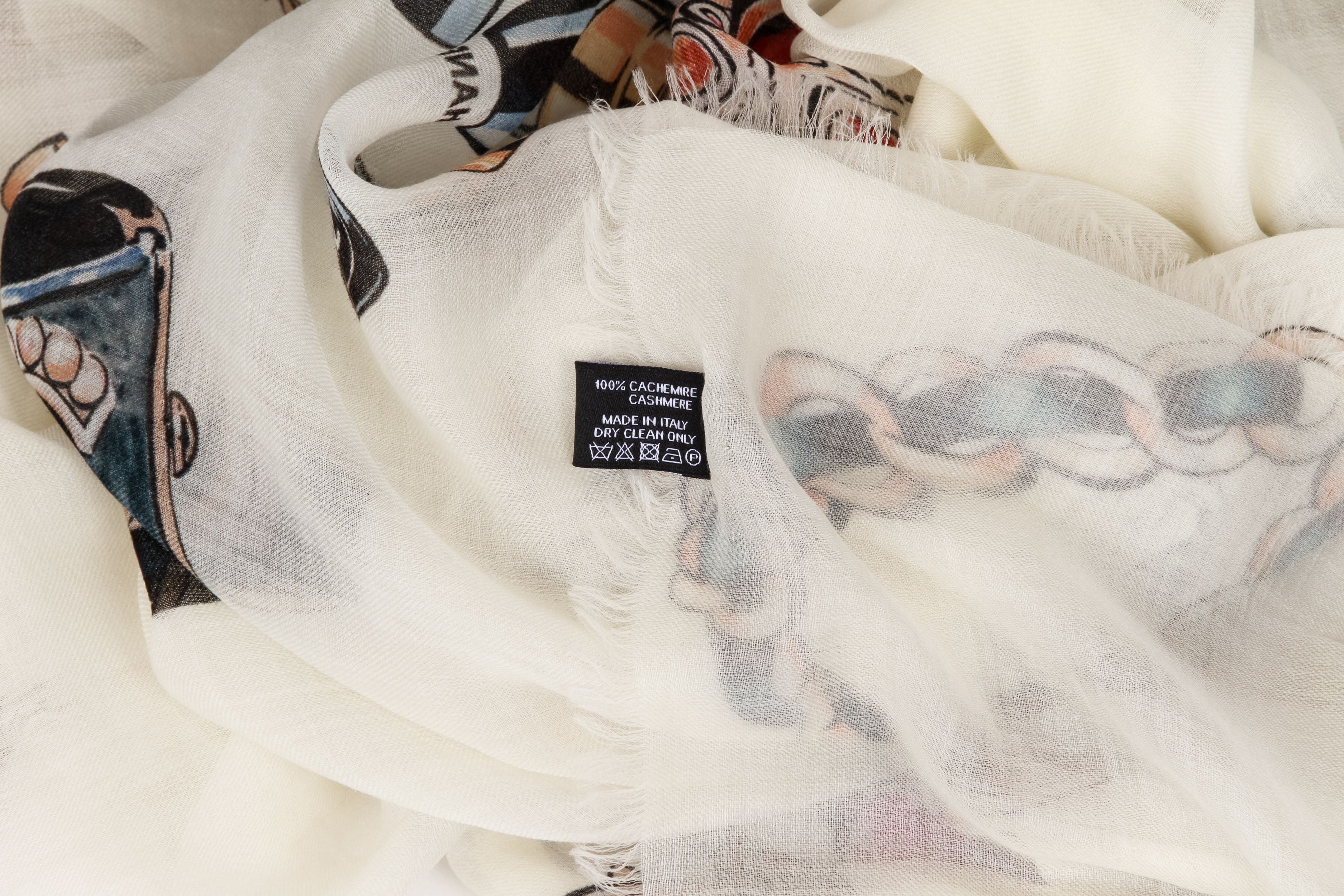 Chanel white cashmere gripoix XL shawl featuring the icons. Measures 74"x52"