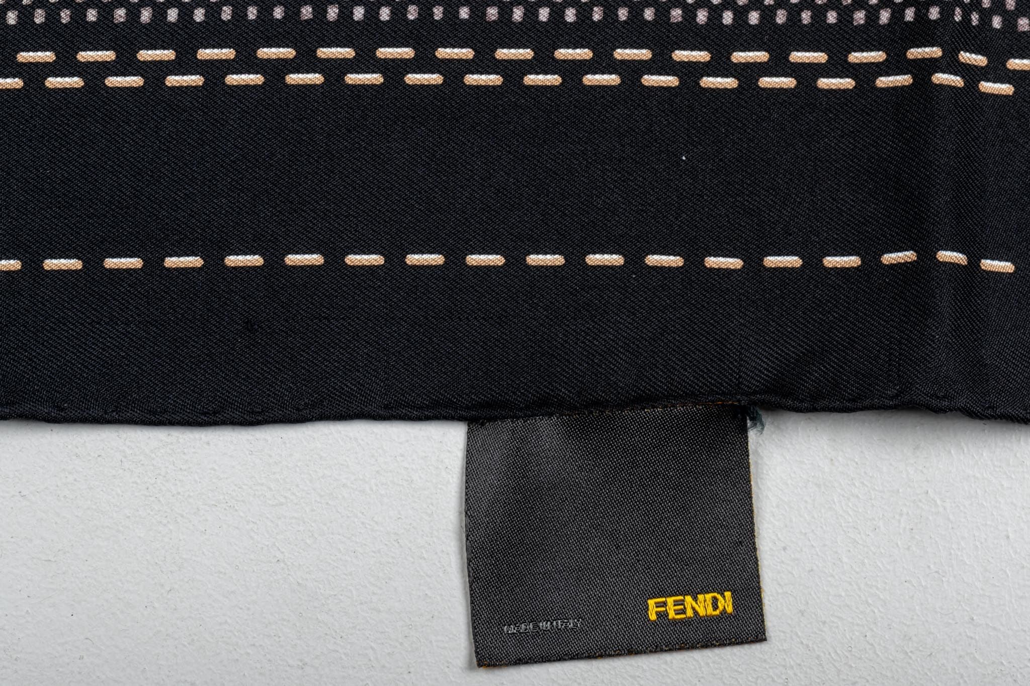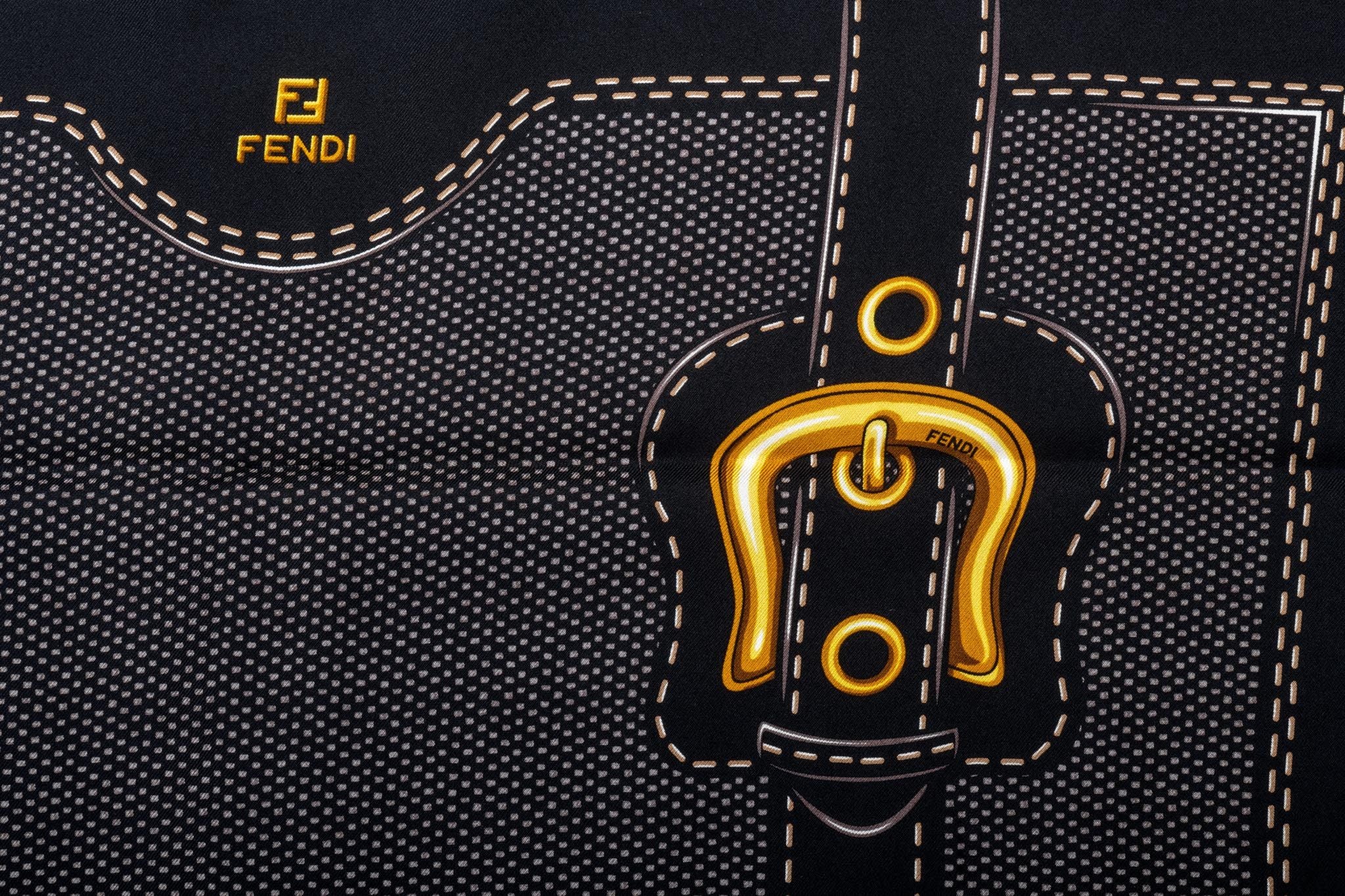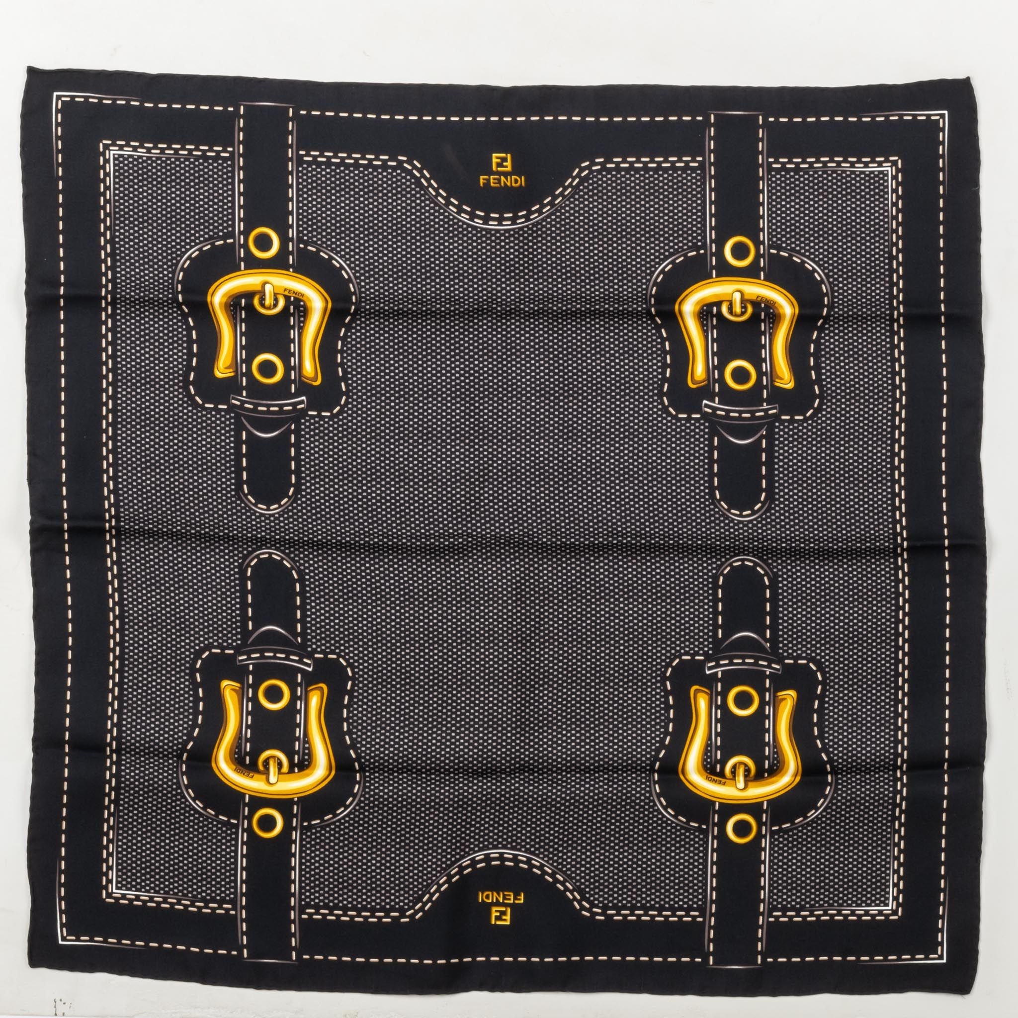 Fendi Roma 100% silk small scarf with multiple buckles design. Balck and yellow color combination. Hand rolled edges.