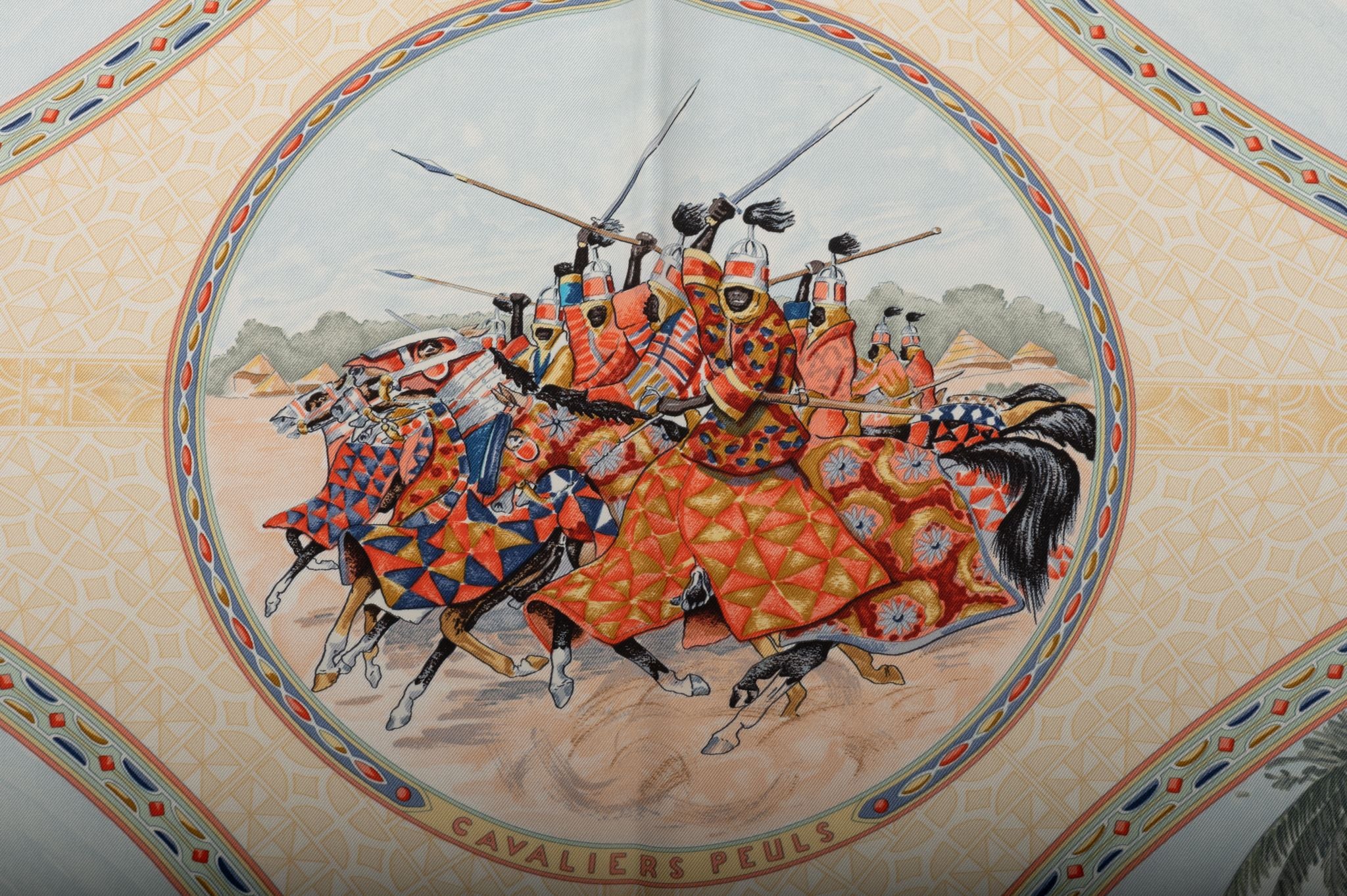 Hermès collectible black silk twill Cavaliers Peuls scarf. Hand-rolled edges. Excellent condition.