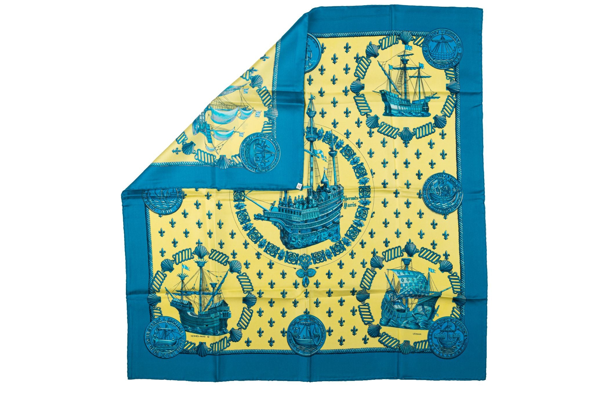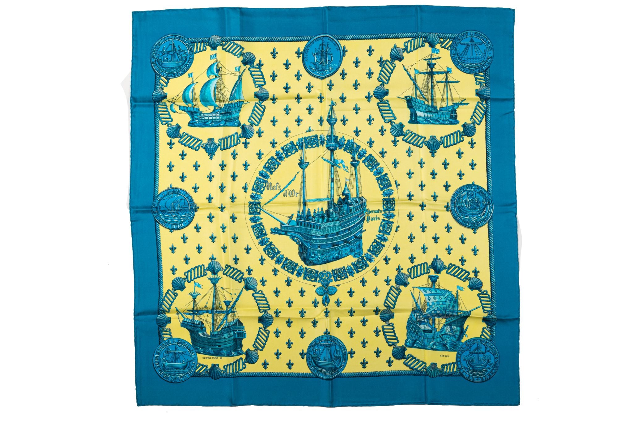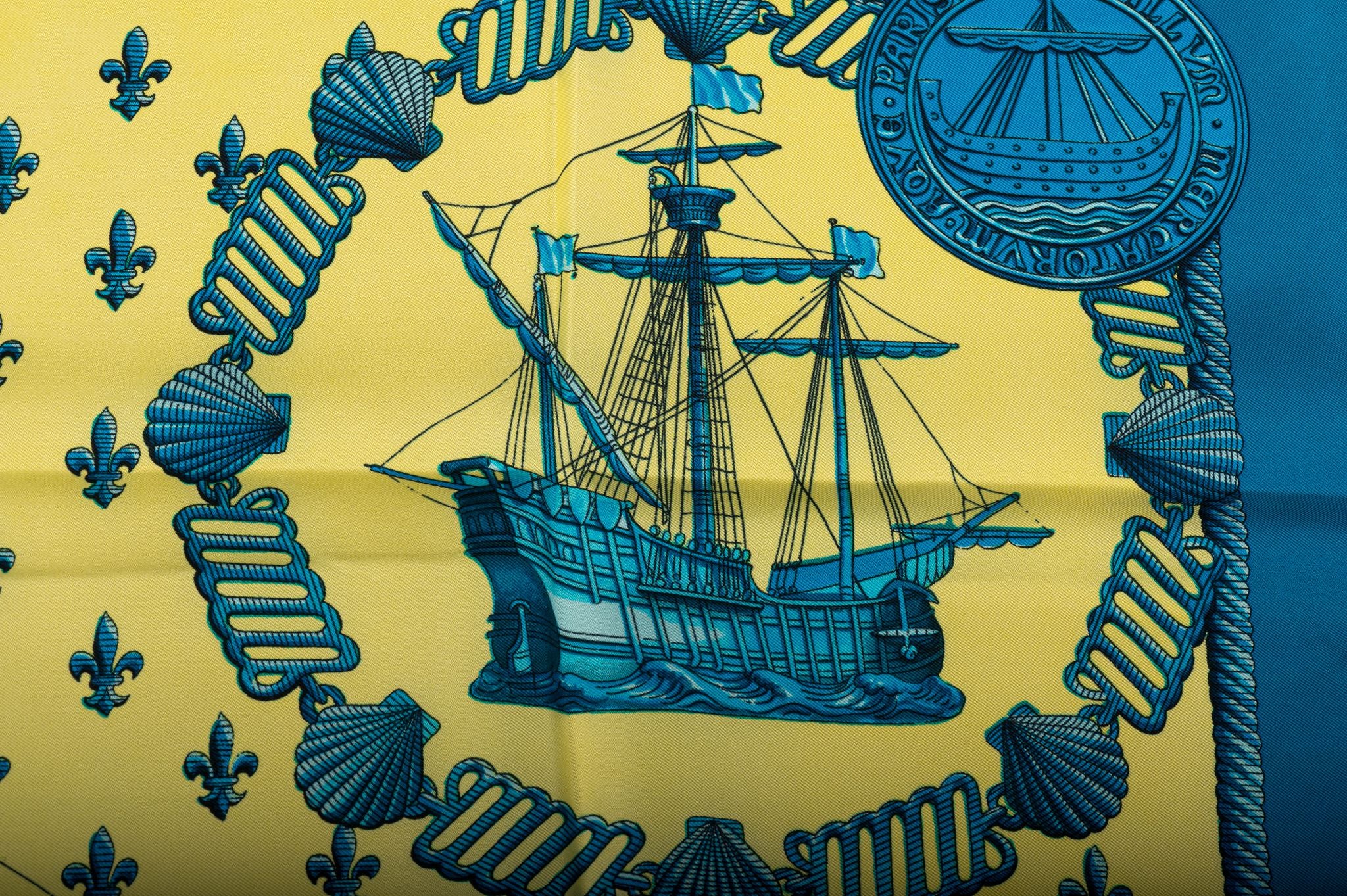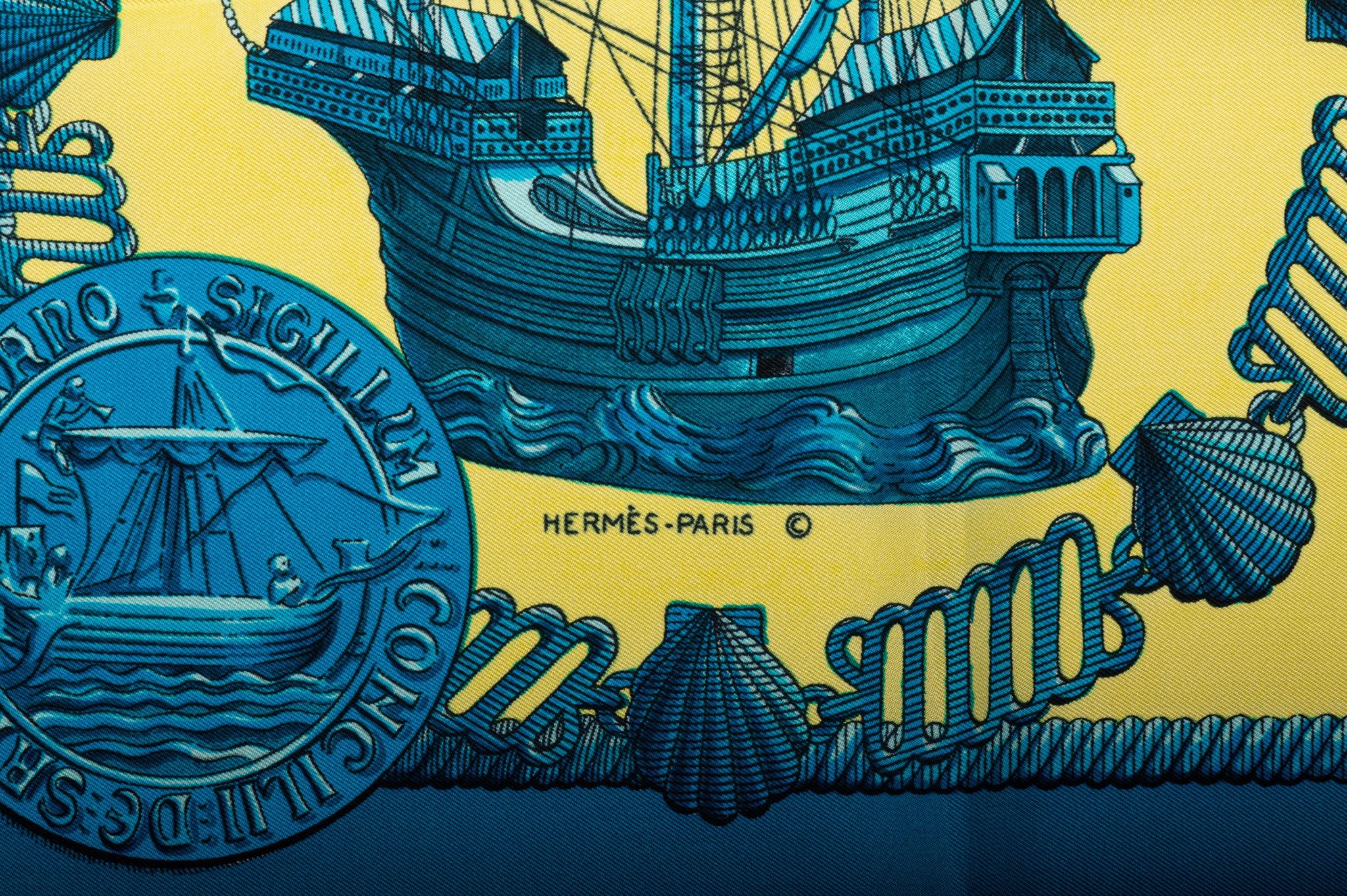 Hermès 100% silk twill Nefs d'Or scarf designed by collectible artist Ledoux. Vibrant blue and yellow colorways. Hand-rolled edges. Does not include box.