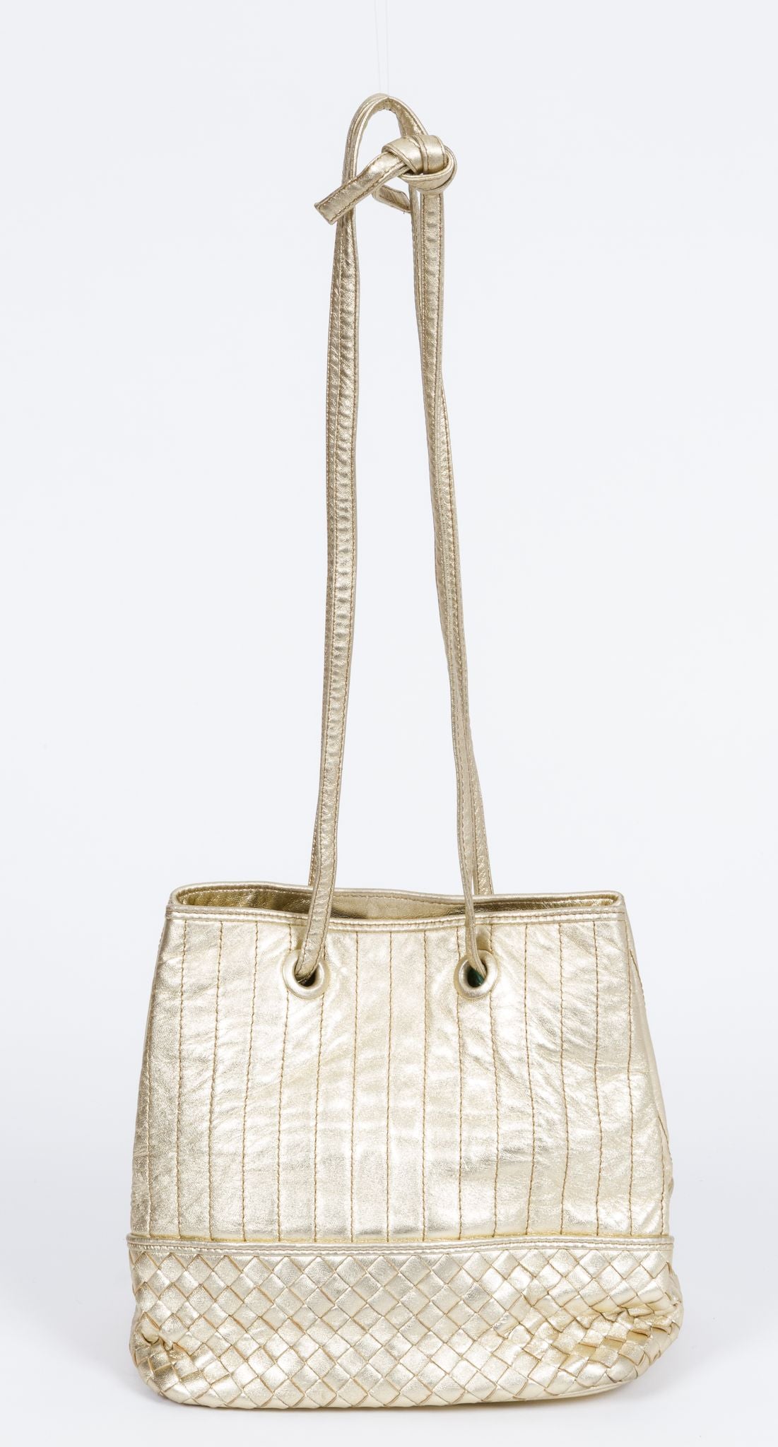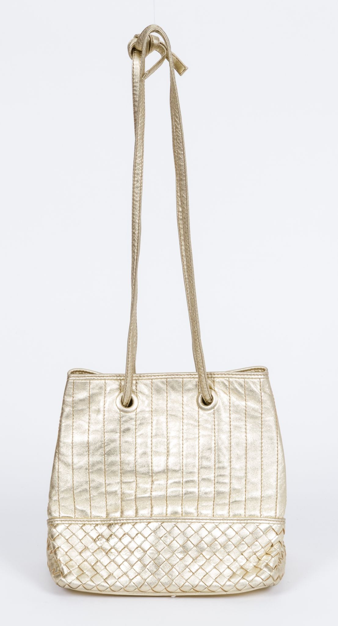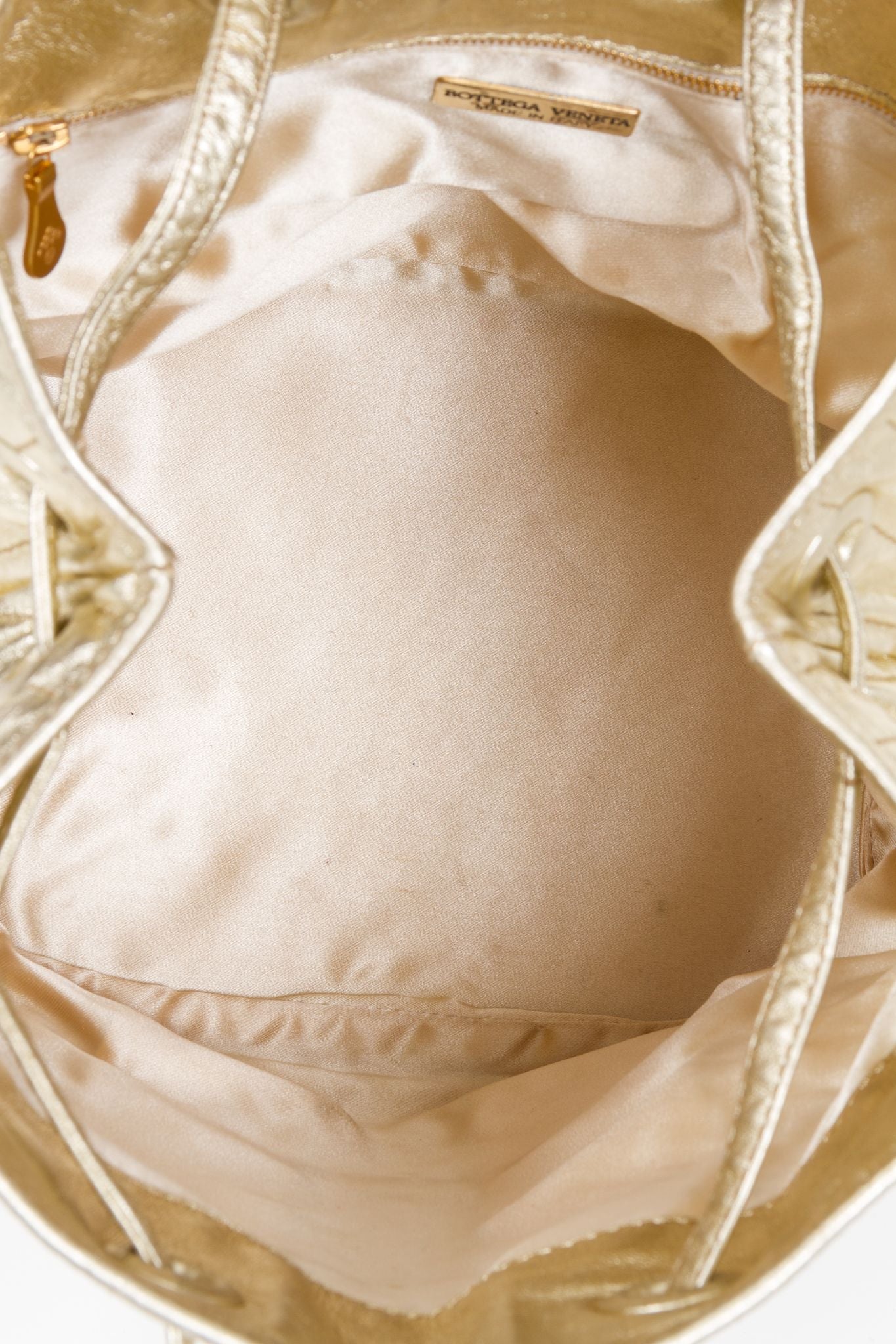 Bottega Veneta handmade in Italy gold woven shoulder tote. Shoulder drop 14". Comes with generic duster.