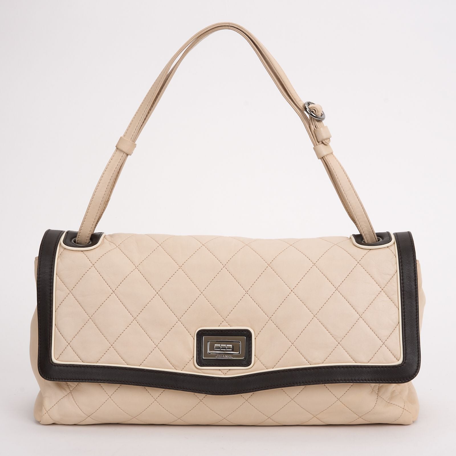 This Chanel 2 tone Lambskin Shoulder Bag from the collection by Karl Lagerfeld, features a neutral lambskin, gunmetal hardware, a canvas trim, a single adjustable shoulder strap, a single exterior pocket, three interior pockets, and turn lock closure. Comes with hologram and original dust cover. The first two numbers of the hologram are 11. Handle Drop - 8.5".