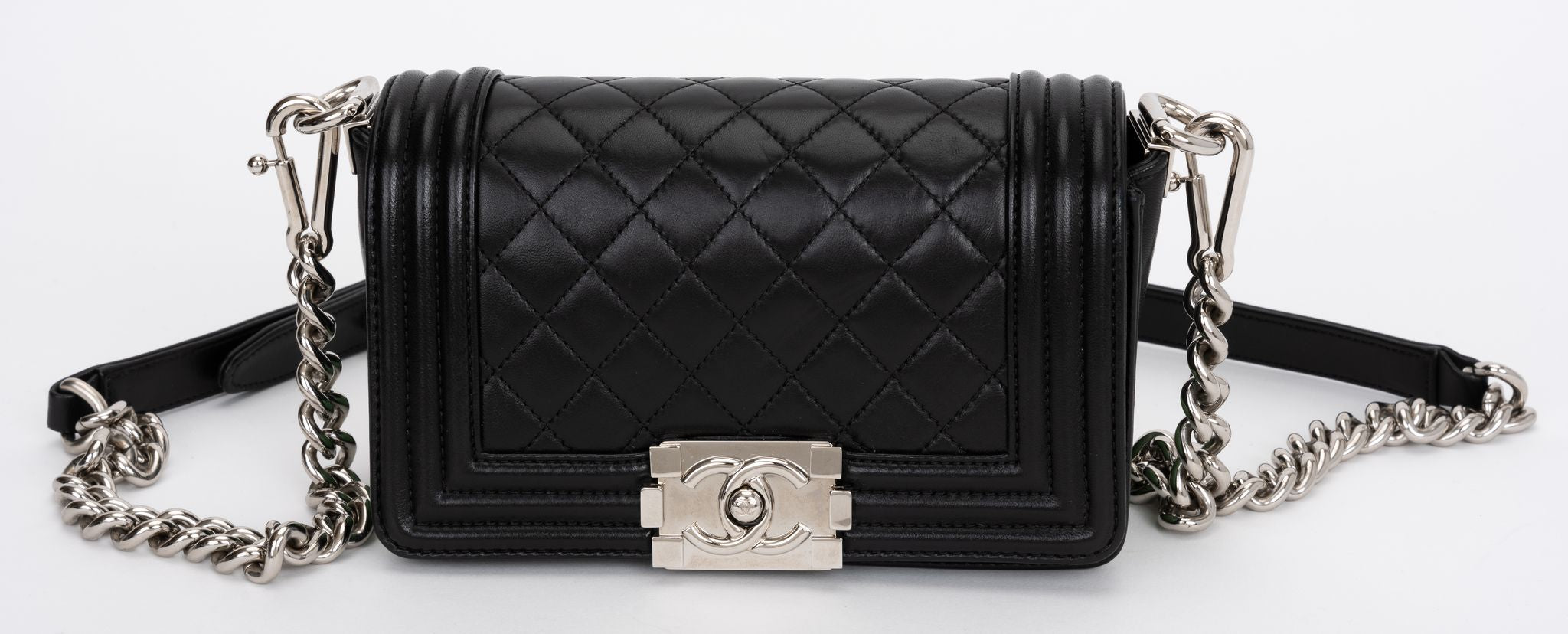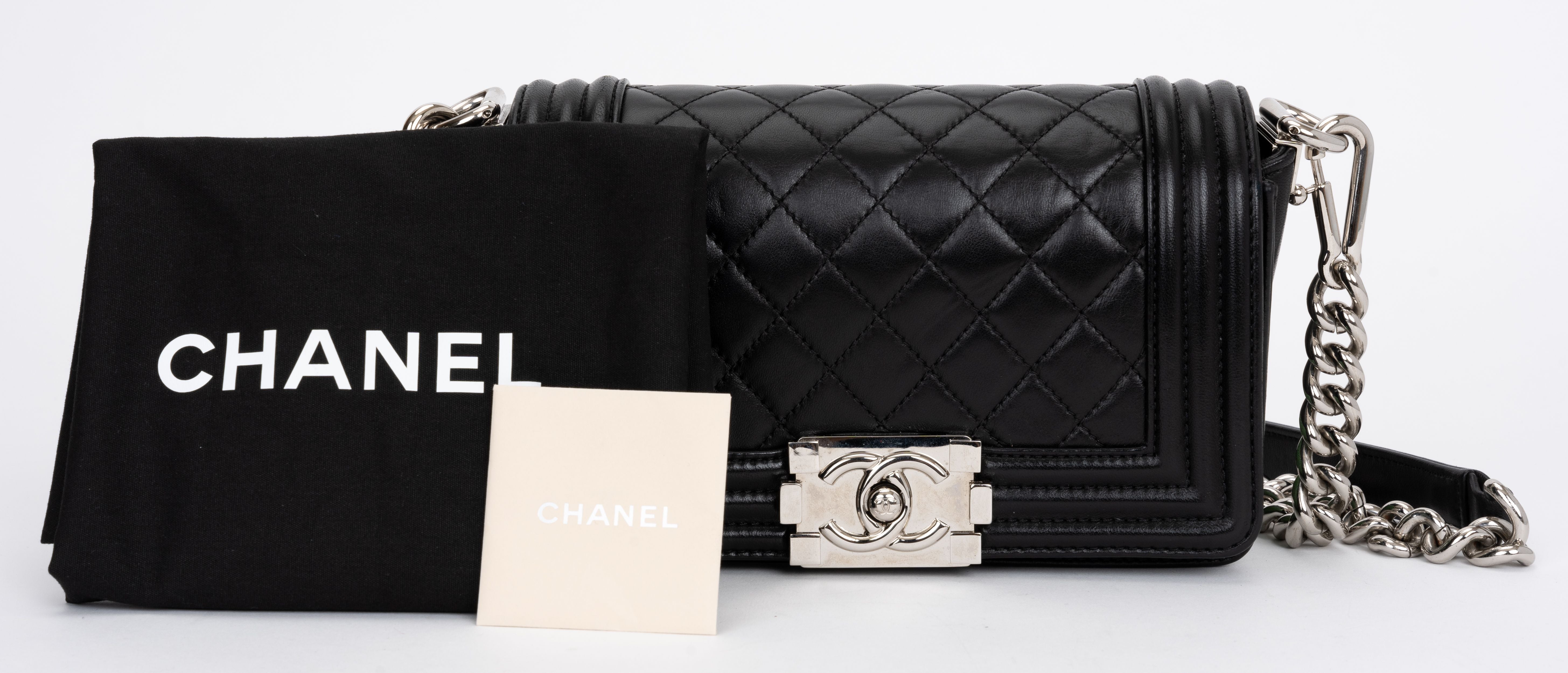 Chanel authentic boy bag small in black quilted lambskin leather , green stingray accents and silver tone hardware. Shoulder drop 23". Collection 17. Comes with hologram , booklet and original dust cover.
