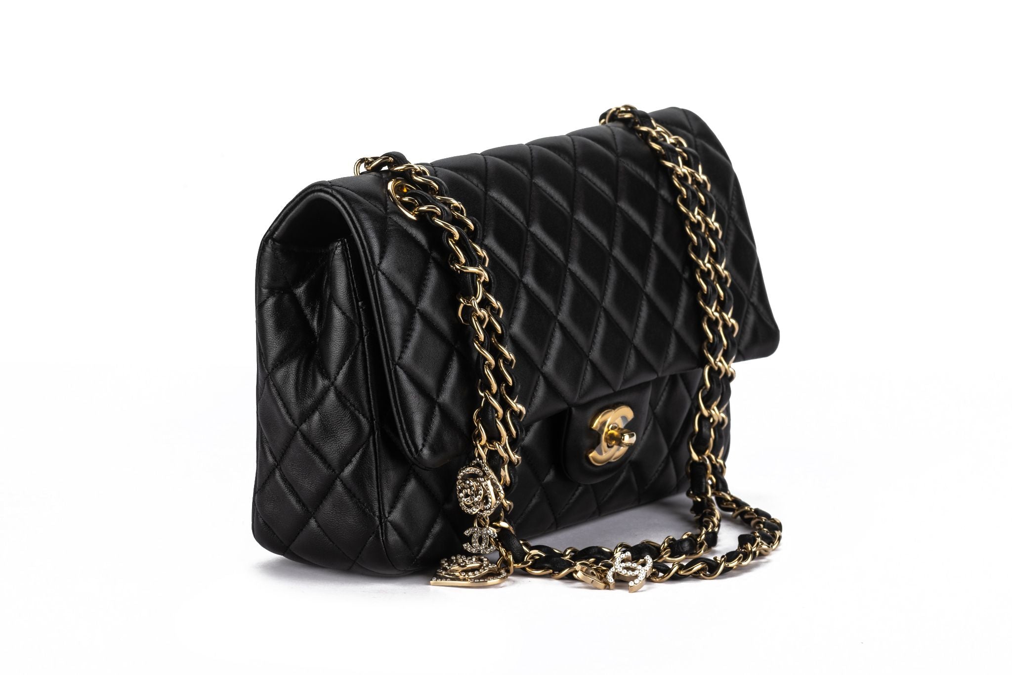 This Chanel Black Lambskin Quilted Valentine Charms Mini Rectangular Flap Bag is a special piece crafted from the finest lambskin leather, goldtone hardware and Chanel charms embellish the leather intertwined strap. The front features a flap top with a CC twist lock. Comes with original dust cover. First two numbers 19.