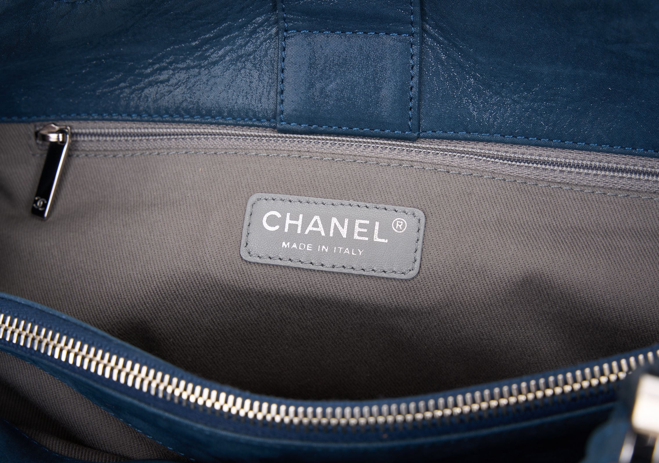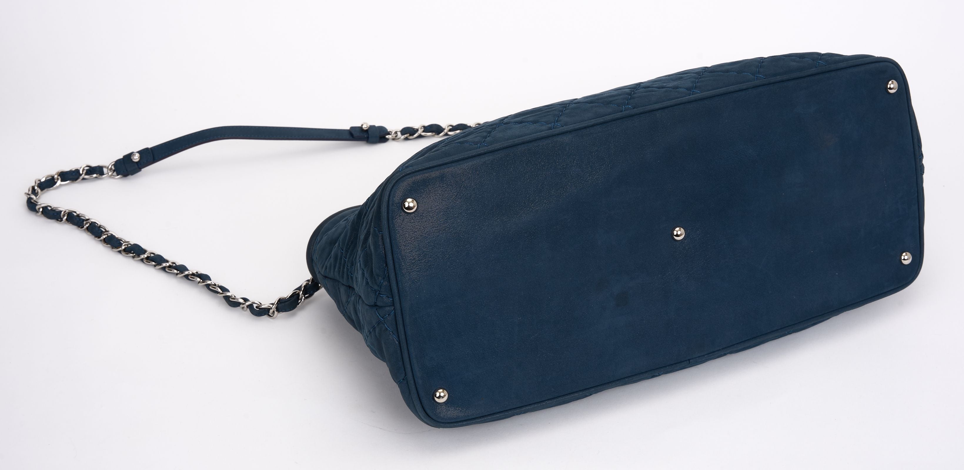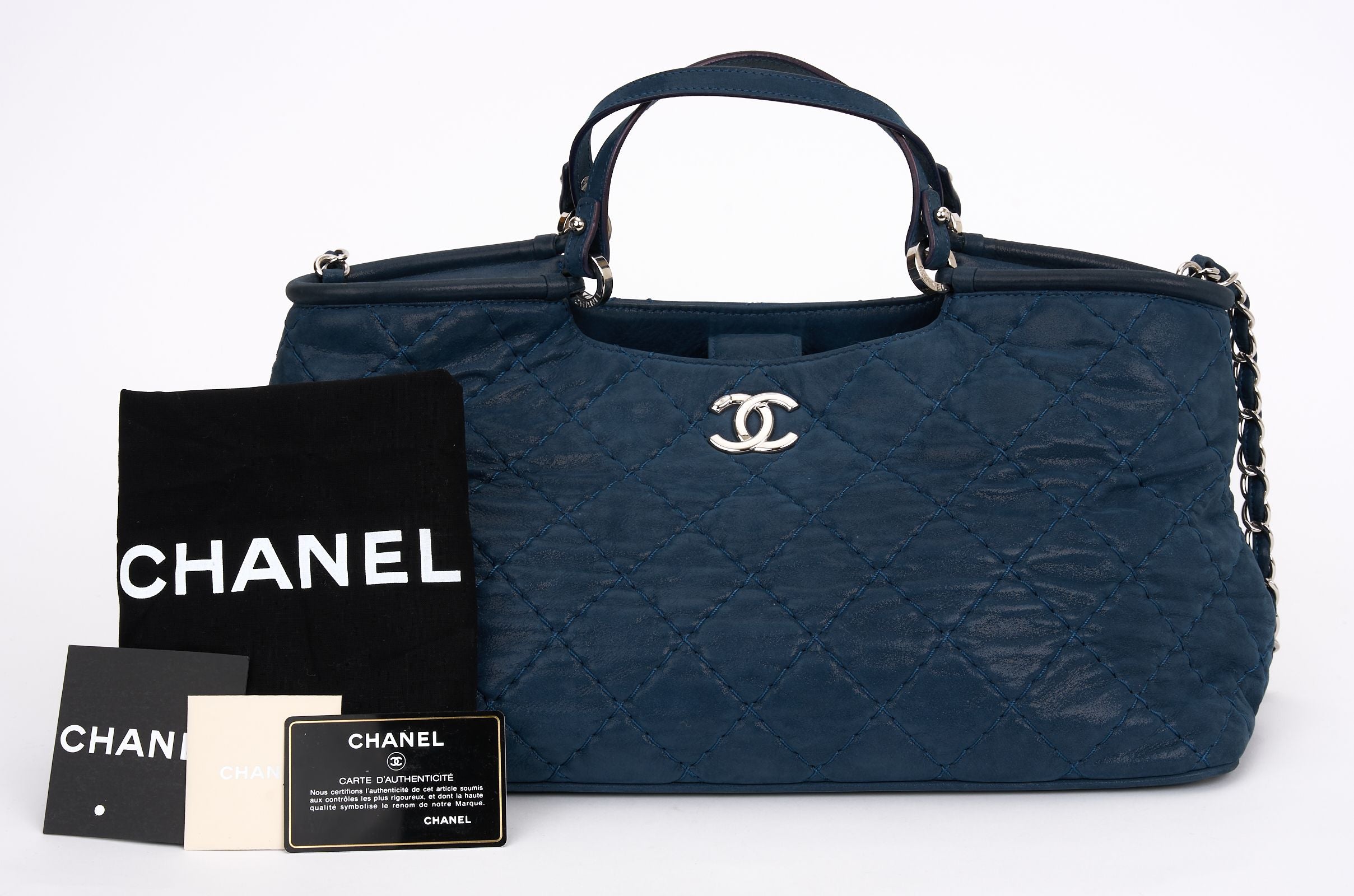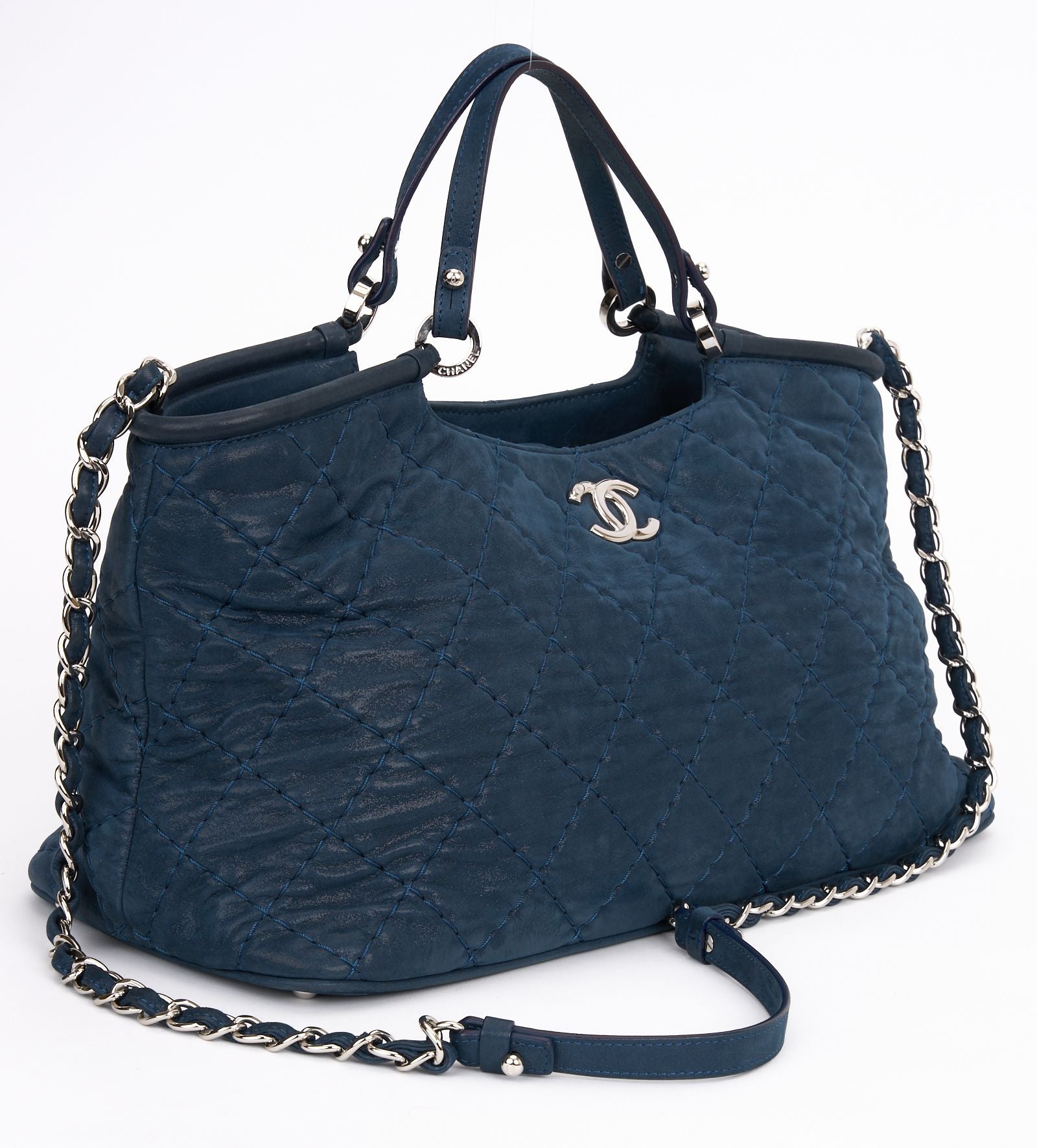 This Chanel CC Sea Hit Tote Quilted Iridescent Calfskin is a stylish tote and an ideal everyday bag. Features navy quilted iridescent calfskin, leather strap top handles, leather shoulder strap with woven-in leather chain detail, silver-tone Chanel CC logo at front, protective base studs, and silver-tone hardware accents. Dust cover and ID card included. Hologram first two numbers are 16. Strap Drop- 20" Handle Drop - 5.5".