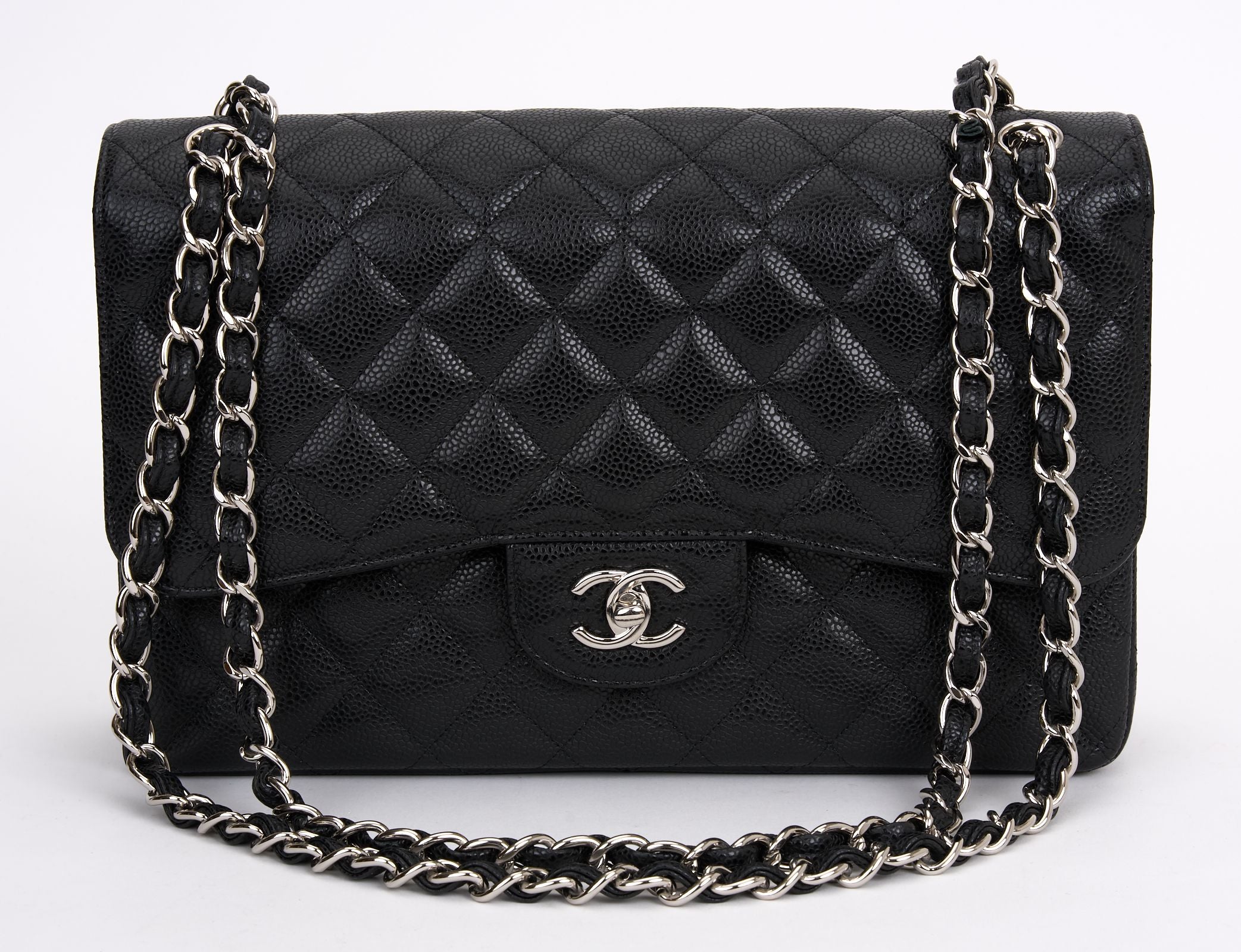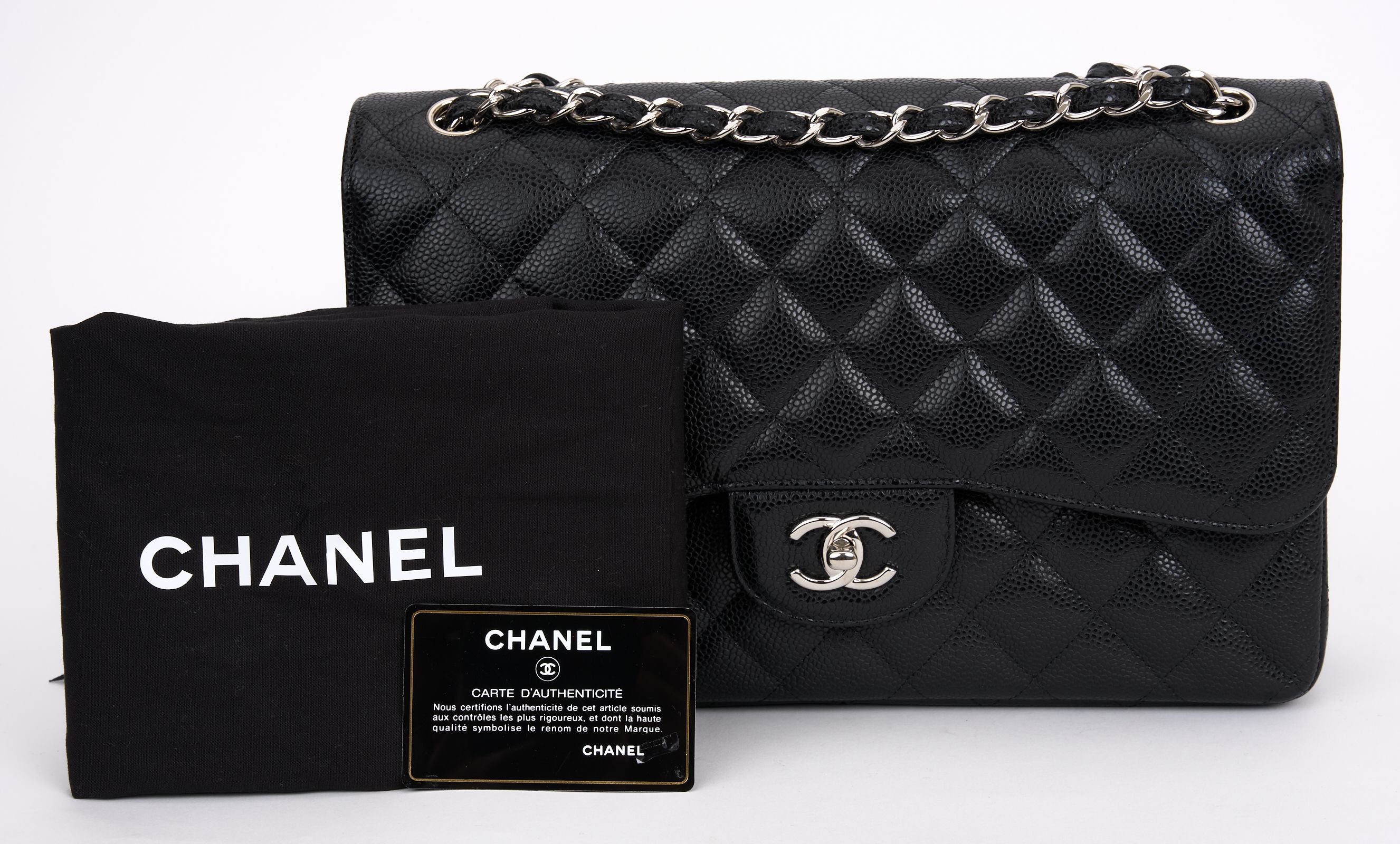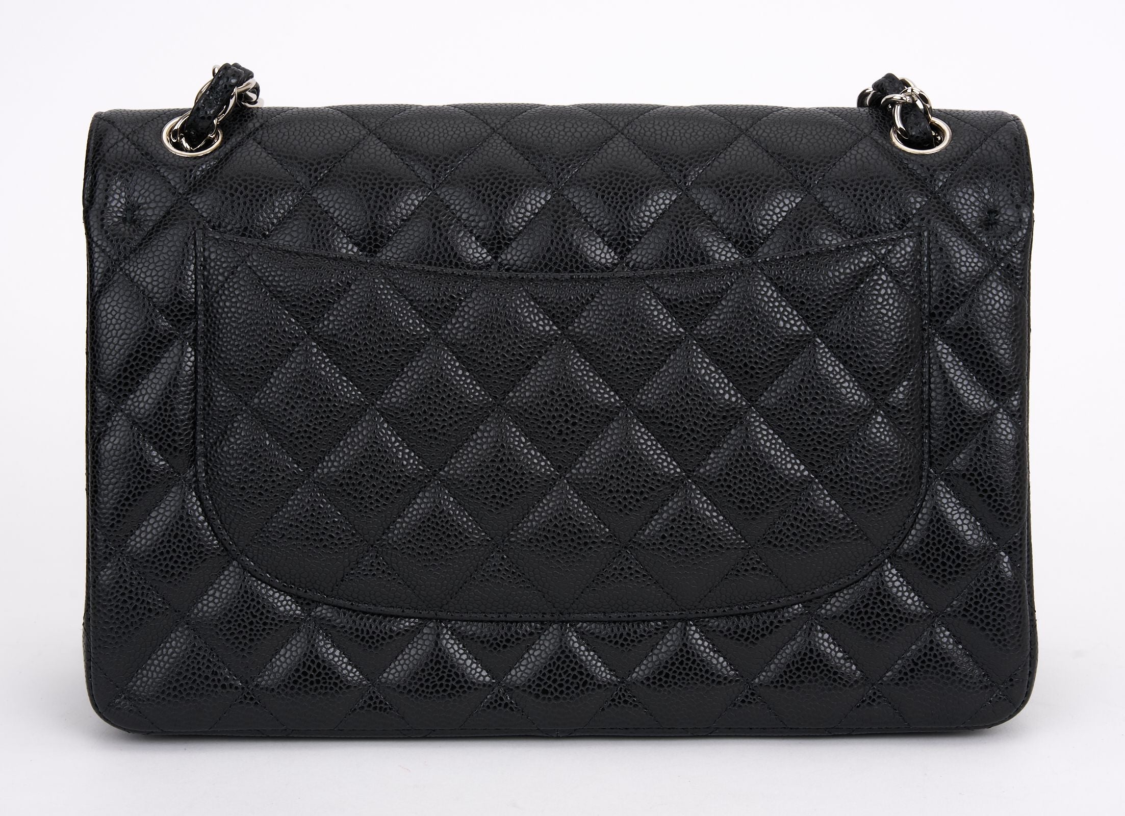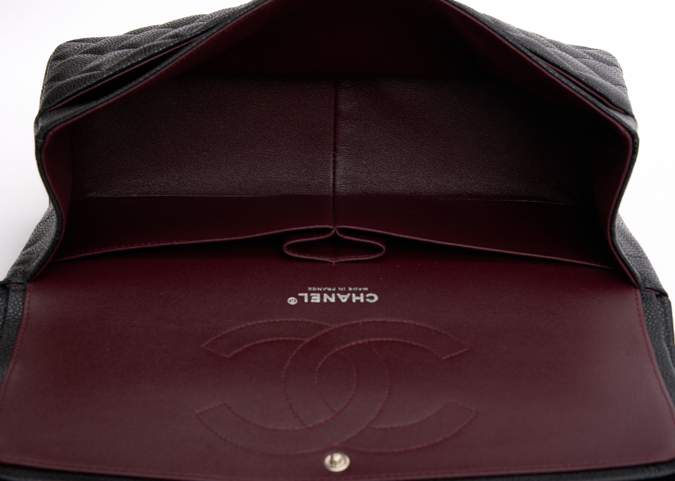 This Jumbo Classic Double Flap bag is in black caviar leather with silver-tone hardware. It features a front flap with the signature CC turn-lock closure, a half-moon back pocket, and an adjustable interwoven gold-tone chain link and black leather shoulder strap. The interior is lined in burgundy leather. Dust Cover and ID card included. Hologram's first two numbers are 12.