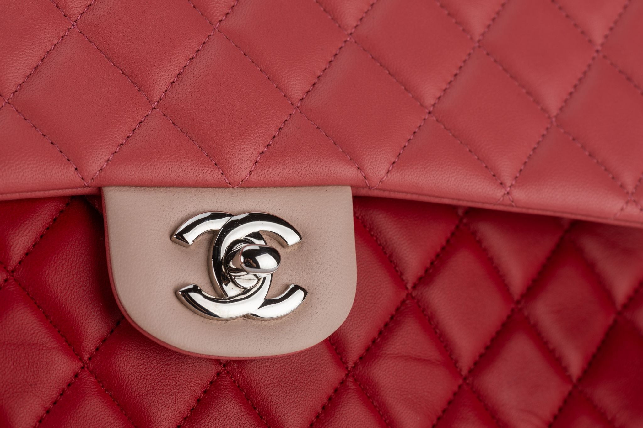 This Chanel medium classic single-flap bag is a tri-color bag in Pale Pink, Hot Pink and Red quilted lambskin leather with silvertone hardware and features, a front flap with signature CC turn-lock closure, and a half moon back pocket and an adjustable interwoven strap of Pink leather chain link shoulder/crossbody strap with silver crystal and faux pearl charms. Comes with an original dust cover and authenticity card. First two numbers 19.