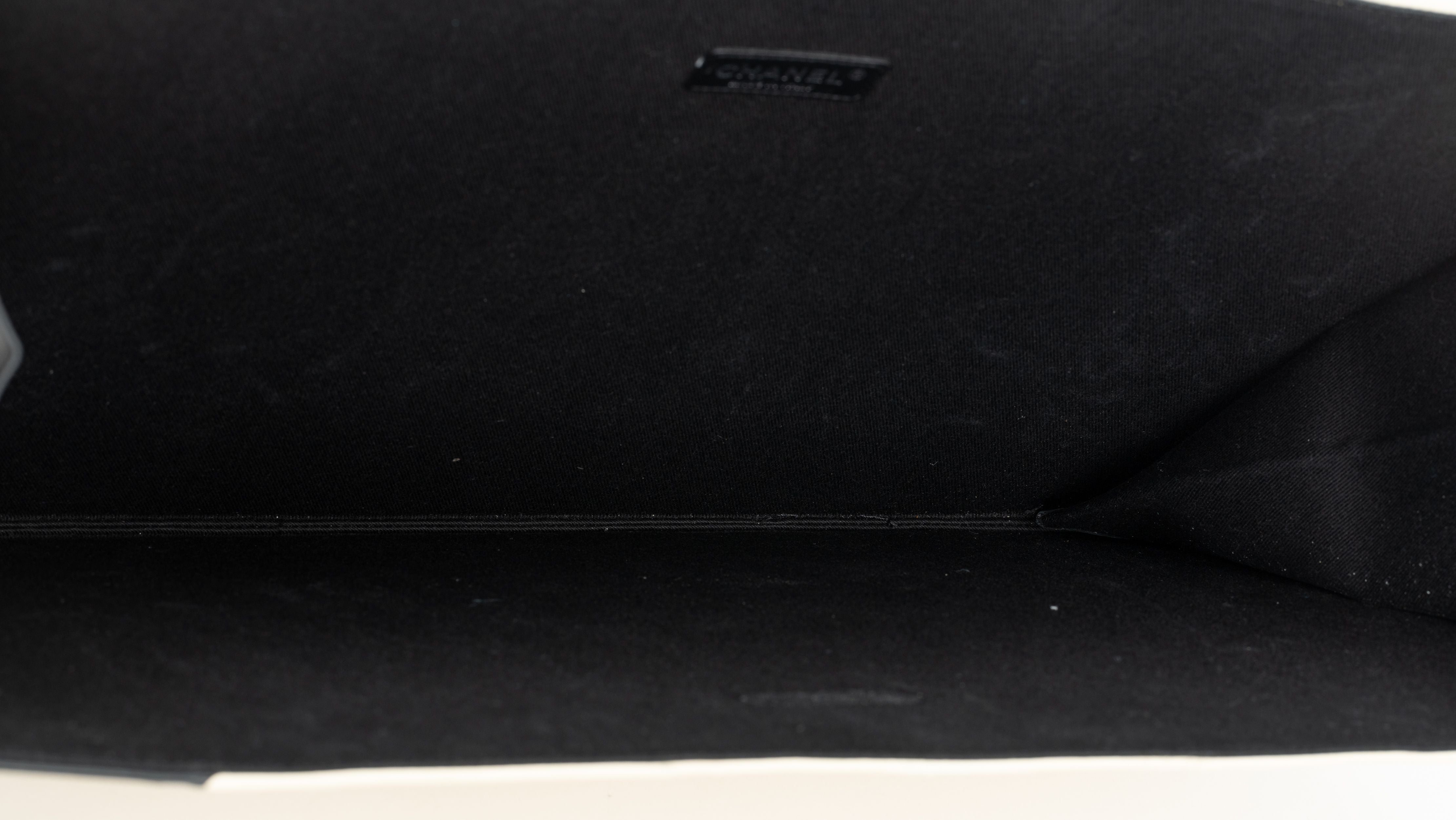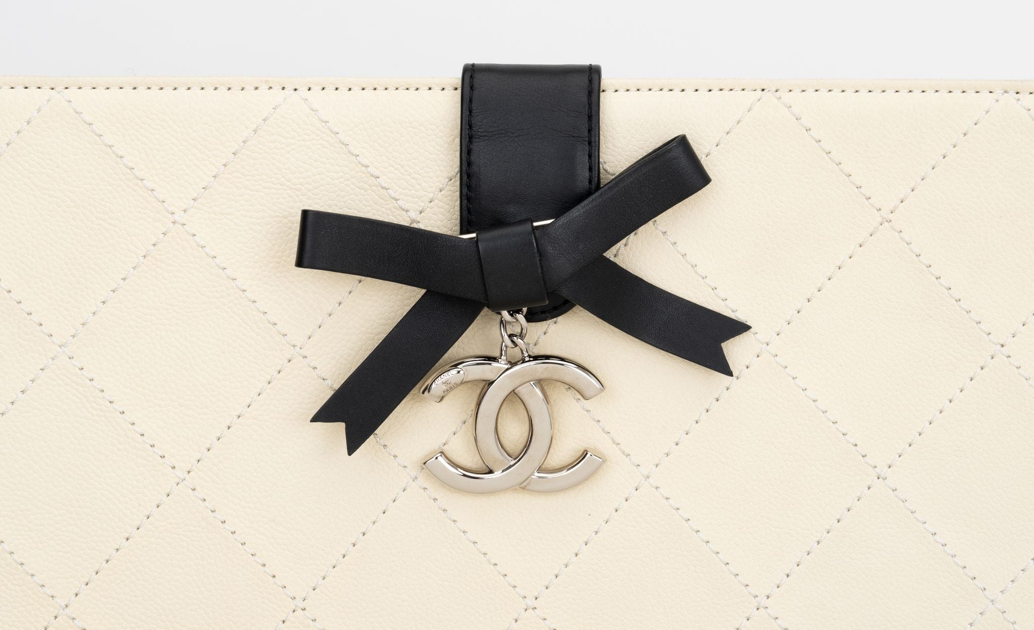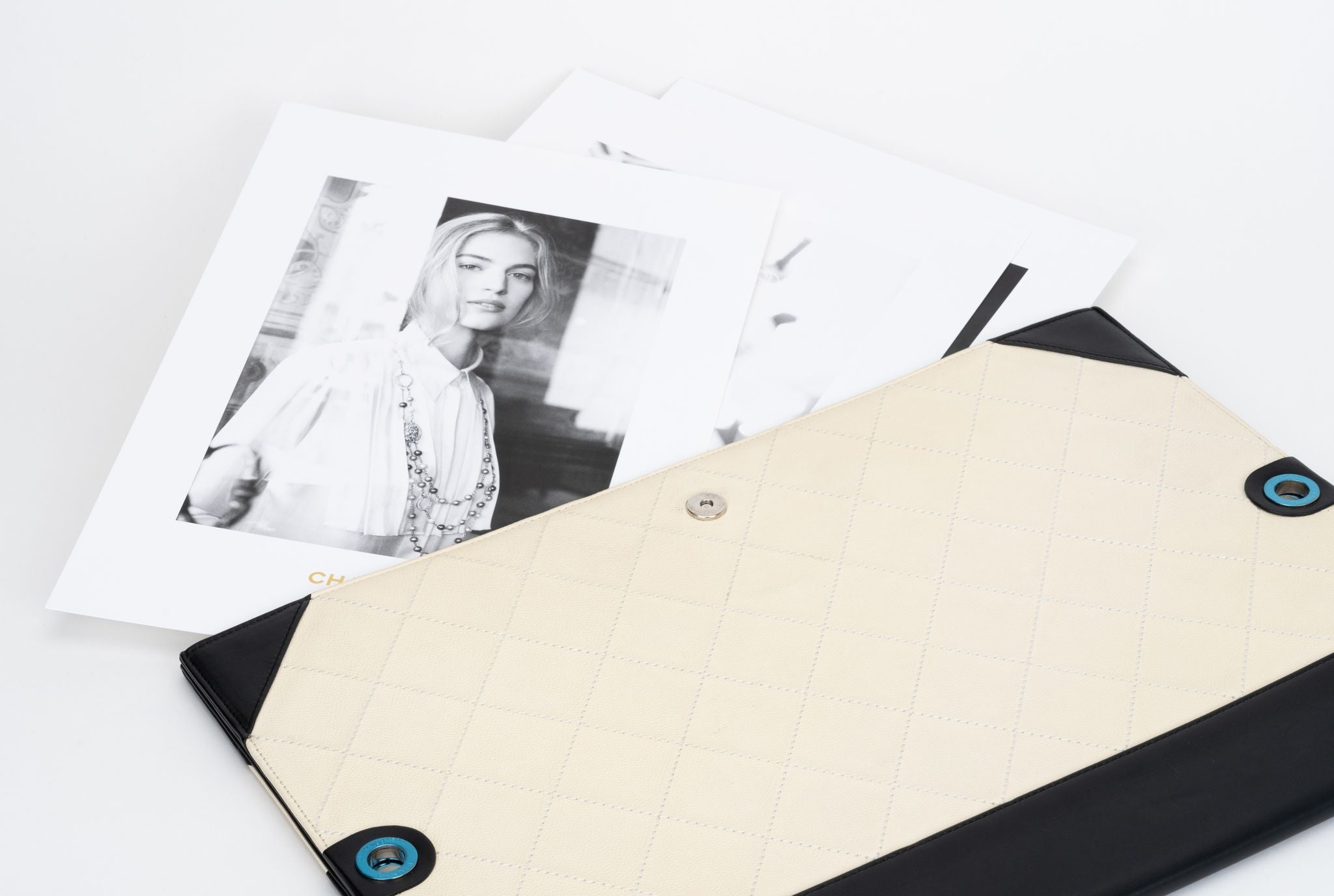 Chanel spring 2014 runway flat quilted portfolio clutch. White leather with black detail and interiors. Silver hardware with plastic on it. Collection 19. Comes with hologram and original dust cover. Photos not included.