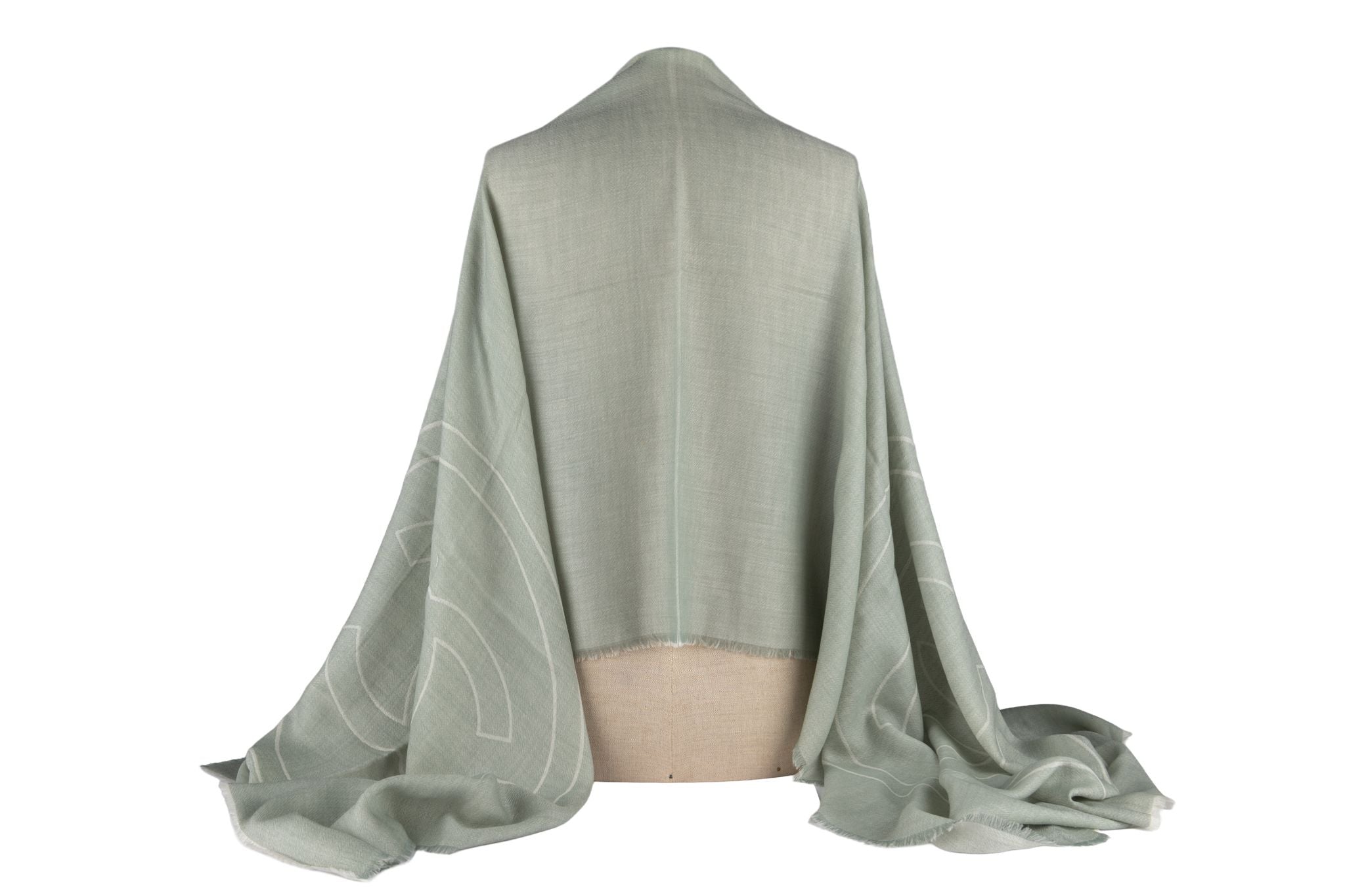 This Chanel CC Logo Cashmere Scarf is in a light water green with cream CC Logo detail. Measuring 78" x 28 " the shawl is versatile from day to night.