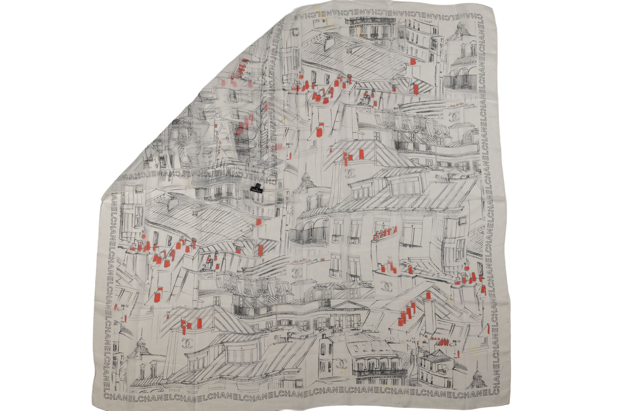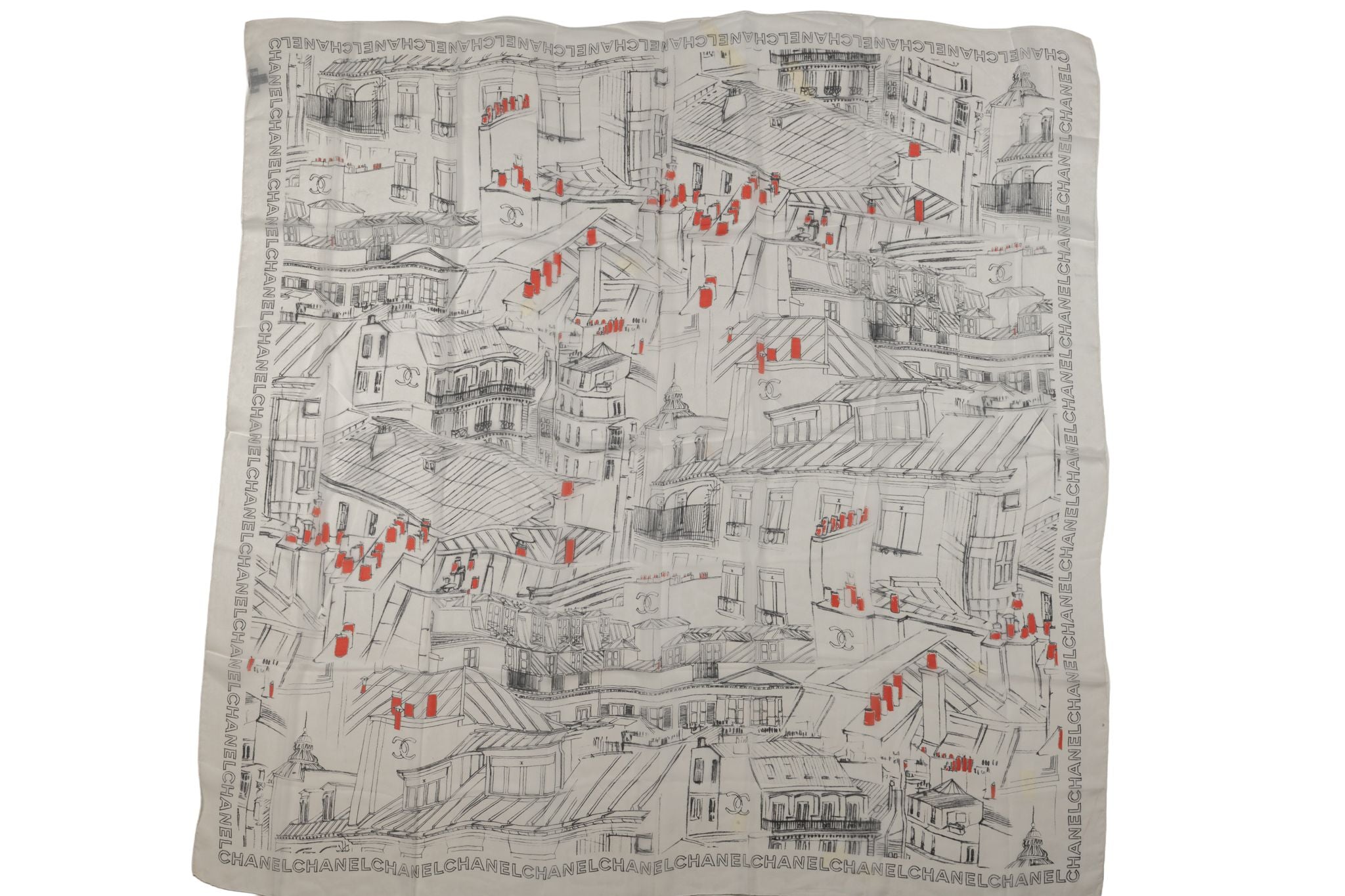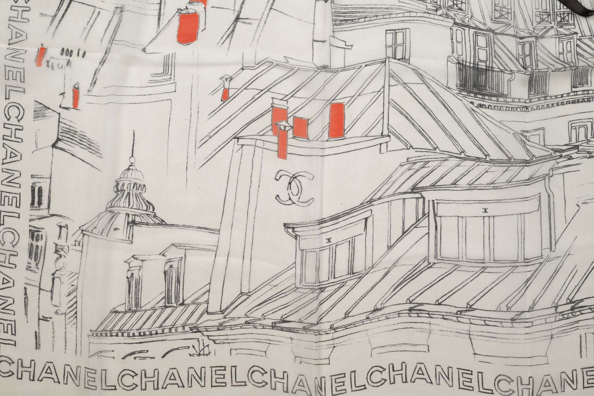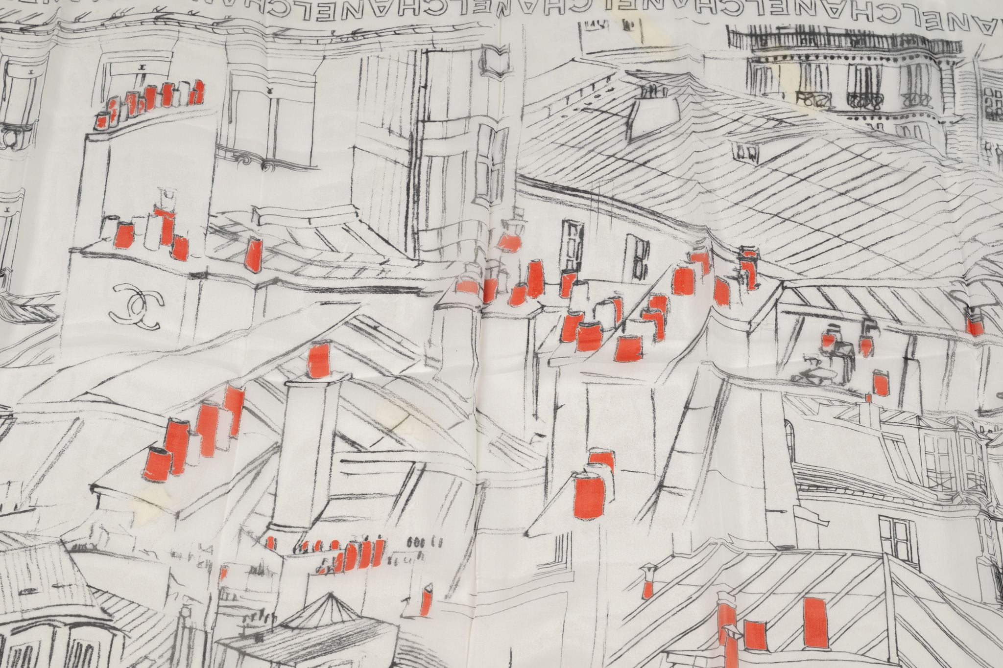 This Chanel CC Roof Scarf in White and Black is crafted of 100% cashmere. The scarf features a black and white design of Paris rooftops with a Chanel CC logo designs throughout the scarf.
