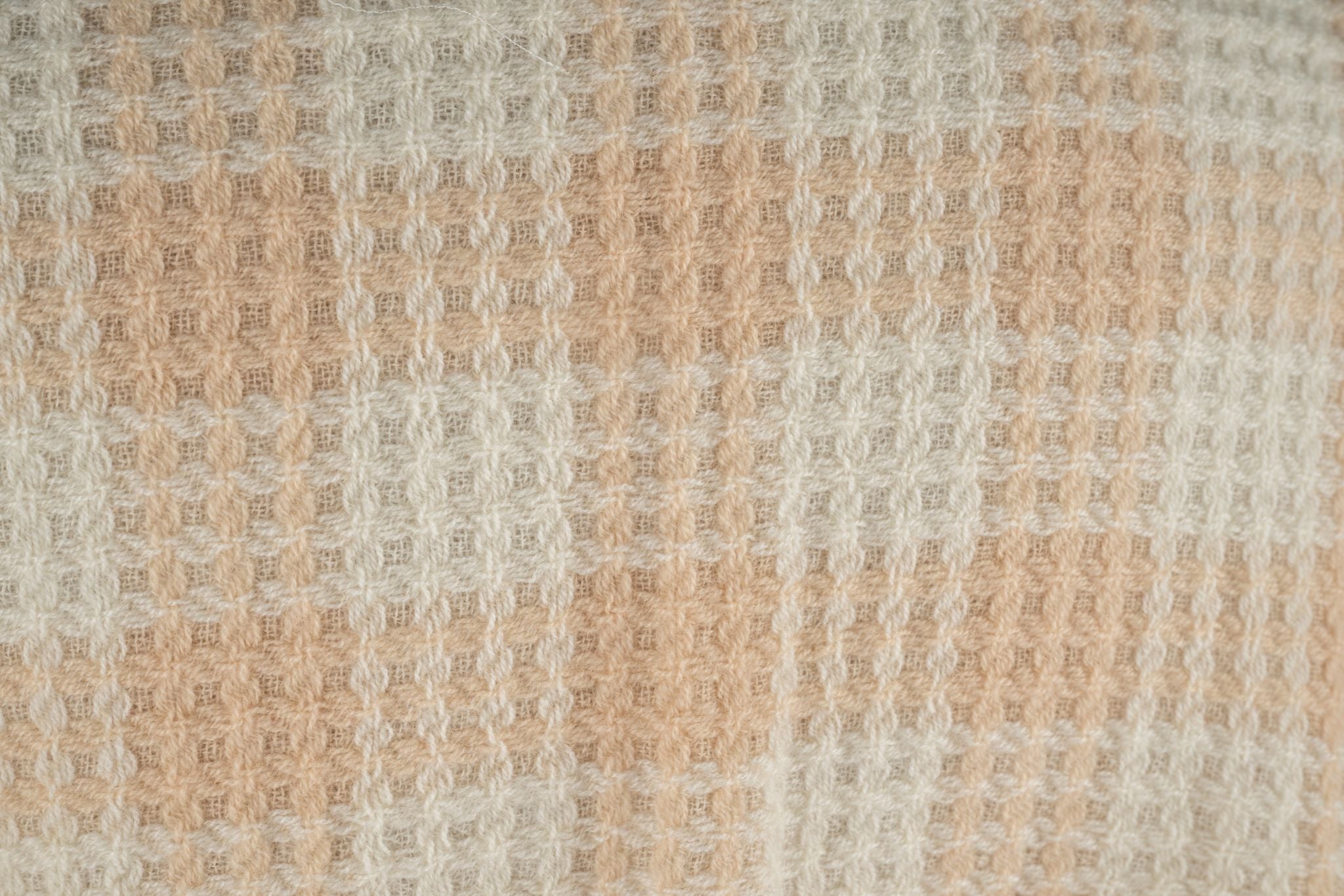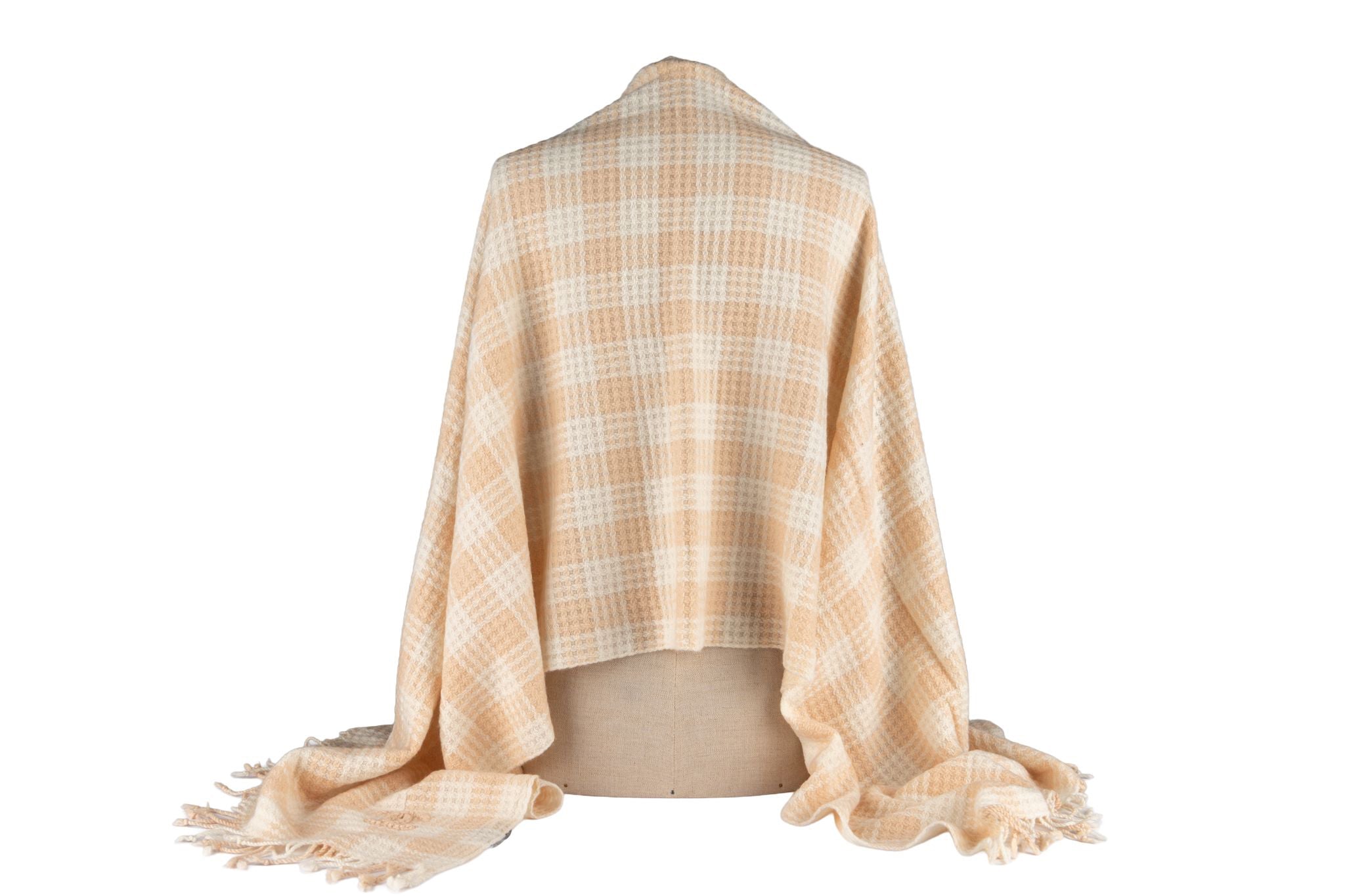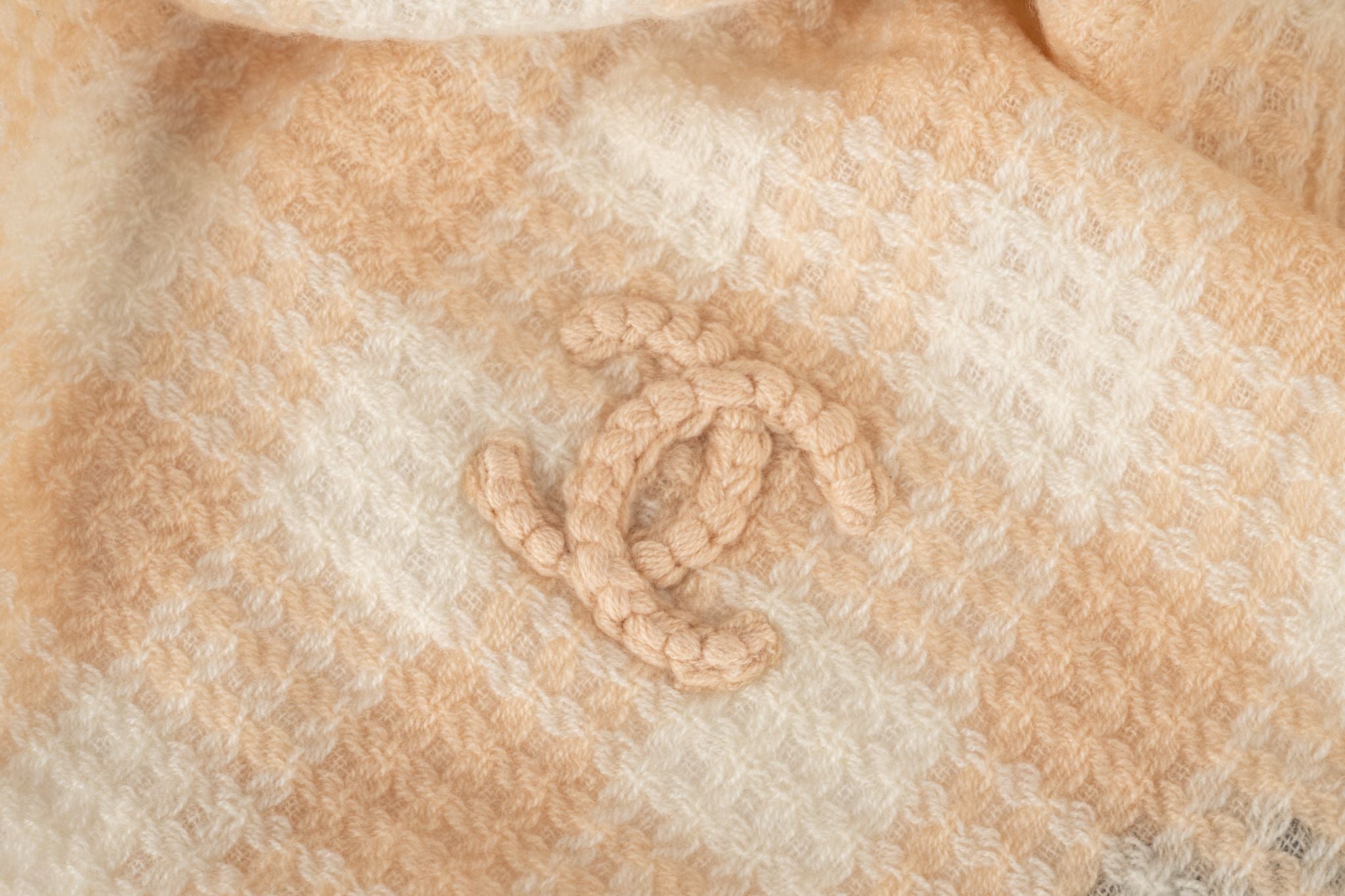 This Chanel Cashmere Scarf is in 100% cashmere with checkerboard print and features an interlocking CC embellishment. Peach and cream color combination. Brand new in unused condition.