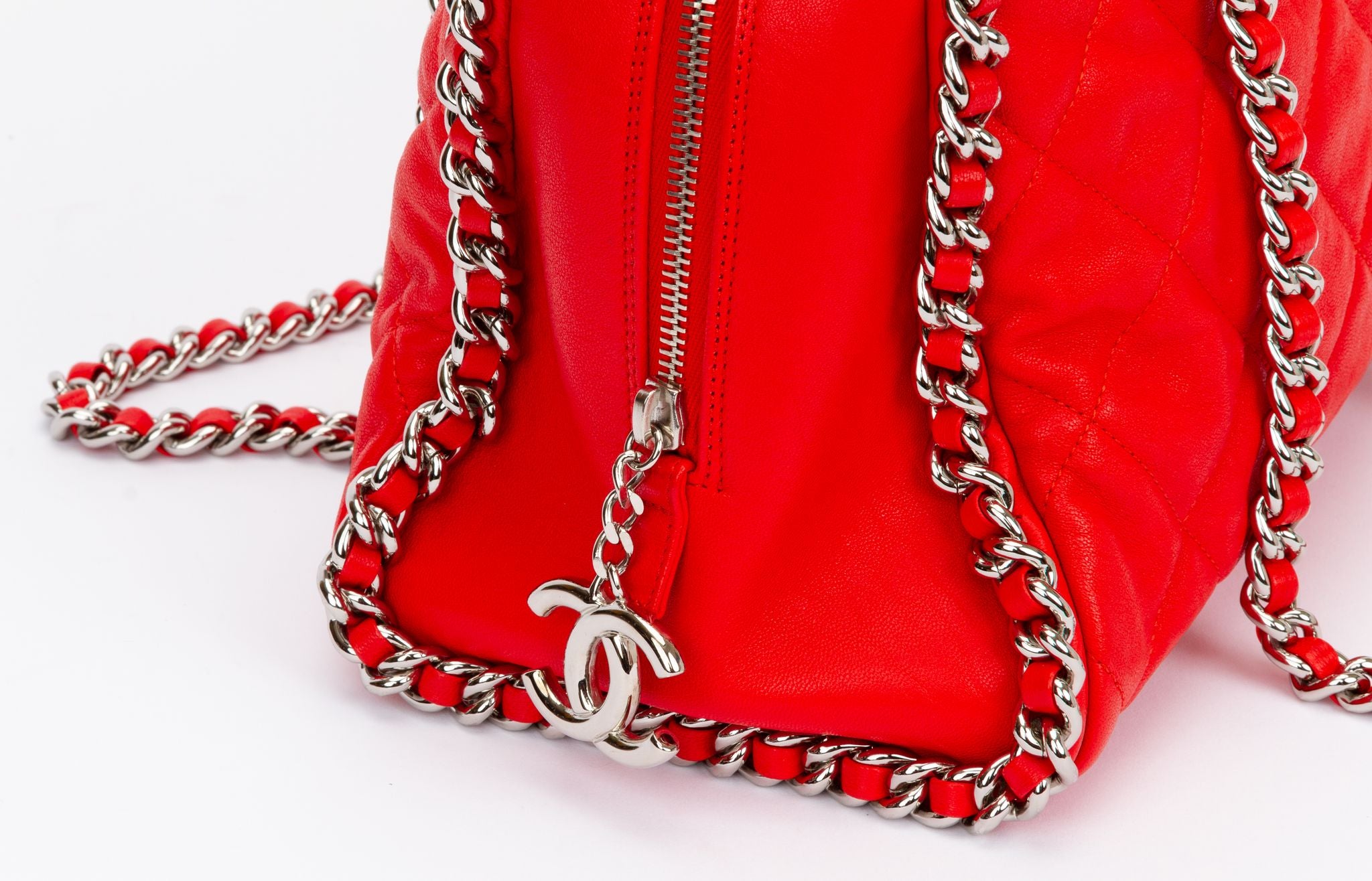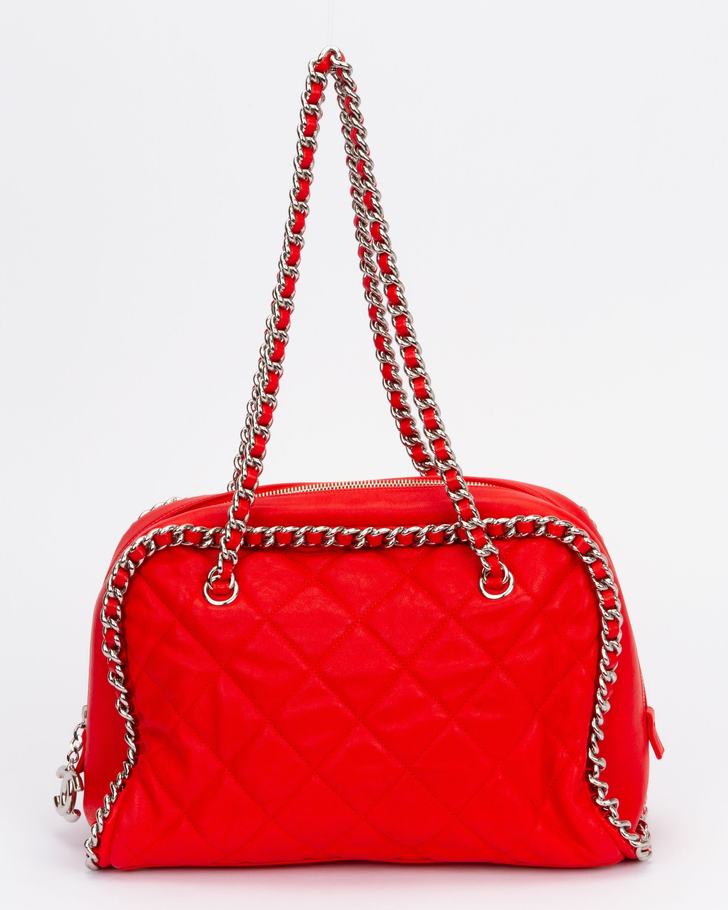 Chanel red Lambskin mint chain around shoulder zipped bag with silver tone hardware. Collection 15. Includes original key holder, card and dust cover.