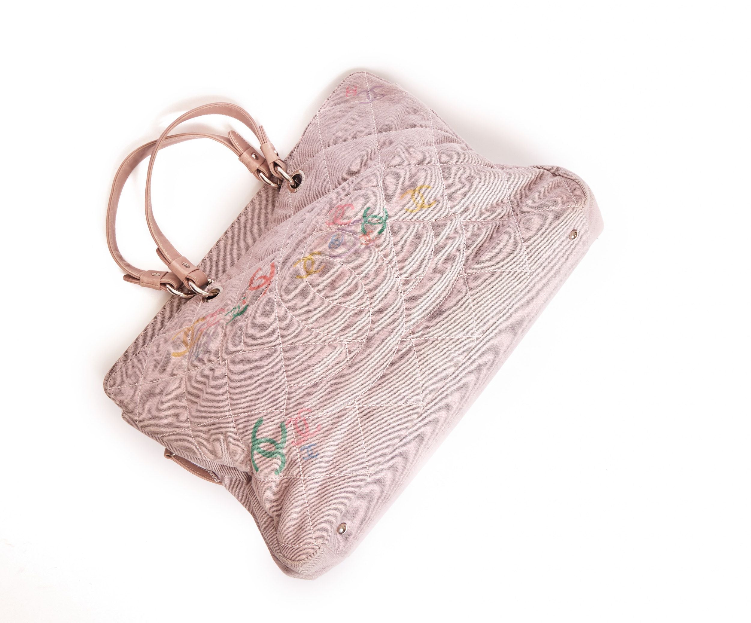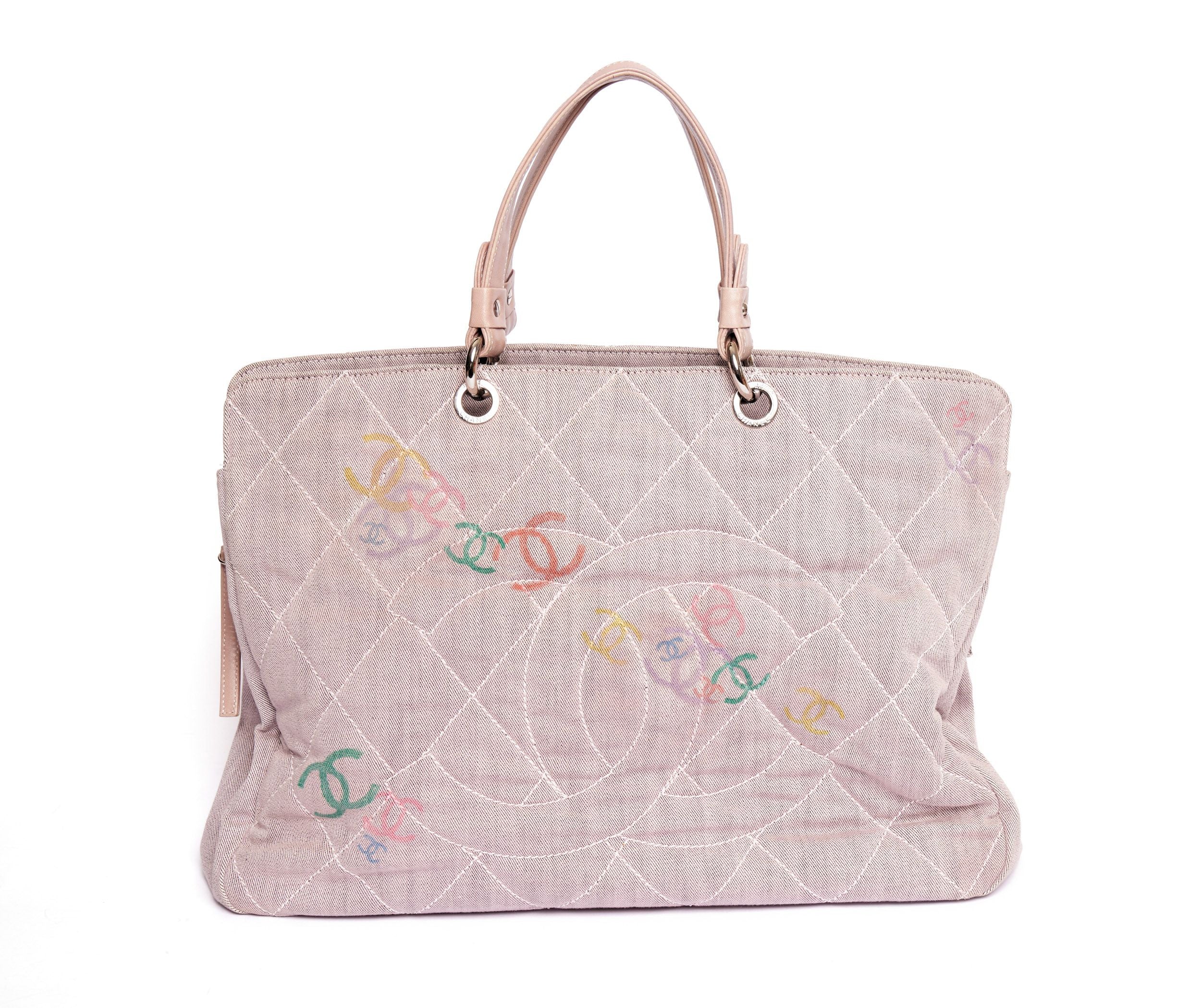 Chanel denim tote bag with a costume design in blush pink.The bag came originally only with the big CC logo stitched on the front of the bag. The designer put multiple CC logos in different colors on the bag. The interior is fabric and has two compartments. In the middle is a zip pocket as well as on the back side of the inside bag. The handles are made out of Lambskin leather (6’ drop) and the hardware is silver.