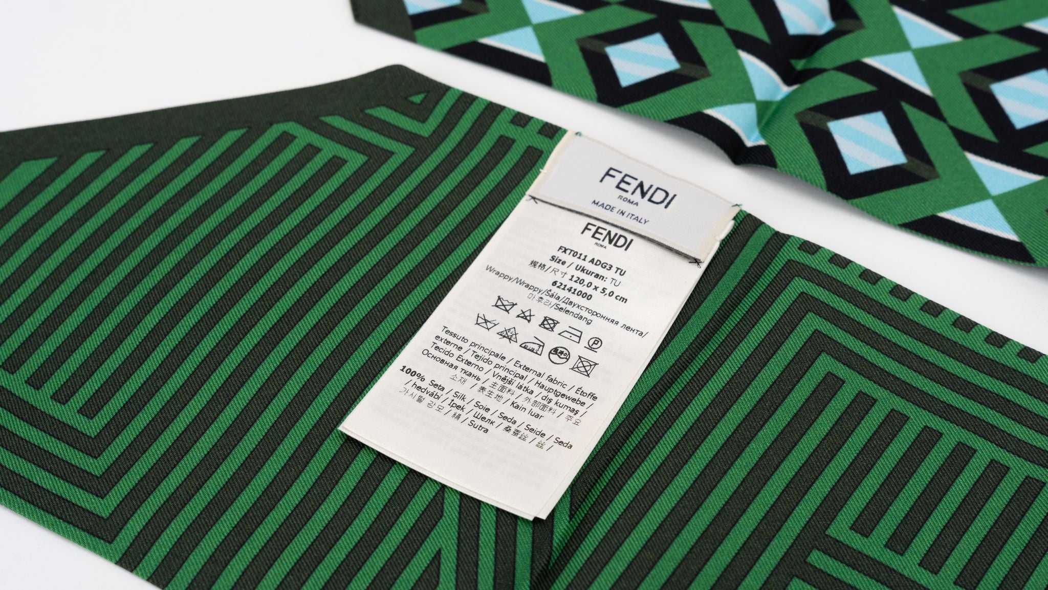 Fendi green black celeste optical 100% Silk maxi Twilly. Reversible pattern, versatile scarf. Brand new in unused condition.
