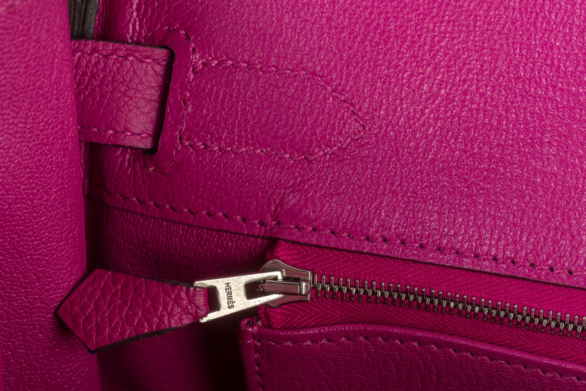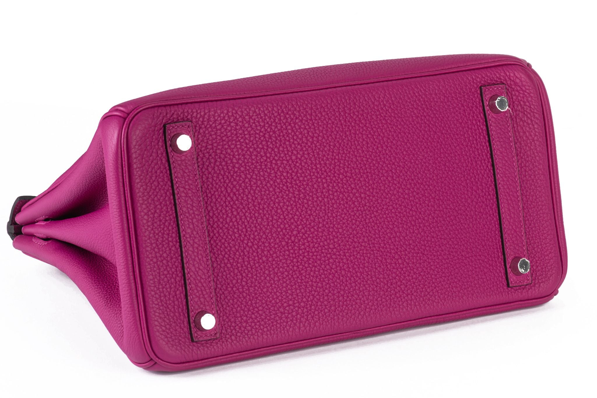 This Birkin 30 in Rose Pourpre is featured in a classic togo leather. The bag features rolled leather top handles and palladium hardware.The top opens to a matching goatskin leather interior with zipper and patch pockets. Mint condition. First letter A. Comes with rain protection and original dust bag.