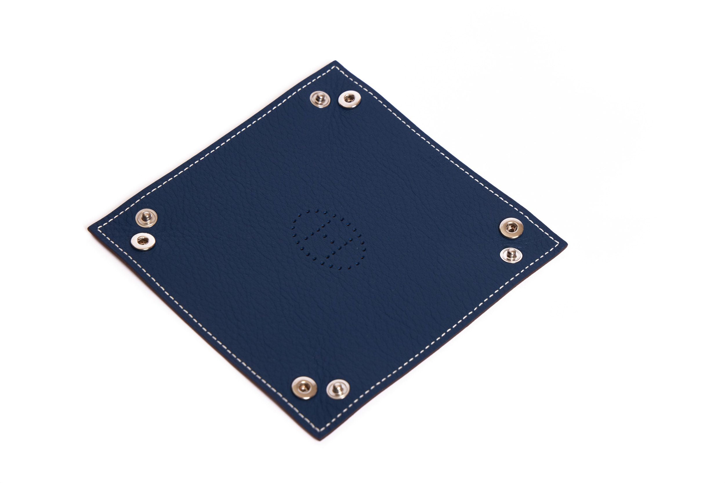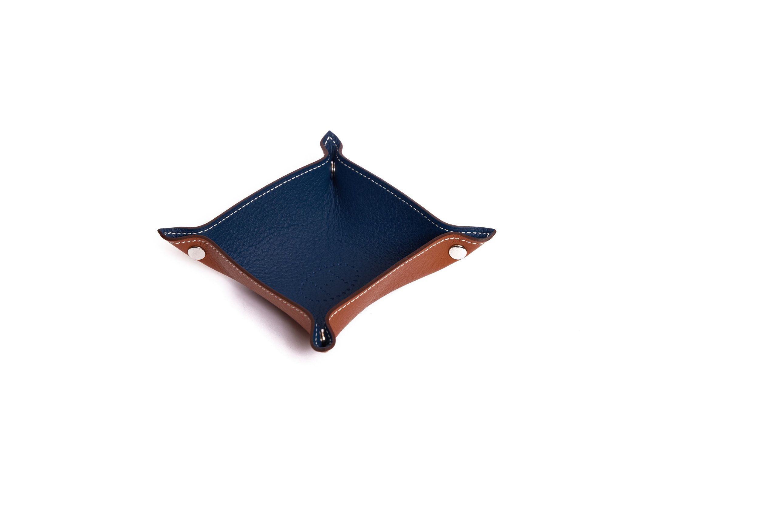 Hermès catch all desk tray in blue and brown leather. The "Evelyne H" is stamped on the brown leather. For cleaning you can open the edges with the snap closures which are in palladium-plated brass. It comes with the original box and ribbon.