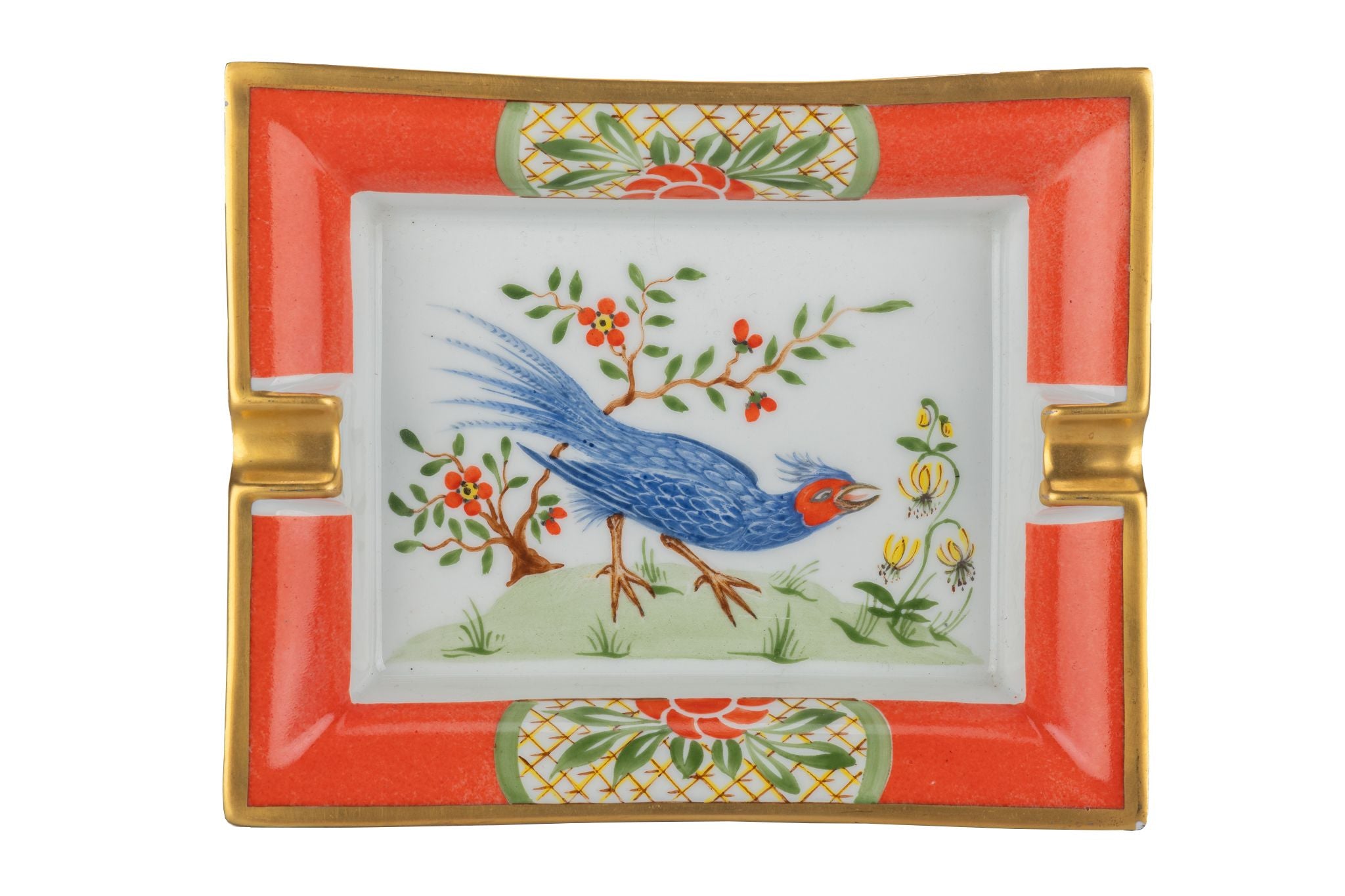 This Hermès signature ashtray with blue bird design in orange and gold. Suede stamped bottom. Made in France. Special edition with bottom foil. No box.