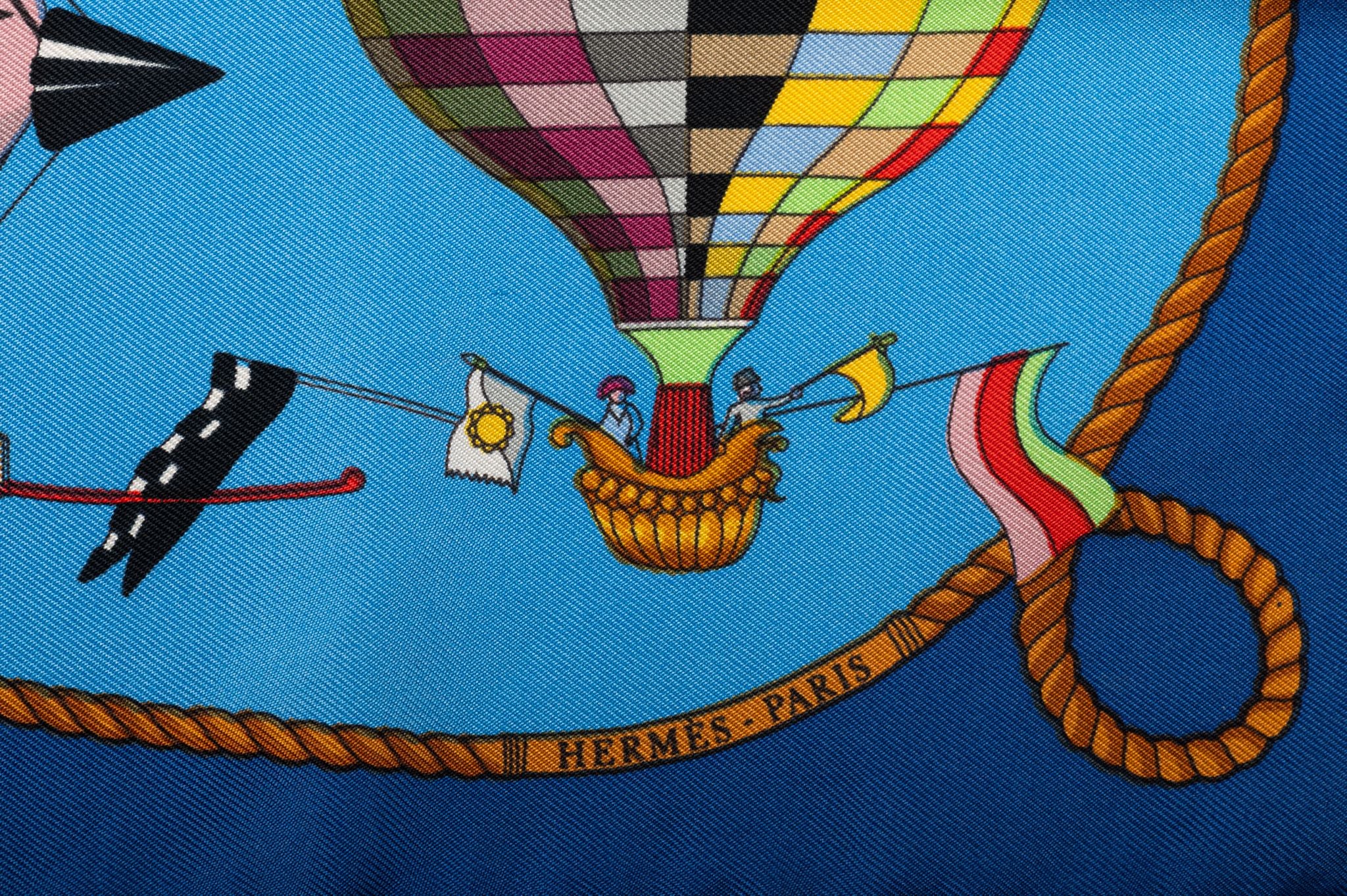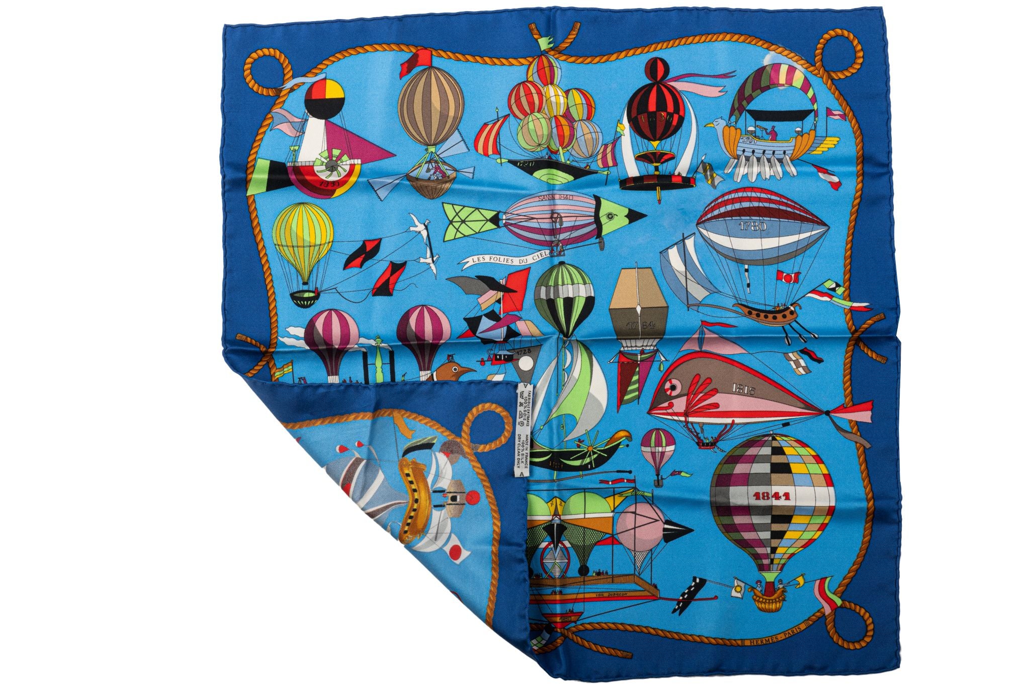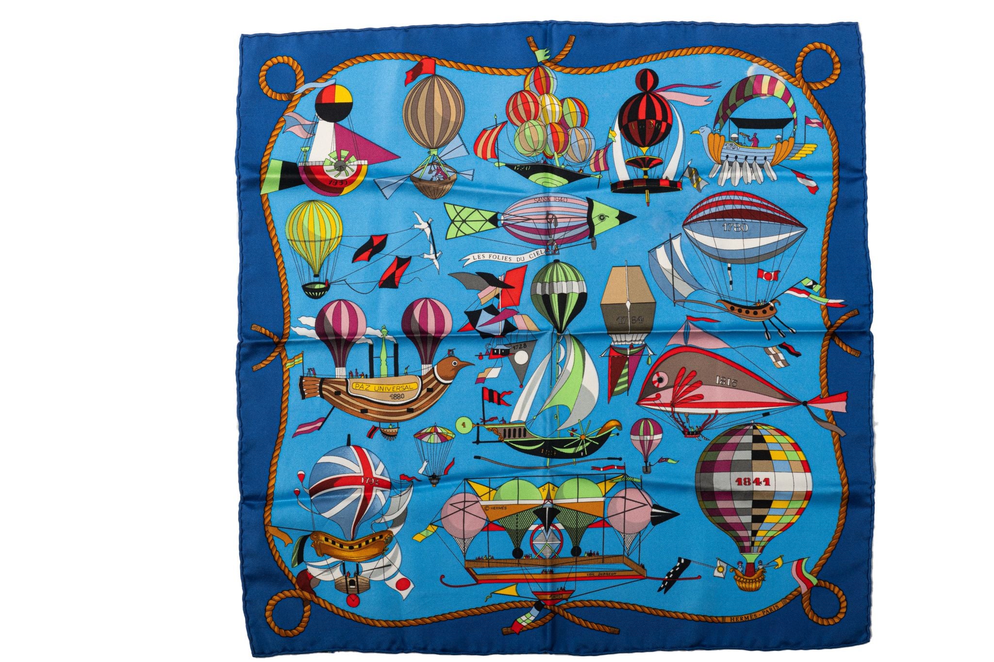Hermès silk twill Les Folies du Ciel scarf designed by Loic Dubigeon. Issued in 1984. Vibrant blue and turquoise color ways. Hand-rolled edges. Does not include box. Minor wear.