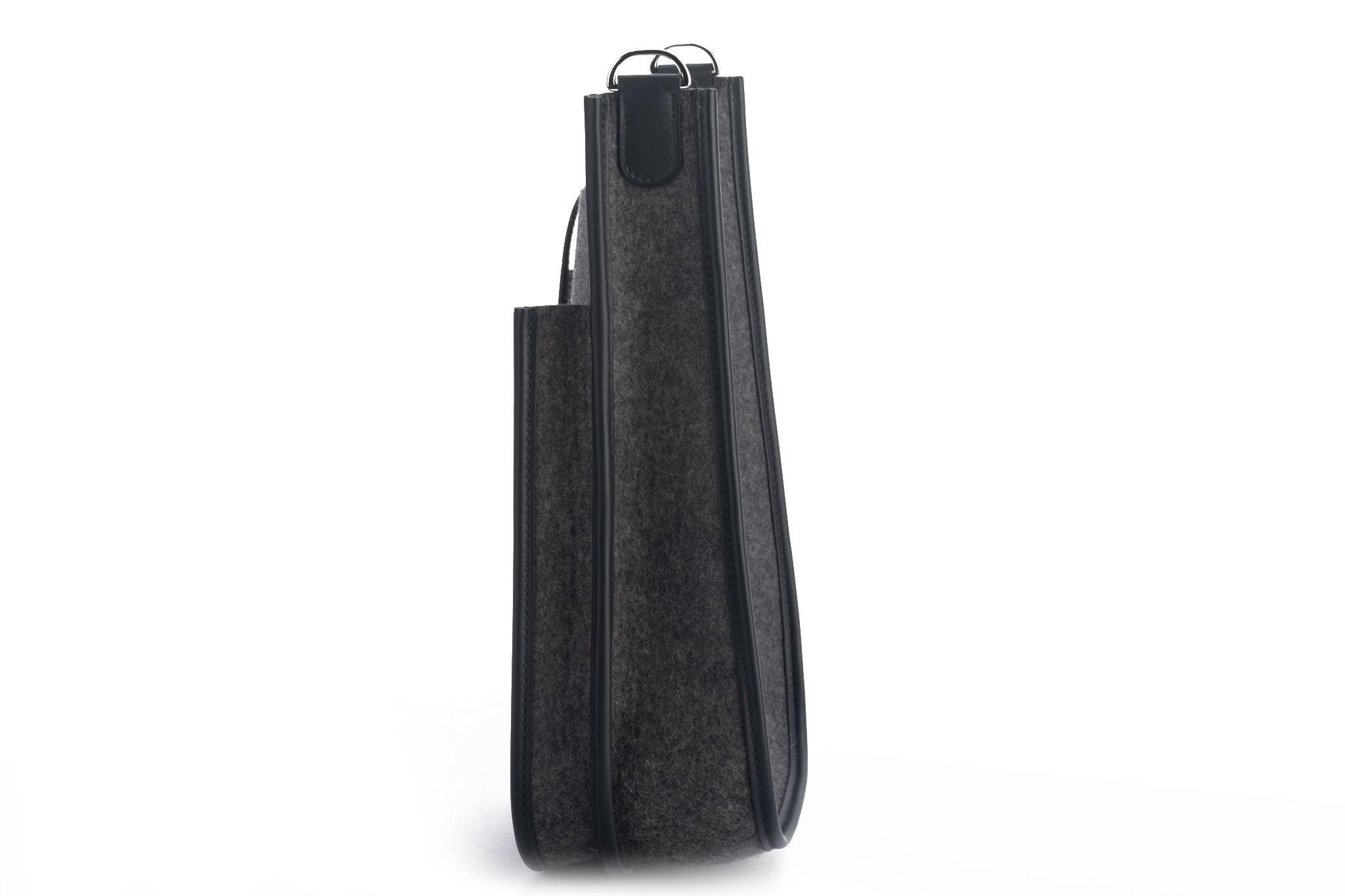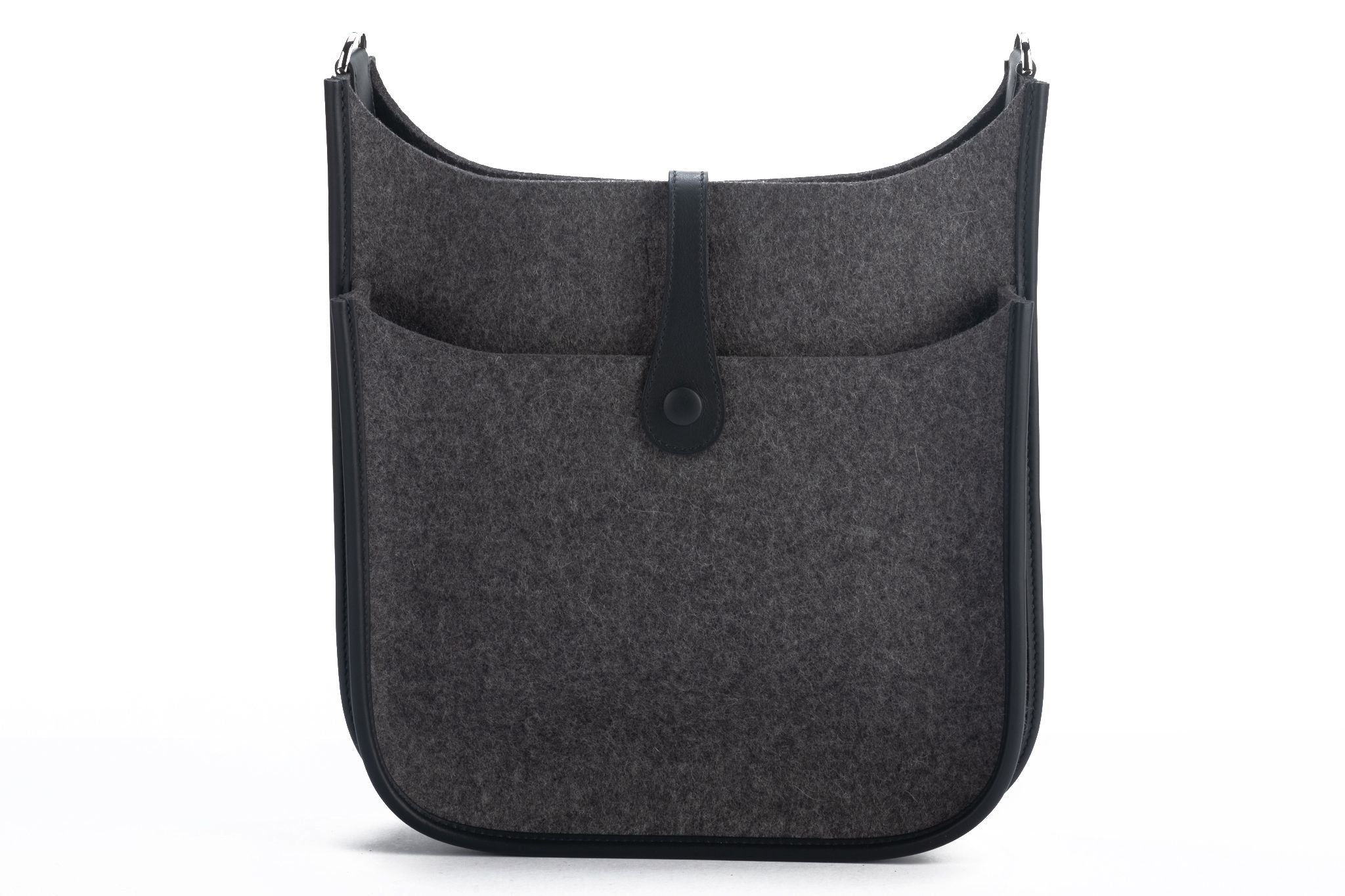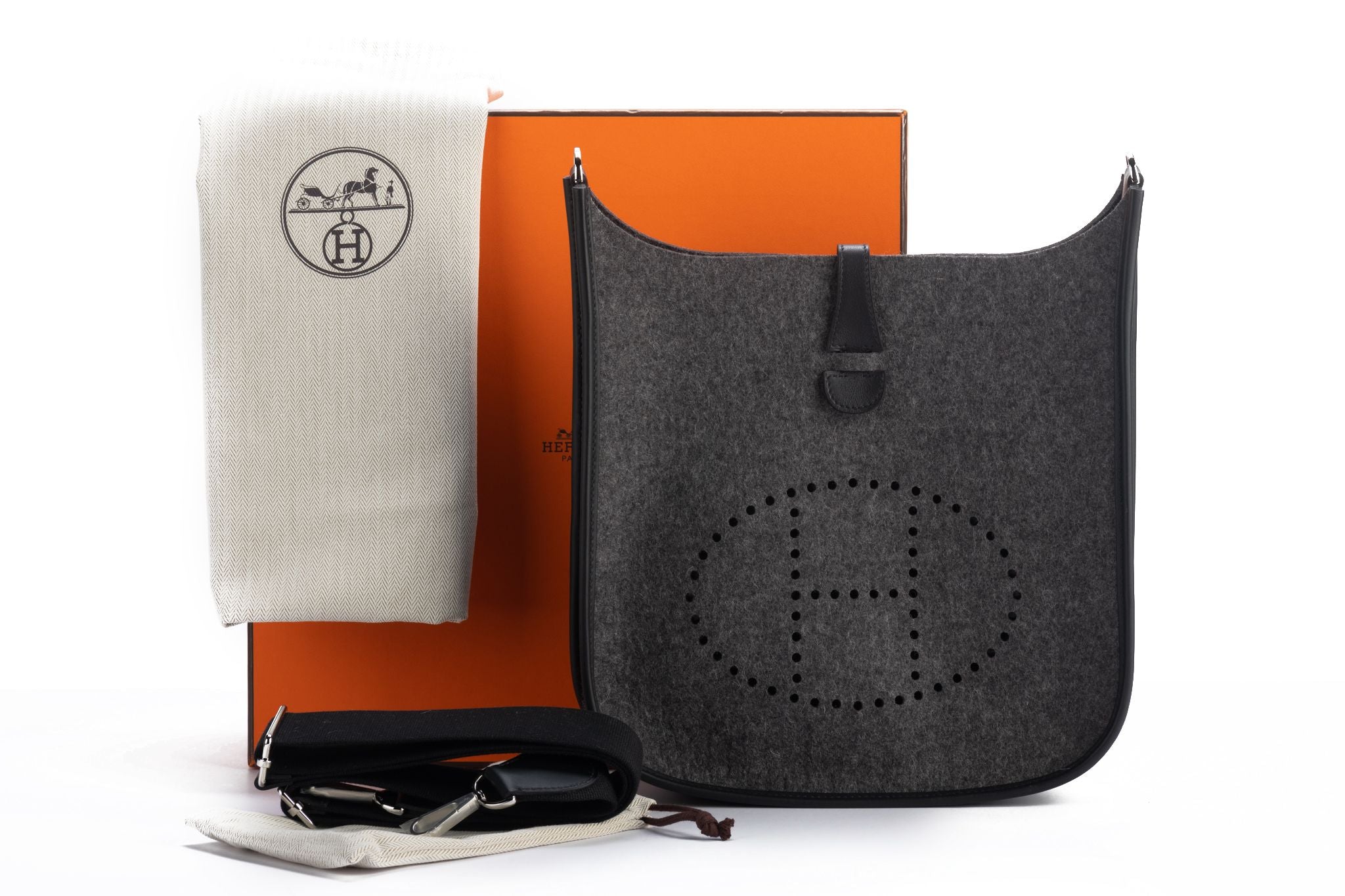 Hermès gray felt and black leather (PM) Evelyne with palladium hardware. Adjustable shoulder strap, can be worn crossbody. Comes with original duster, shoulder strap, box, and ribbon.