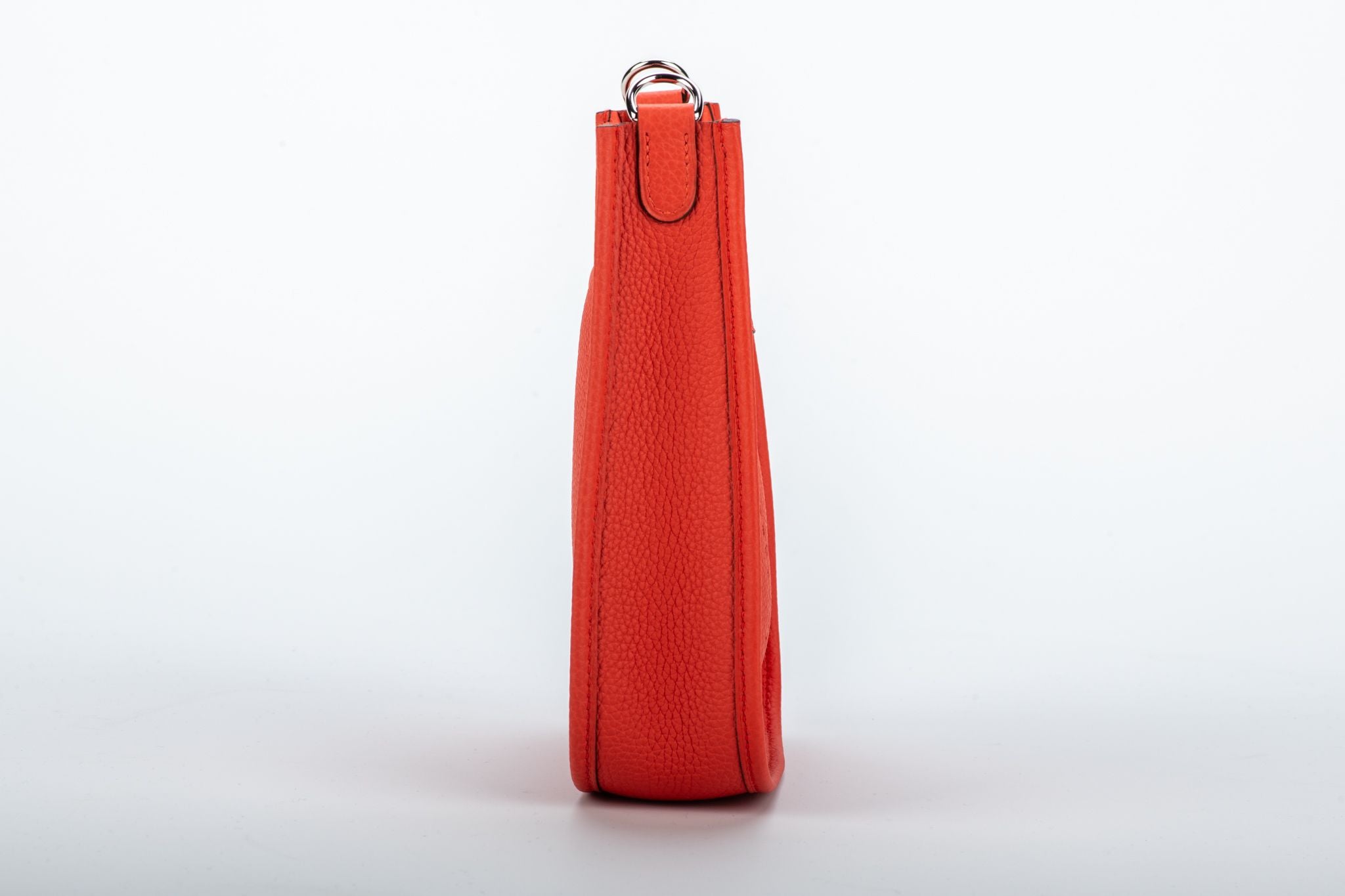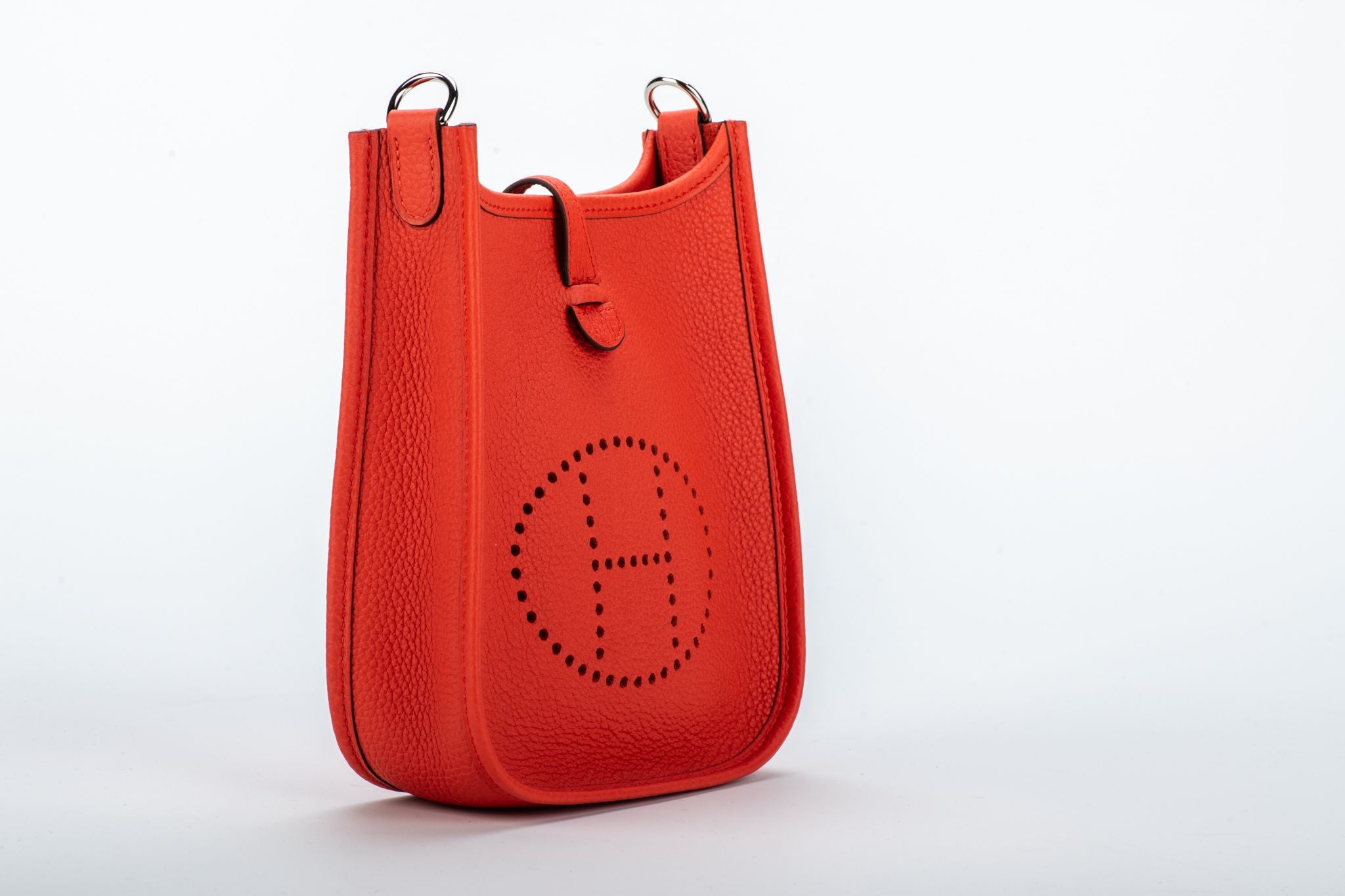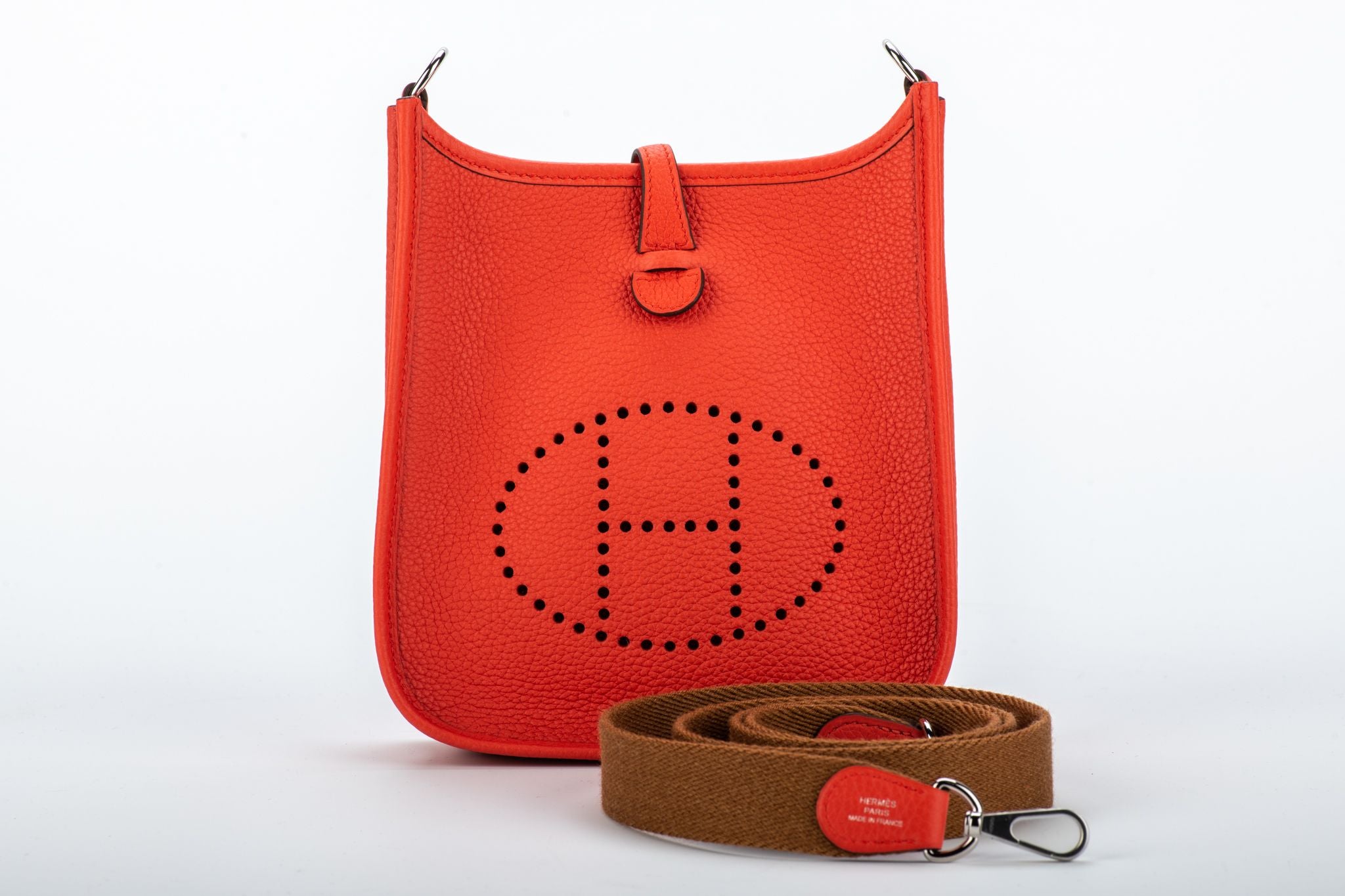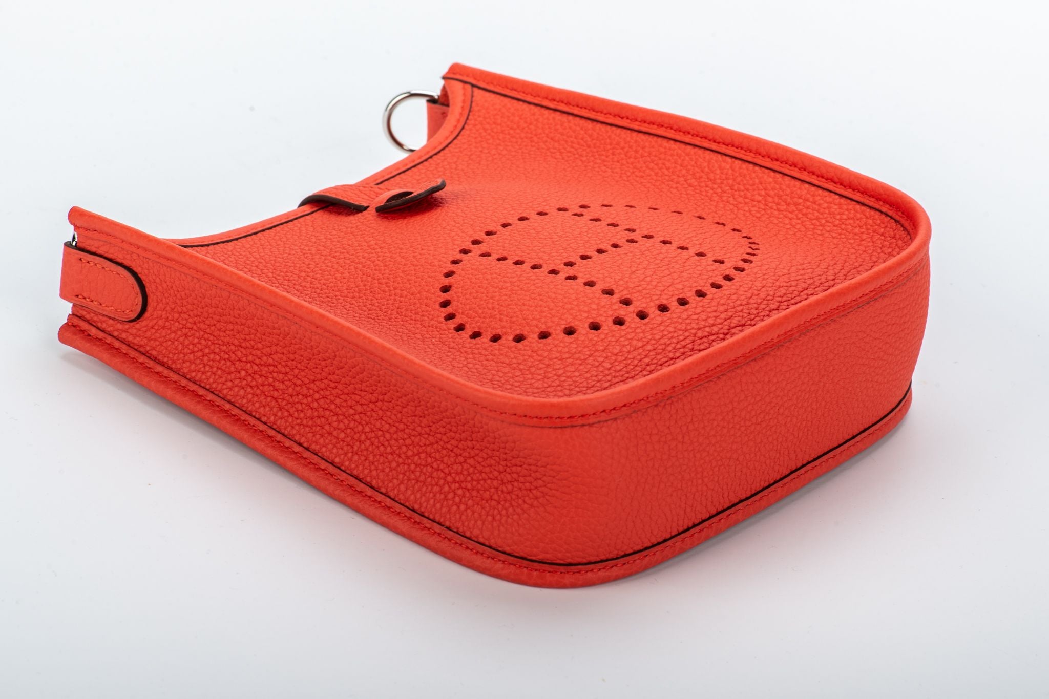 Hermès mini Evelyne shoulder and cross-body bag with signature perforated "H." Capucine taurillon clemence leather , gold strap and palladium hardware. Shoulder strap, 22"L. Ydate stamp, 2021. Comes with original dust bag, booklet and box. Plastic on hardware.