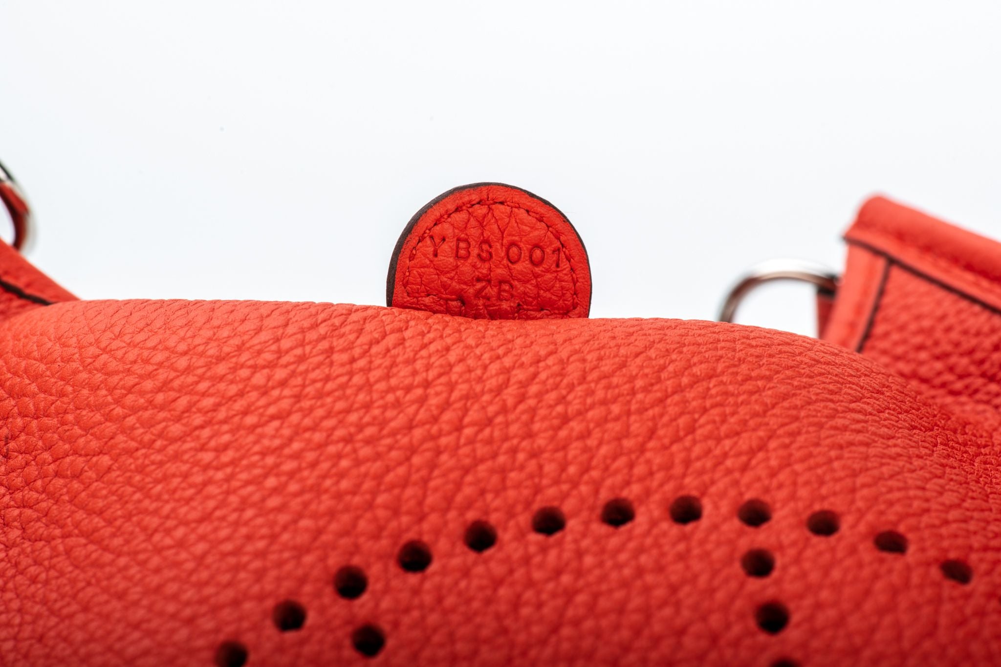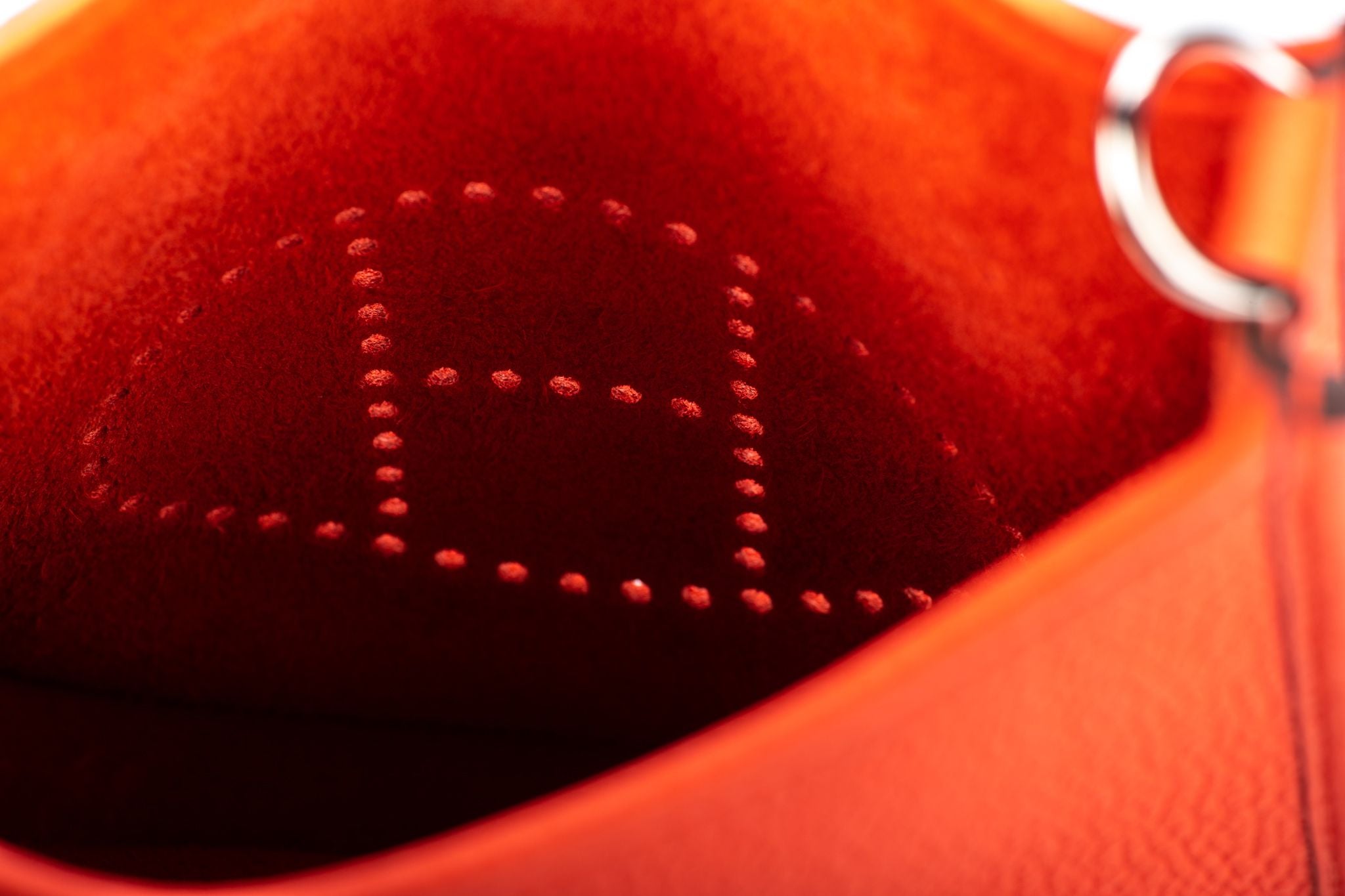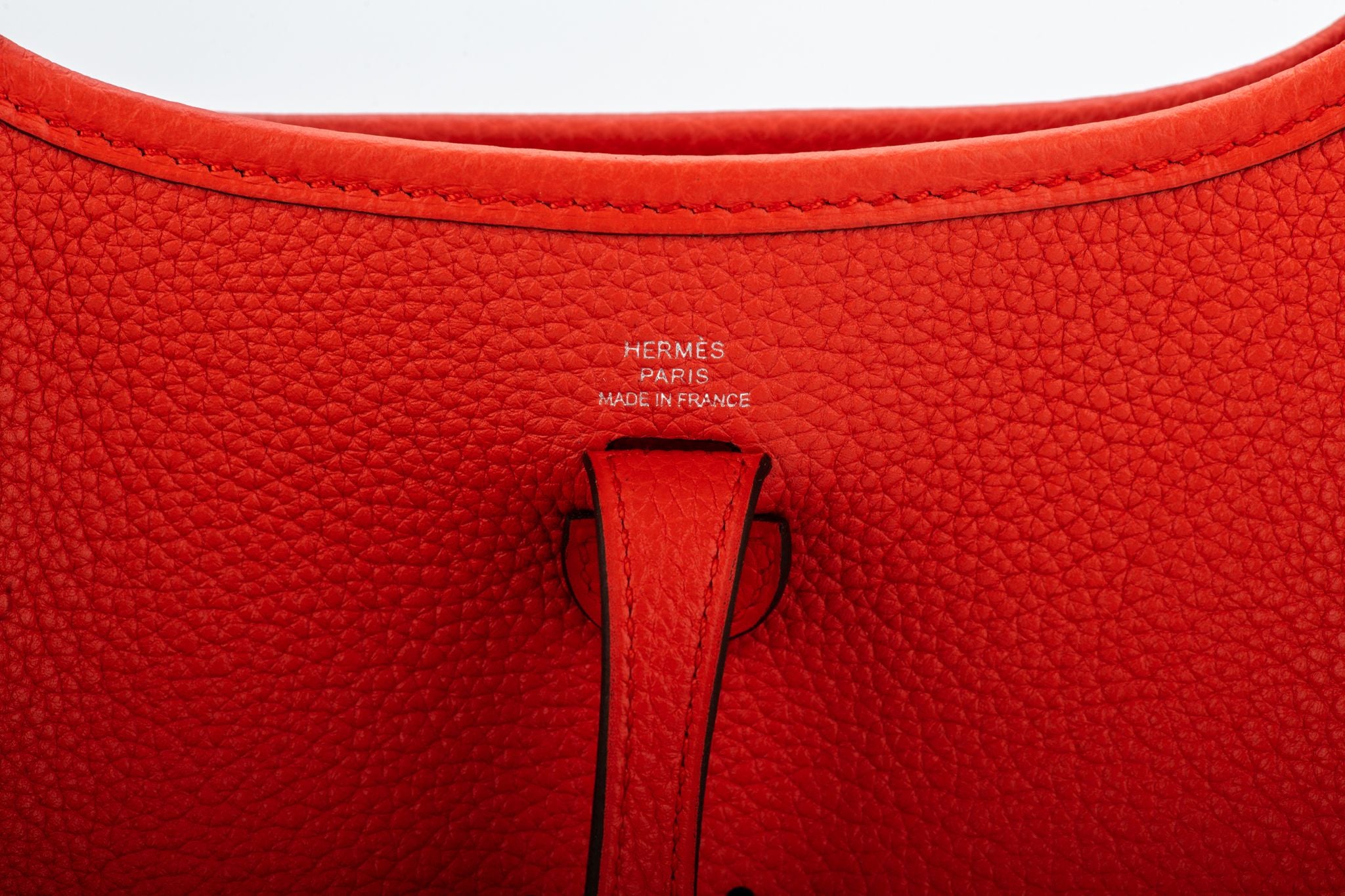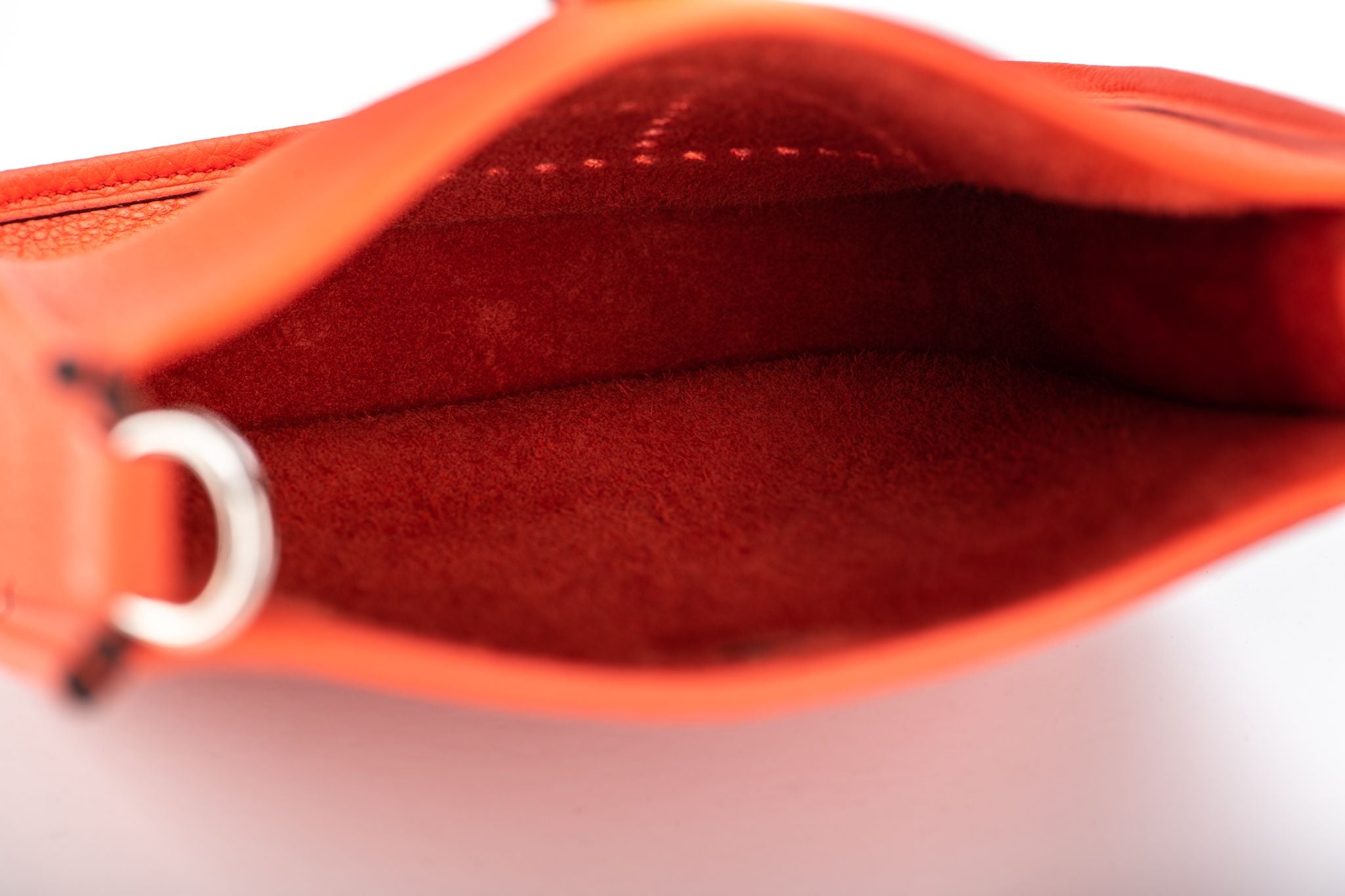 Hermès mini Evelyne shoulder and cross-body bag with signature perforated "H." Capucine taurillon clemence leather , gold strap and palladium hardware. Shoulder strap, 22"L. Ydate stamp, 2021. Comes with original dust bag, booklet and box. Plastic on hardware.