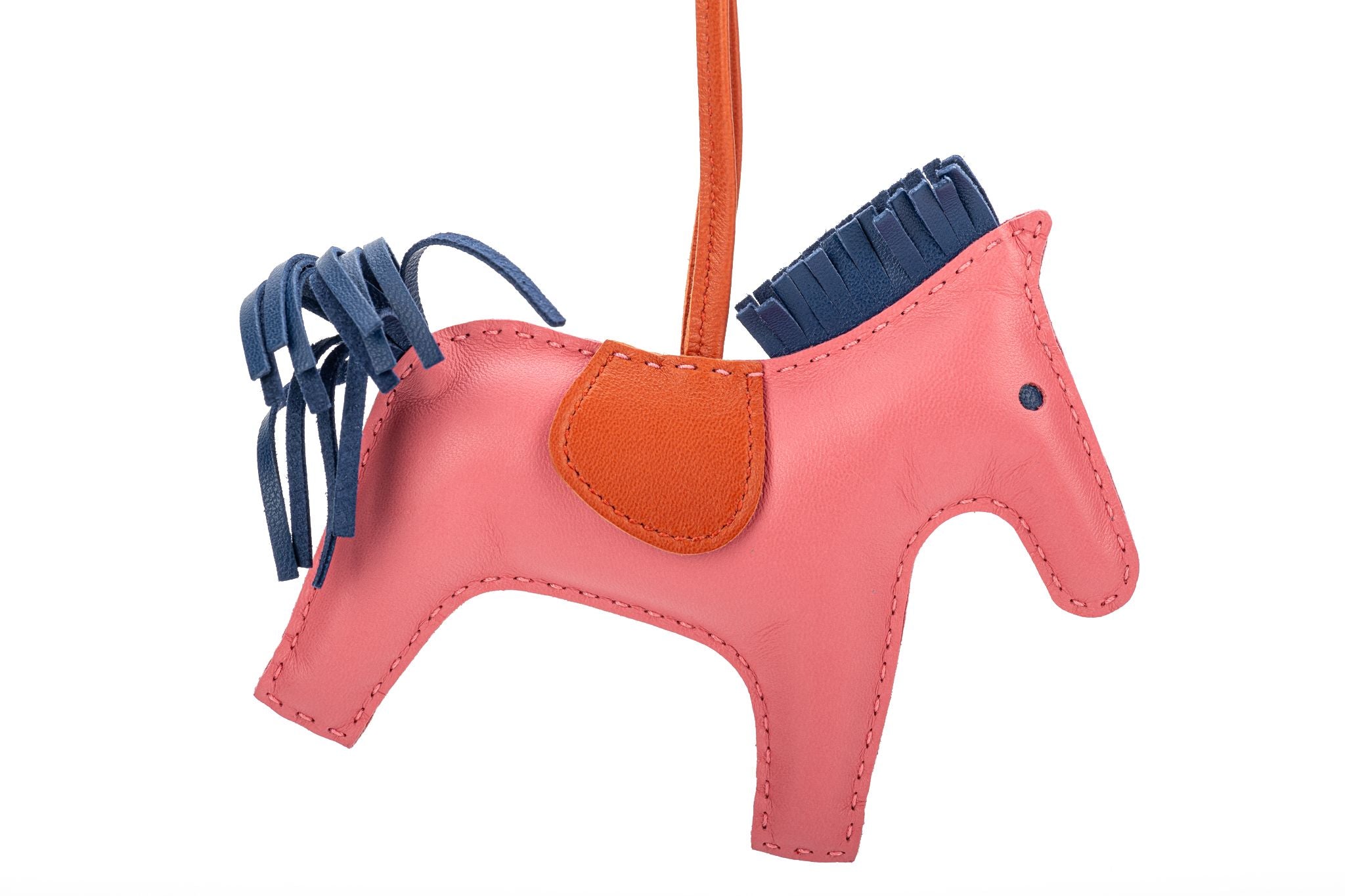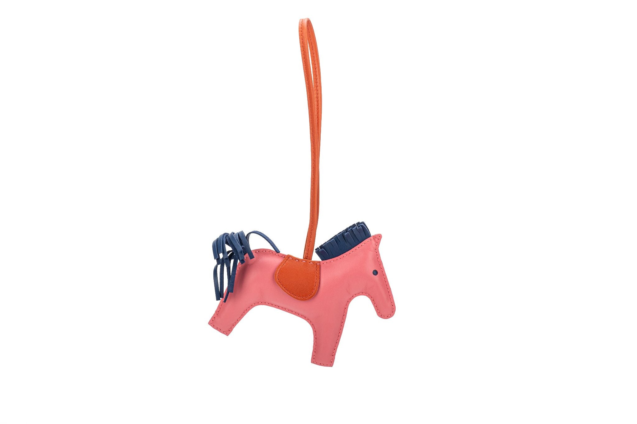 Hermès rare grigri rodeo collection charm in MM size. Rose Azalee/Cornelian/Blue leather. Limited edition with real pony hair tail. Comes with original box and ribbon.