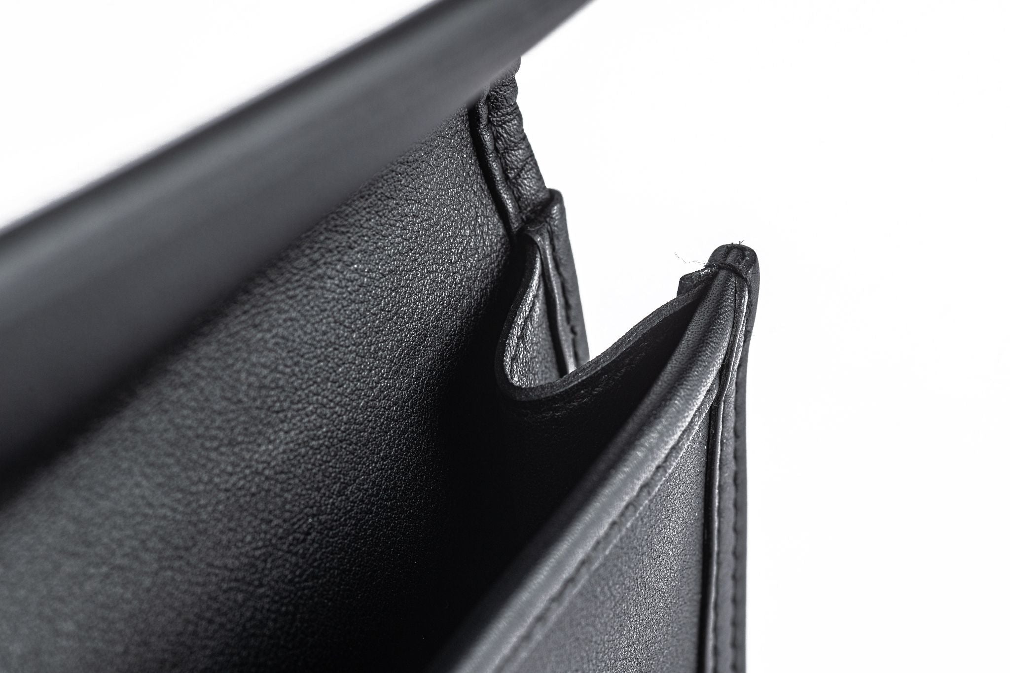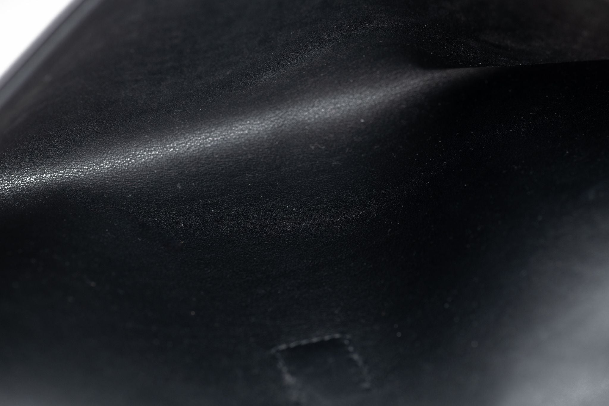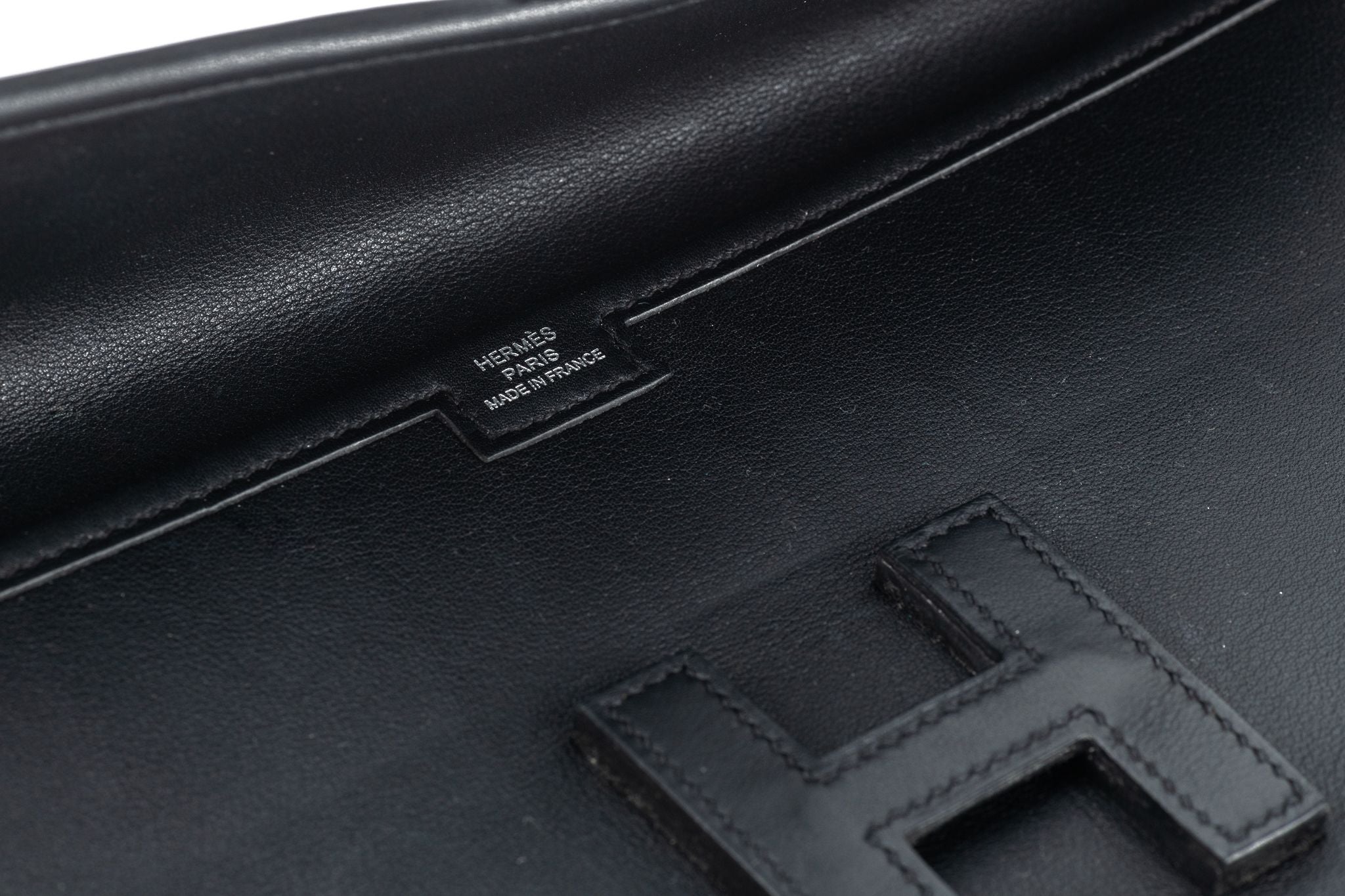 This Hermès Swift Jige Elan 29 Clutch in black features swift calfskin leather in black. It features a cross-over flap with a strap that tucks under a leather Hermes "H." This opens to a black leather interior. Comes with original dust cover.