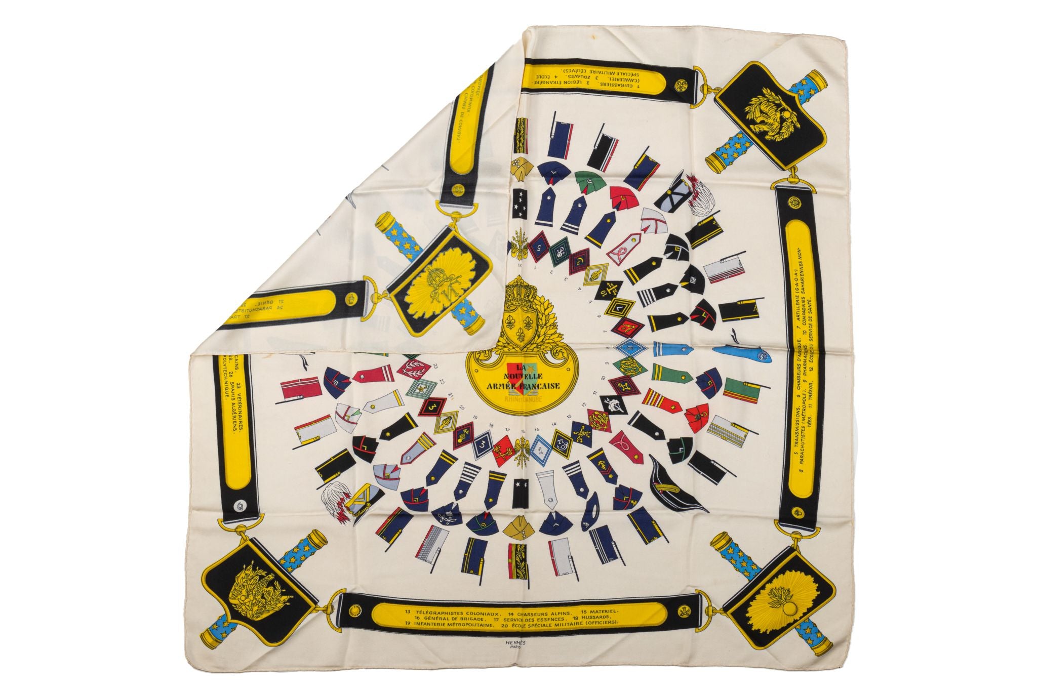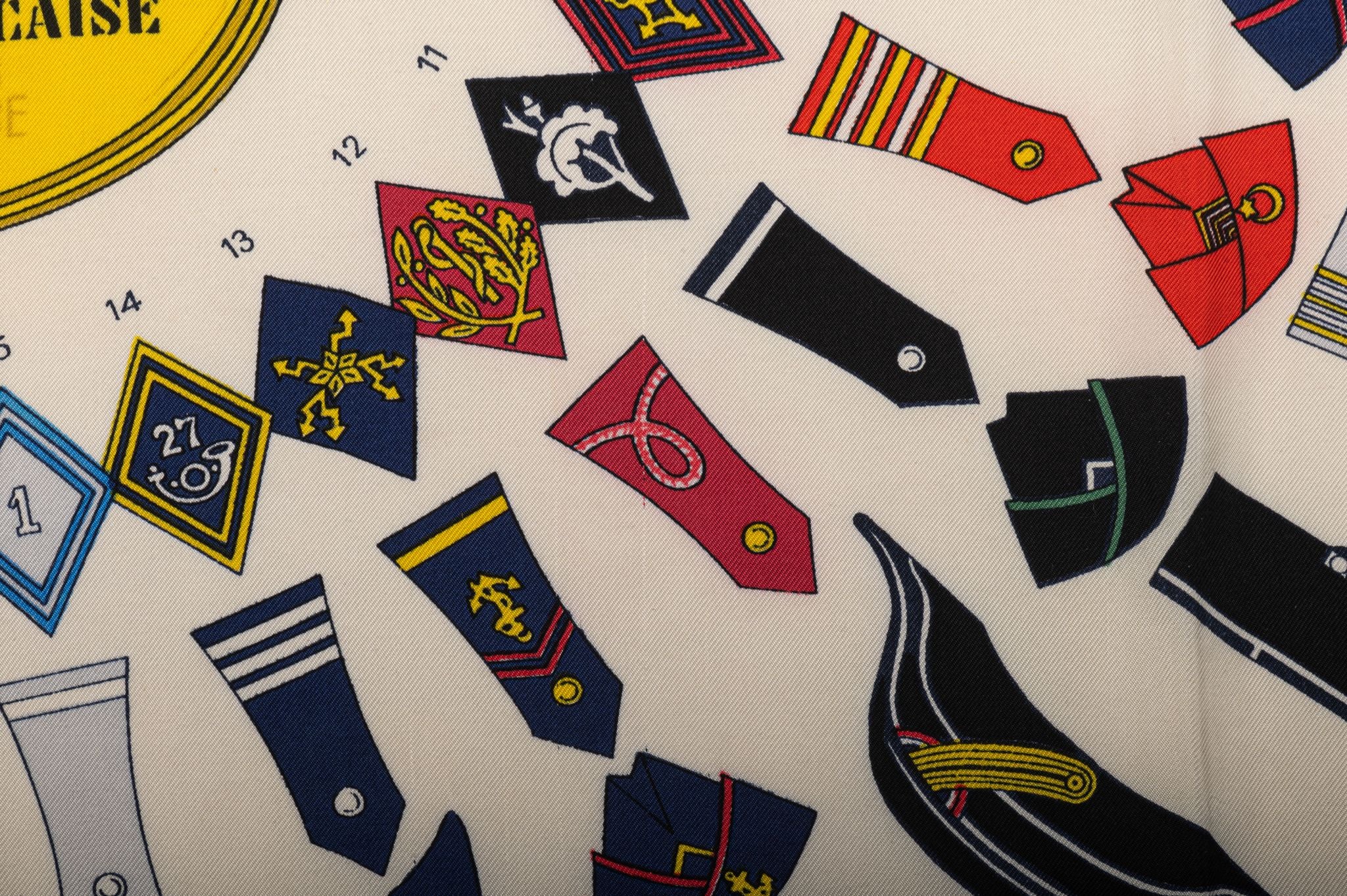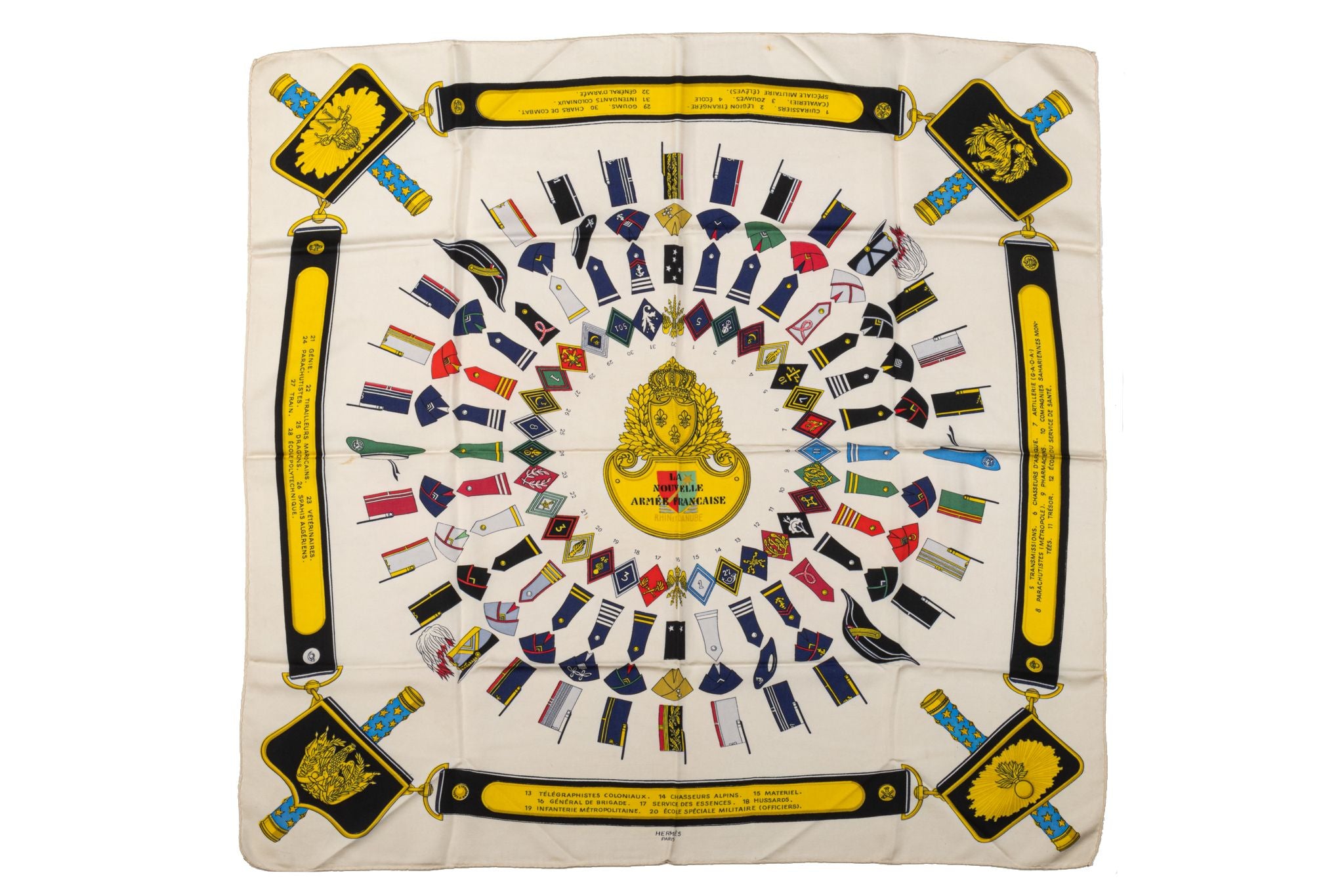 Hermès La Nouvelle Armee Francaise scarf designed by Françoise Heron. Issued in 1949. Cream color with depiction of assorted international crests and army hats. Hand-rolled edges. Dry-clean only. Minor staining, no care tag.