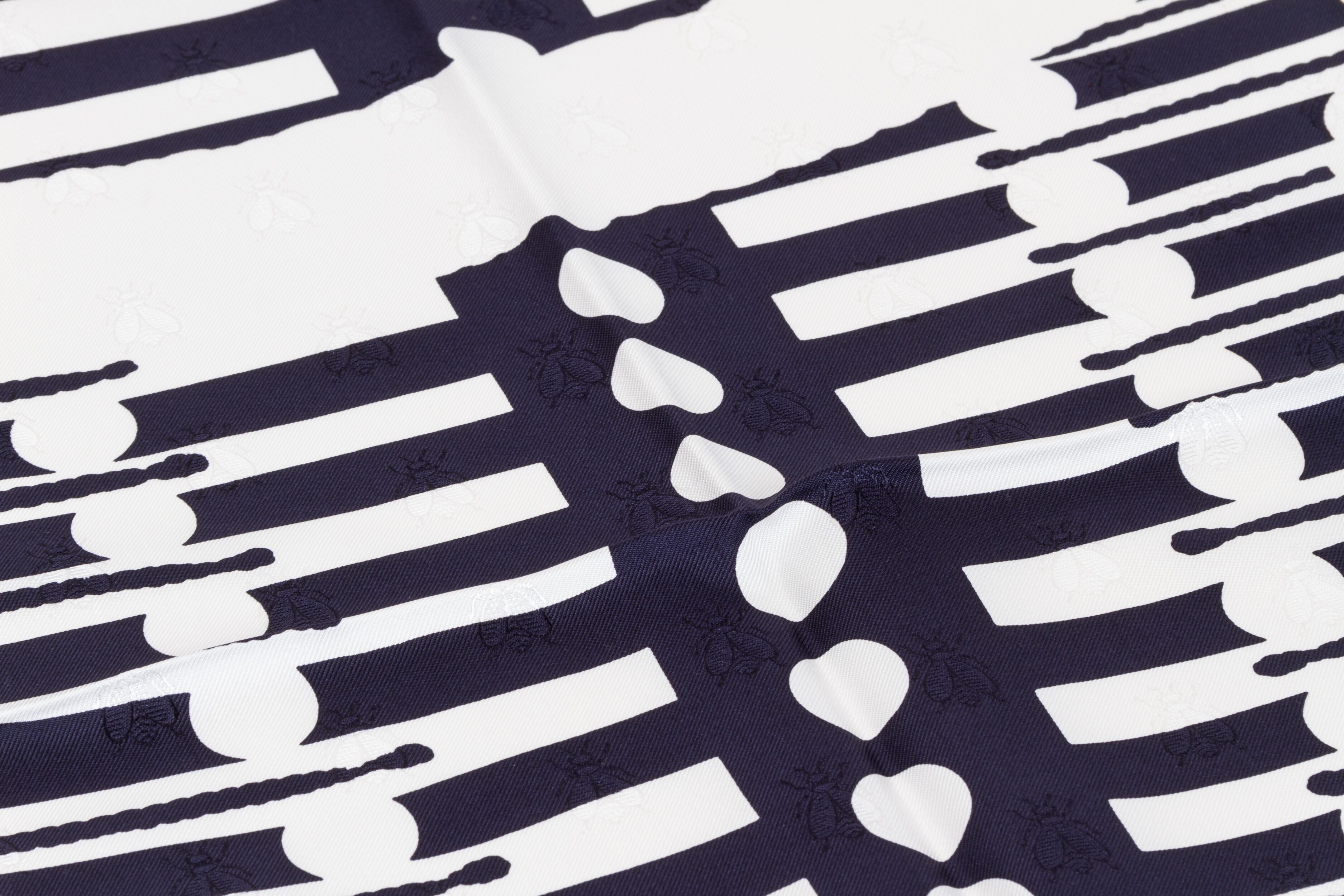 Hermès 35" Brandebourgs silk scarf in blue and white designed by Cathy Latham. Hand-rolled edges. Limited edition with embossed bee pattern. New in the original box.